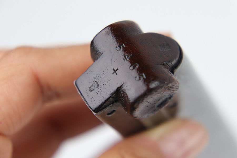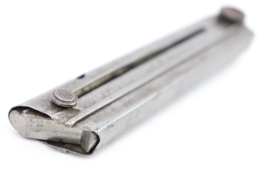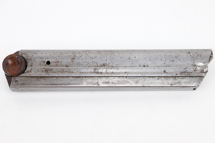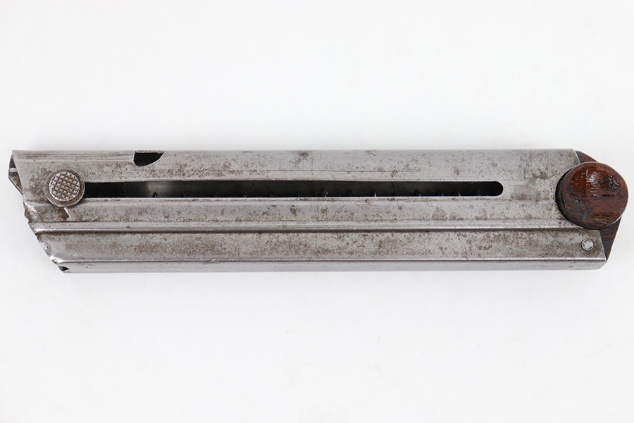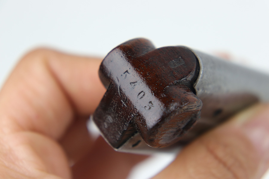 4/11/23 – This is an original WW1 production Imperial Luger magazine. The magazine has a nickel tube and wood base. The base is serial numbered 5403 with a + sign (for the spare magazine), and two Imperial proof stamps. The ears of the magazine (rounded sides) each has small chips in the wood. This doesn’t affect functionality. The tube has surface patina and mild discoloration throughout. The spring is strong and functional.