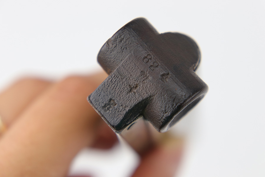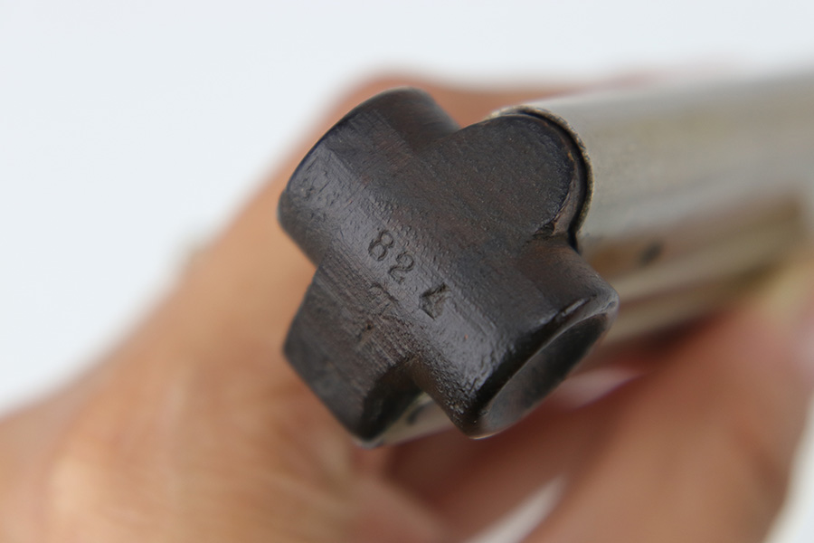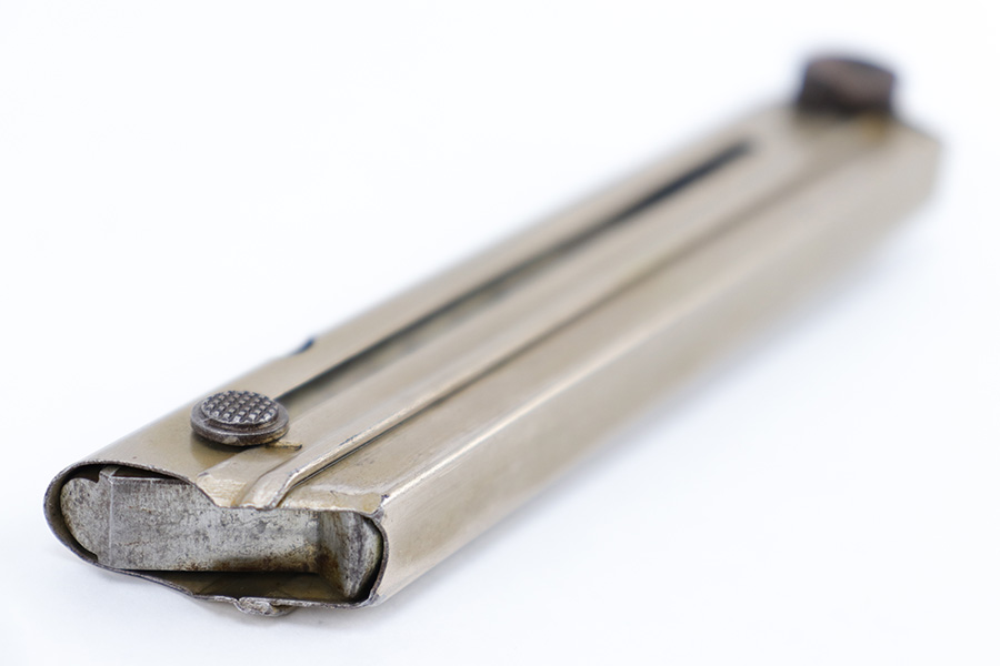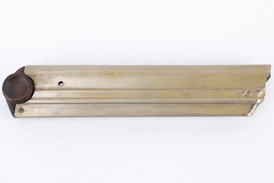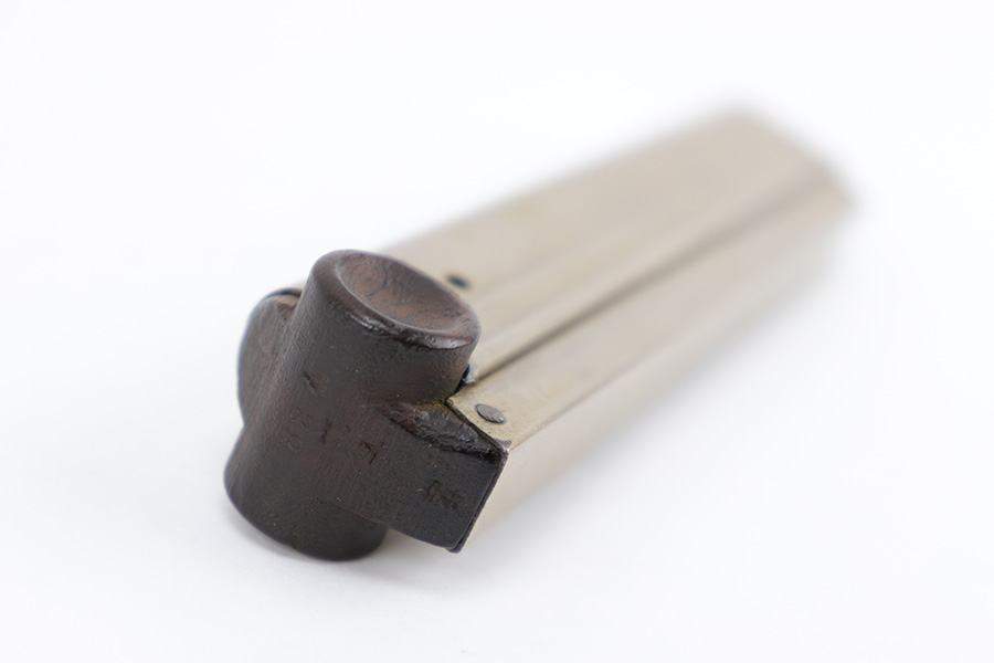 6/27/23 – This is an original WW1 production Imperial German proofed Luger magazine. The magazine features an early nickel tube that’s in minty condition. Very minimal surface patina. The base is wood and is stamped with a legible 3 digit serial number 824m, a plus sign, and an Imperial Military proof stamp. The right “ear” or side of the magazine base has a small chip in the wood. Otherwise the base is near-excellent condition with very nice markings. The spring is strong and fully functional.