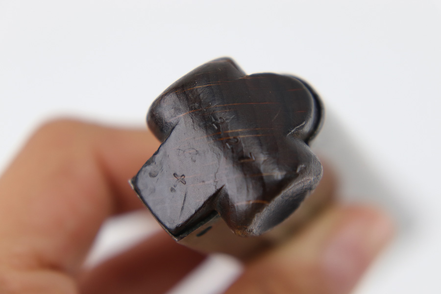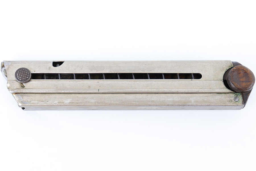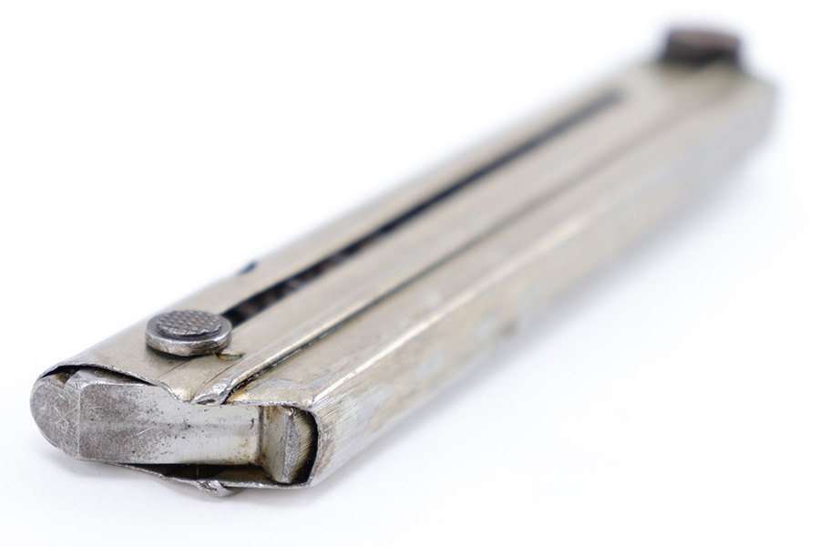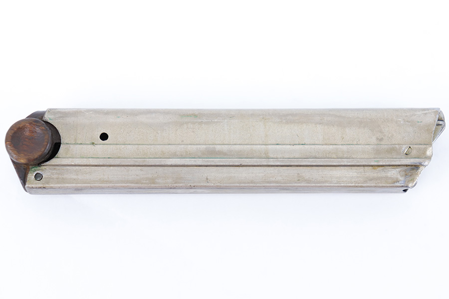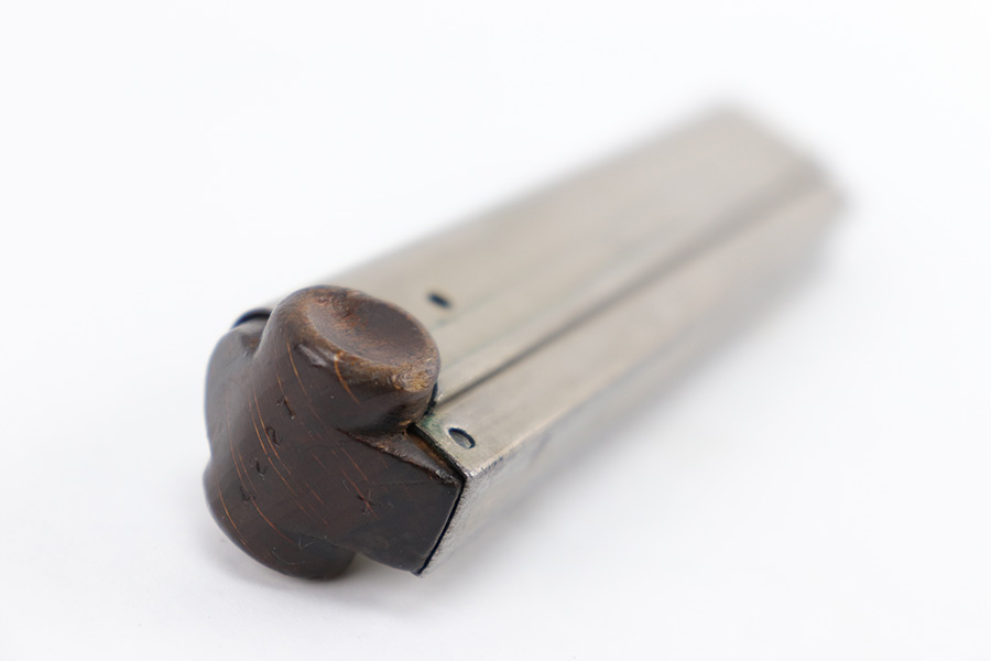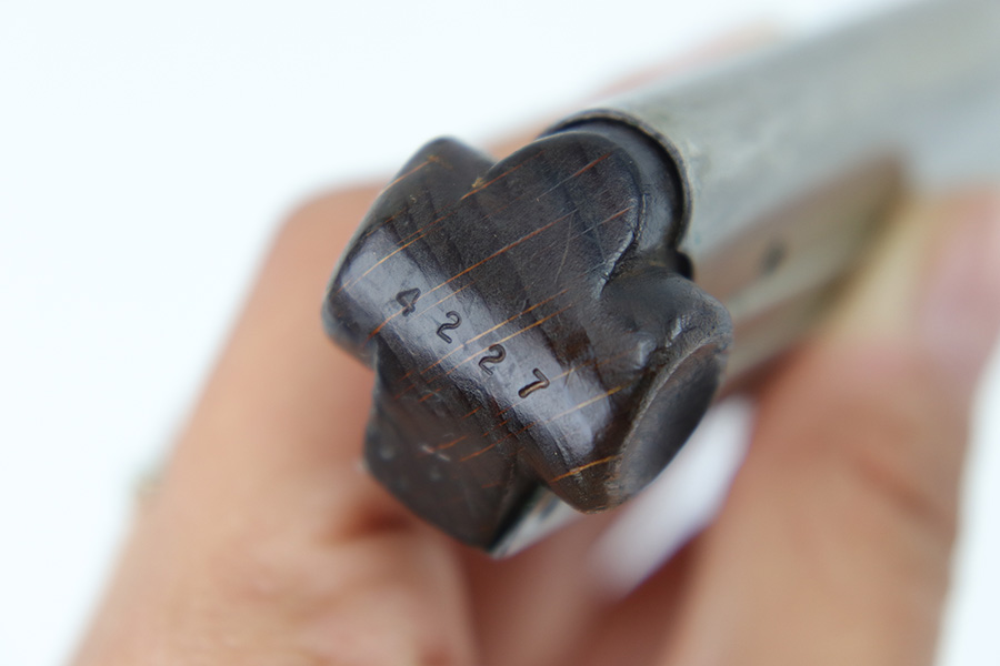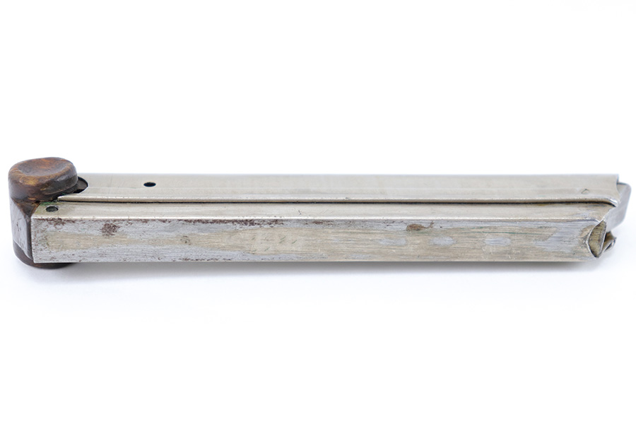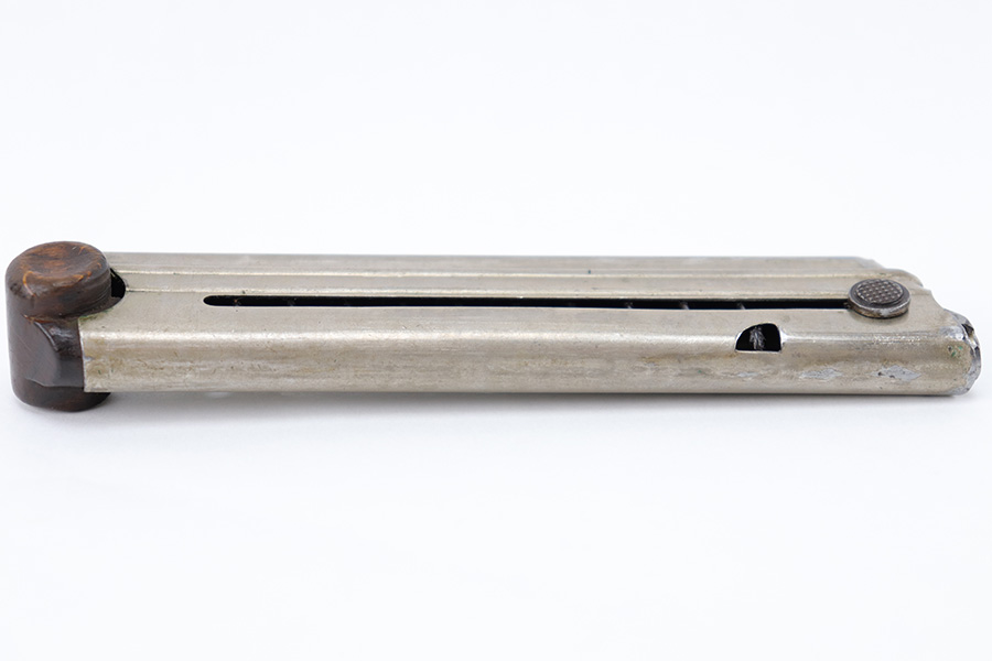 6/29/23 – This is an original WW1 Imperial German Luger magazine. The magazine is in great overall condition, with some mild surface patina and light flaking of the nickel finish on the tube. There are a few small dents in the spine, but this doesn’t affect fit or function. The magazine button appears to have been blued, with mild thinning and patina throughout. This means the button was likely replaced prior to, or during WW2. The wood base has a serial number stamp “4227 b” with a plus sign underneath. The plus sign and letter suffix are faint but still visible. The spring is strong and fully functional.