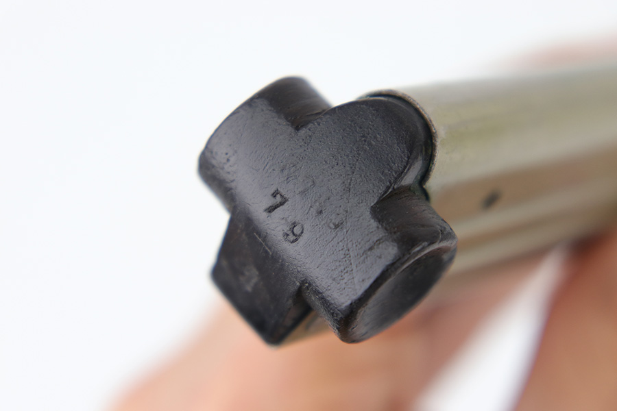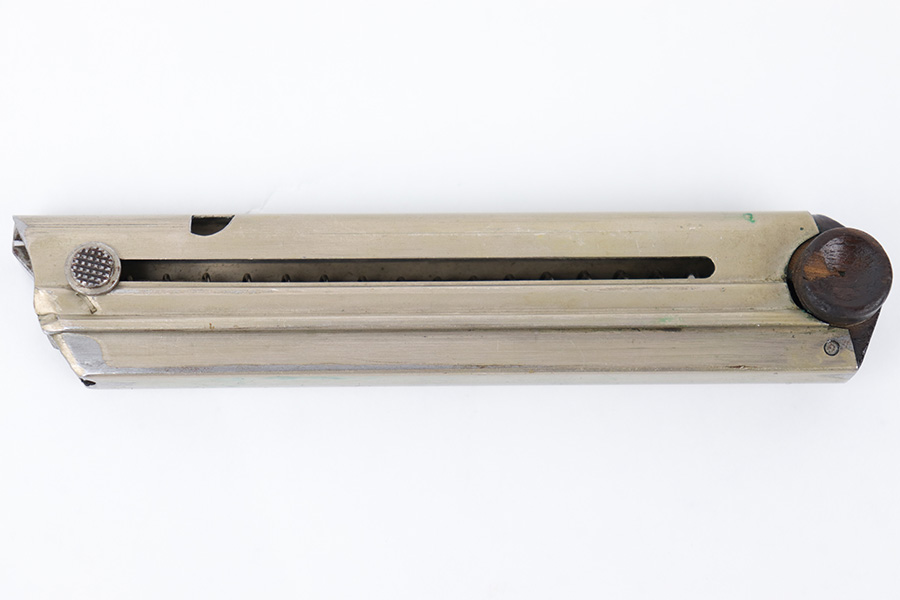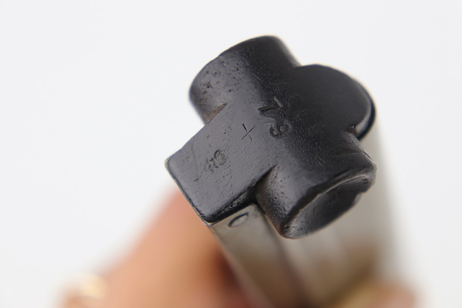 5/8/23 – This is an original WW1 production Imperial Luger magazine. The magazine has an excellent nickeled tube with some very mild surface patina but no major issues. The wood base has a few small chips / dings on the sides or “ears”, but is in great overall condition. Stamped with a 2 digit serial number, + sign, and an Imperial proof stamp.