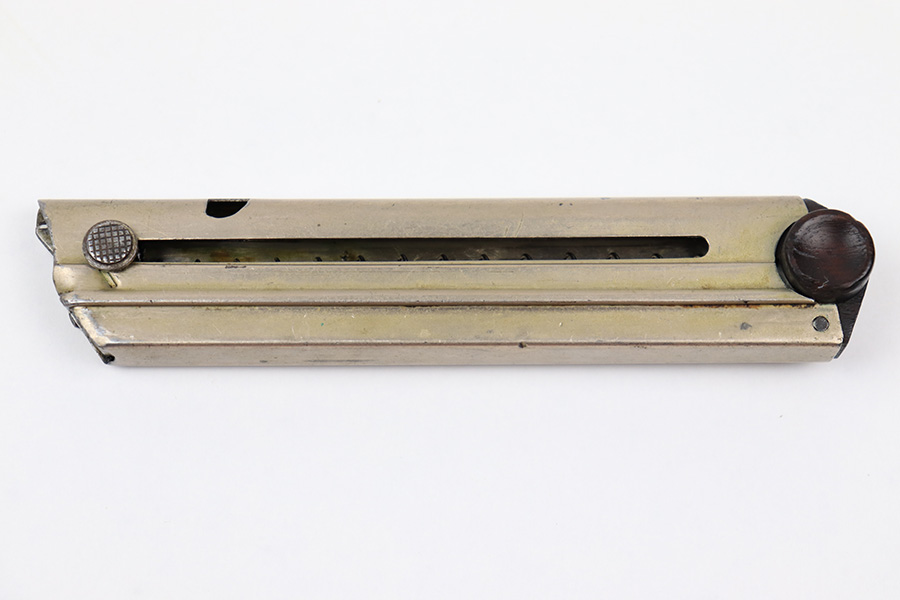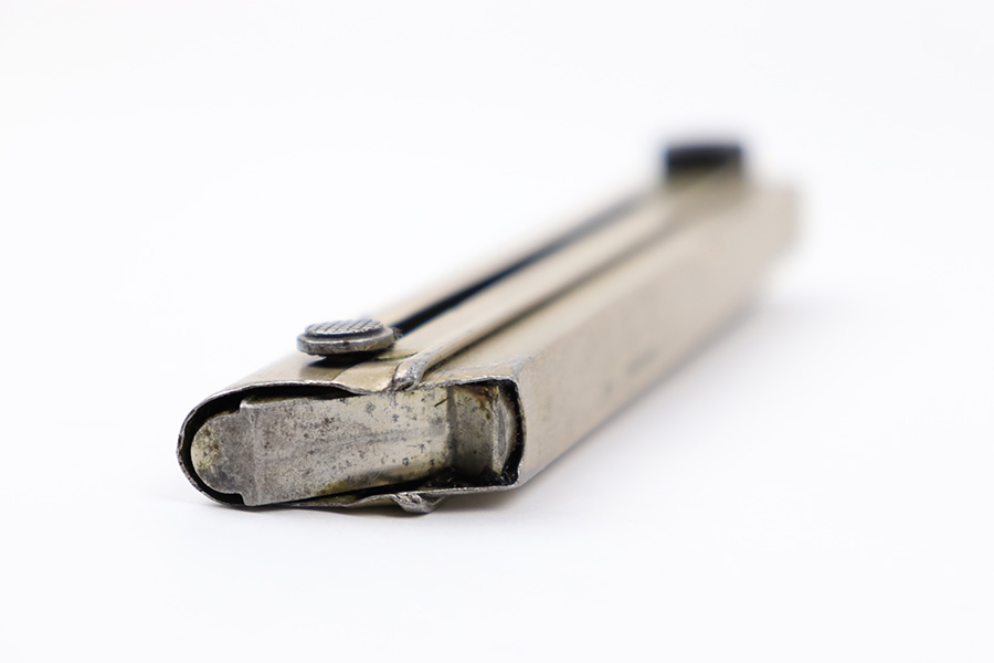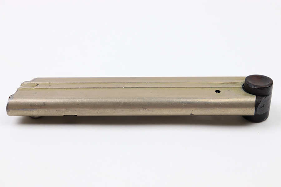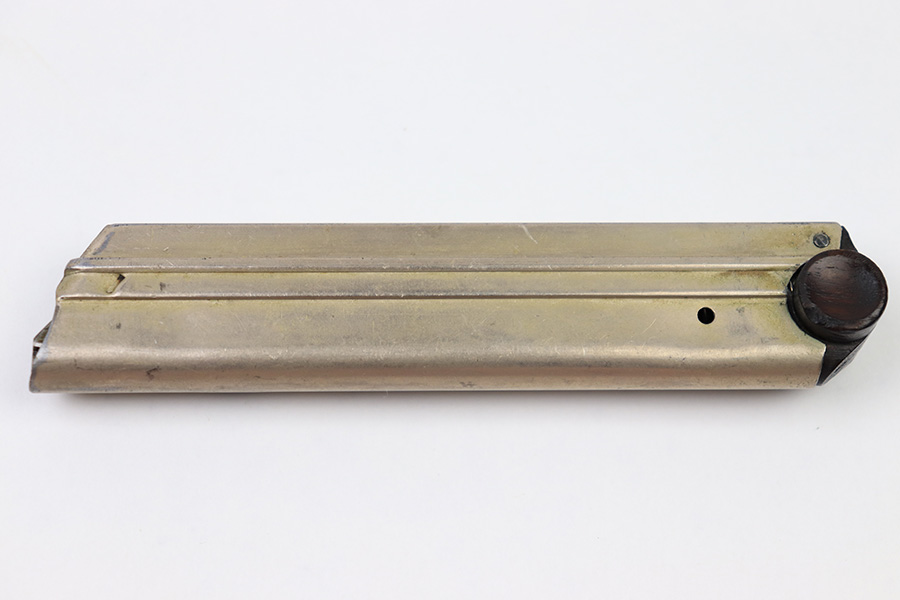 6/23/22 – This is an original WW1 Imperial proofed Luger magazine. The magazine is in excellent overall condition with with a clean tube and a nice wood base. The wood base is serial numbered and proof stamped as shown. The base has no cracks or significant chips, but there are a few small dings on the ears. The tube has no rust or pitting and a functional spring. There’s one small dent in the tube near the base, but this is very minor.