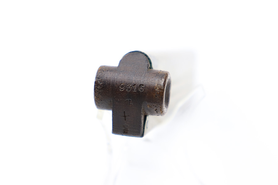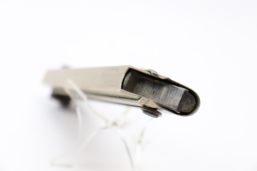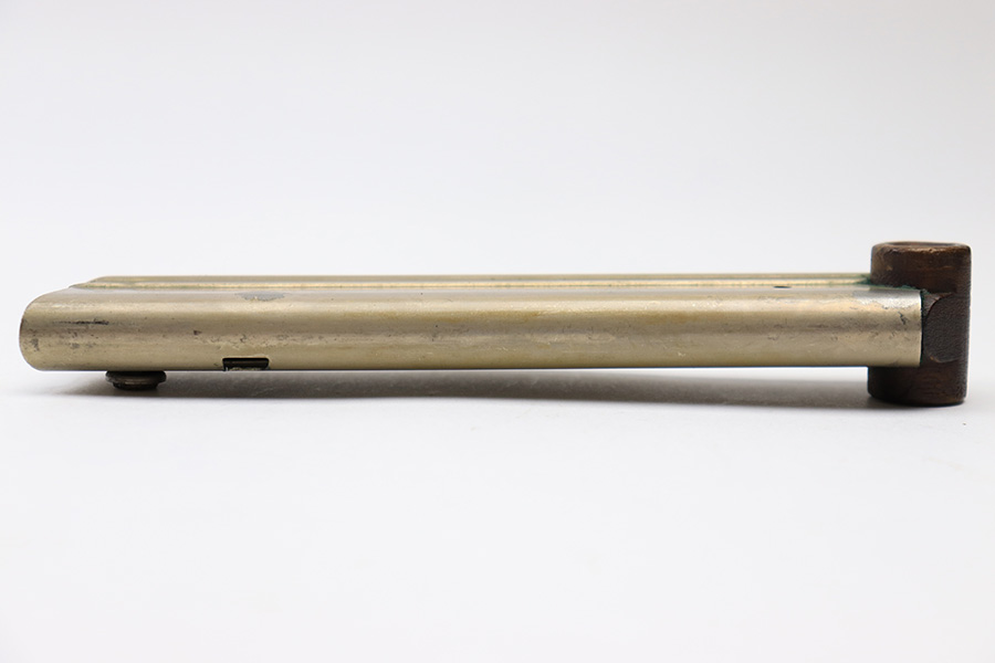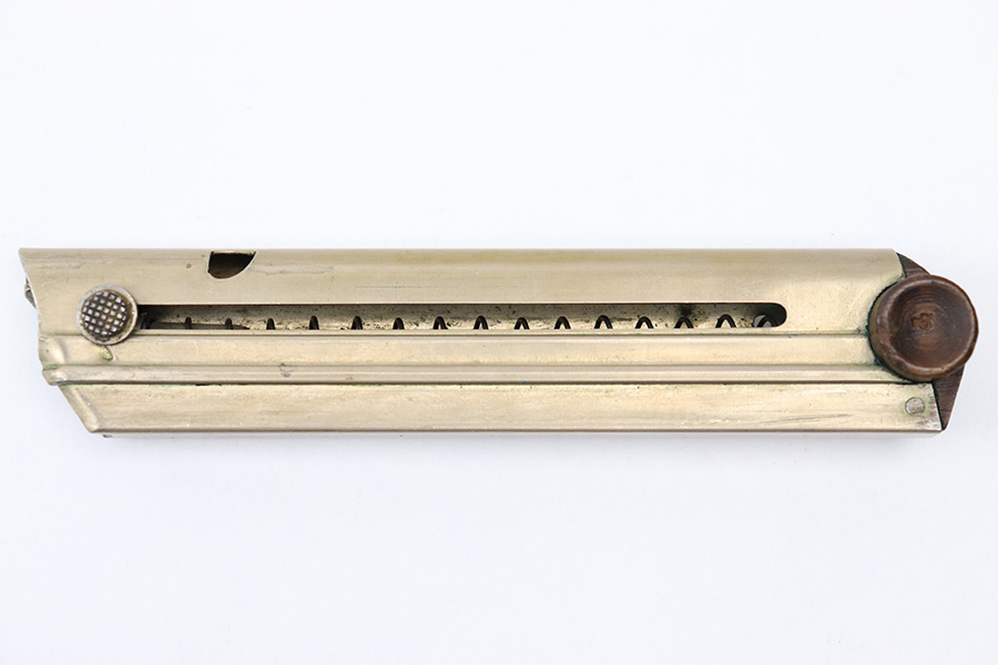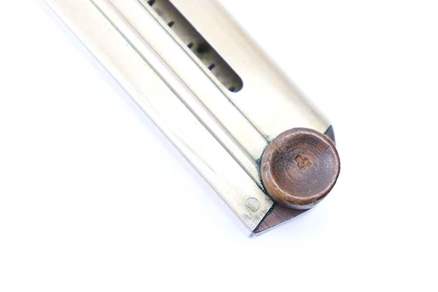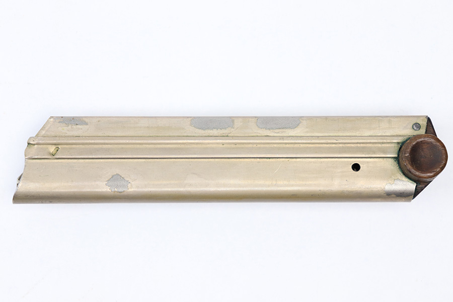 6/23/22 – This is an original WW1 Imperial Luger magazine. The magazine is in great overall condition with a clean tube and wood base. Oddly, one of the ears on the base is stamped with a “&” symbol. We’re not sure the significance. The base is numbered with an Imperial proof stamp. The nickel tube has some mild spots of flaking but this is very mild, and there is no rust or pitting. The spring is strong and fully functional.