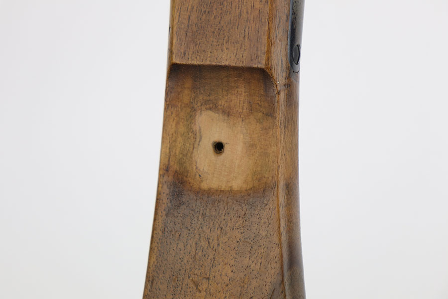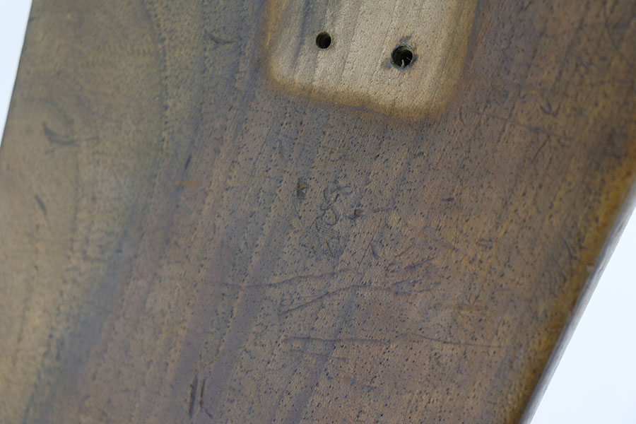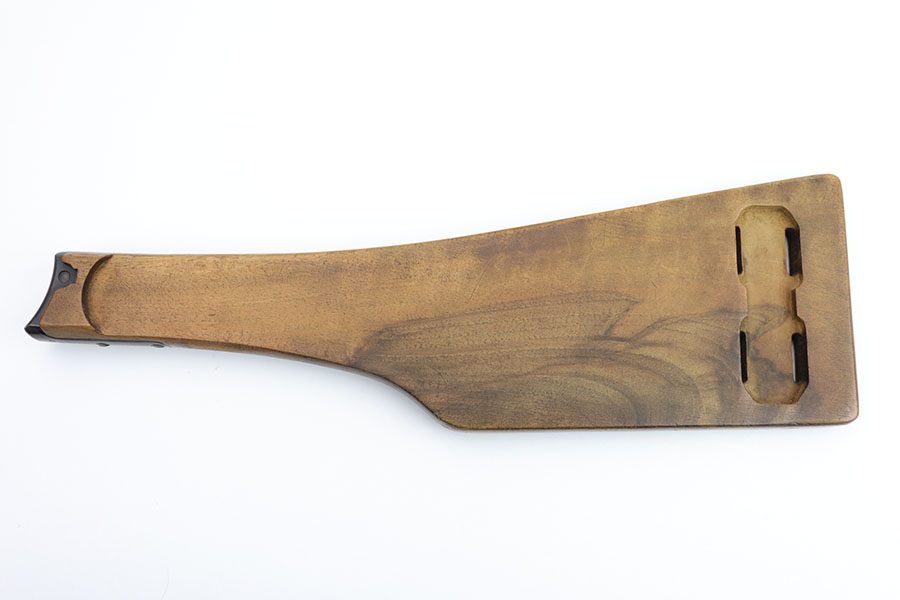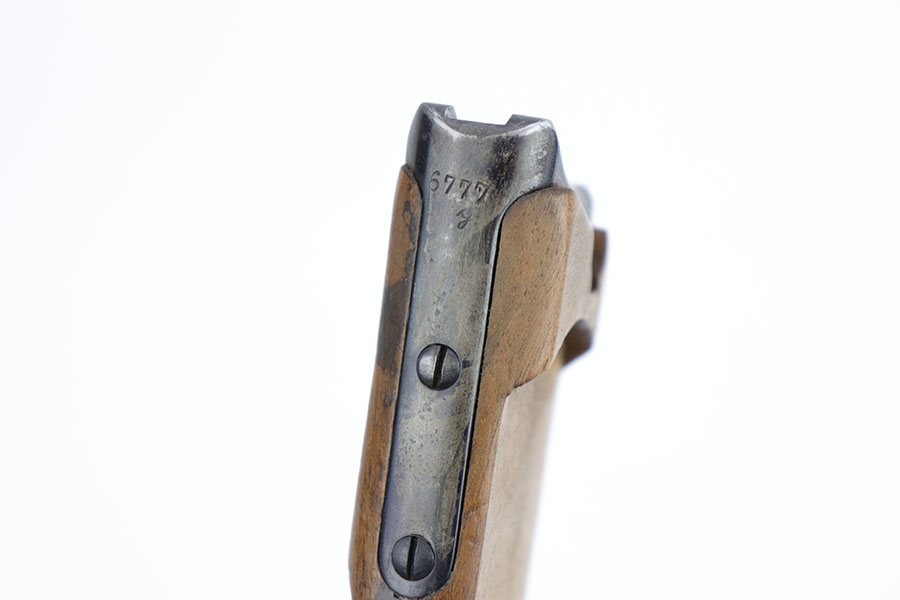 2/5/20 – This is an original WW1 era, Imperial proof stamped Luger wood stock. The stock is numbered on the metal end “6777g”. The imperial proof stamp is under the screw holes on the wood. No cracks or chips, only minor signs of use and aging. There’s some light discoloration on the metal, but no major issues with rust or pitting. An excellent overall piece from WW1.