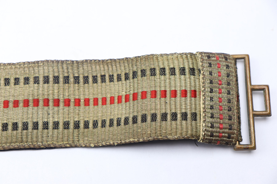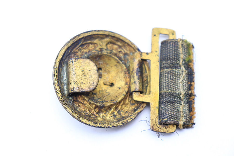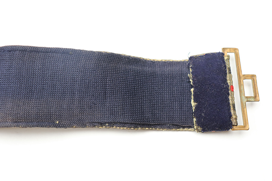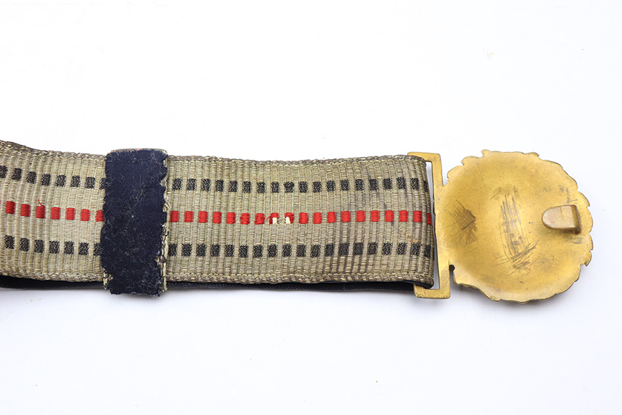 4/13/22 – This is an original WW1 Imperial Navy belt buckle with an attached brocade style belt. Also included is a smaller version of the same buckle, but with only a piece of the brocade belt attached. The larger buckle is in great condition with some mild surface patina and finish loss at the high points and edges of the buckle. The reverse has some surface scratching, but no markings or stamps. The belt shows light aging throughout and mild staining but no fraying issues or structural issues. The larger buckle is about 2.5 inches in diameter. The smaller buckle has significantly more dark discoloration throughout, and measures about 1.75 inches in diameter.