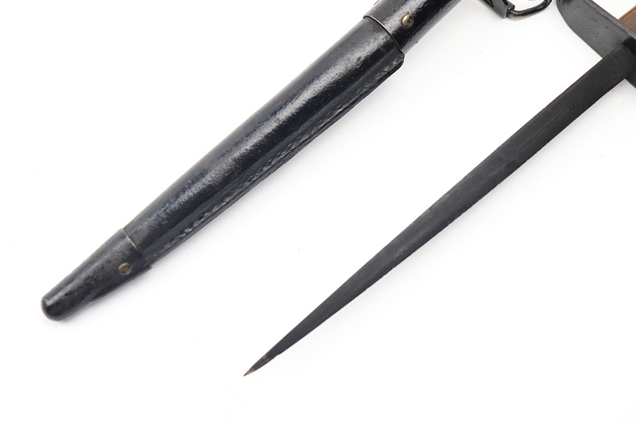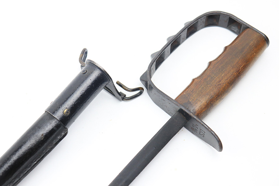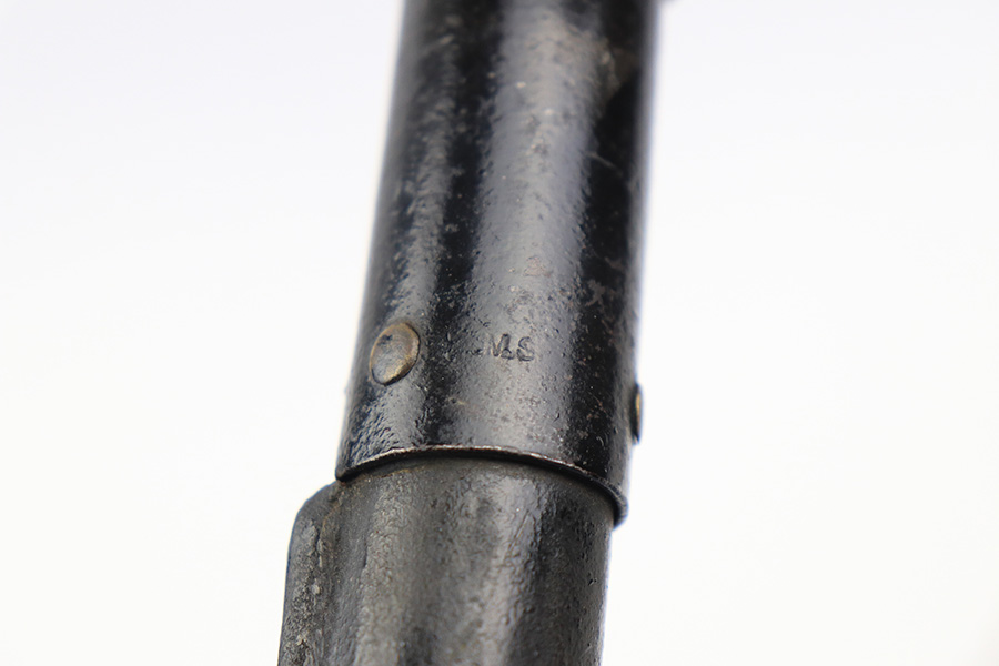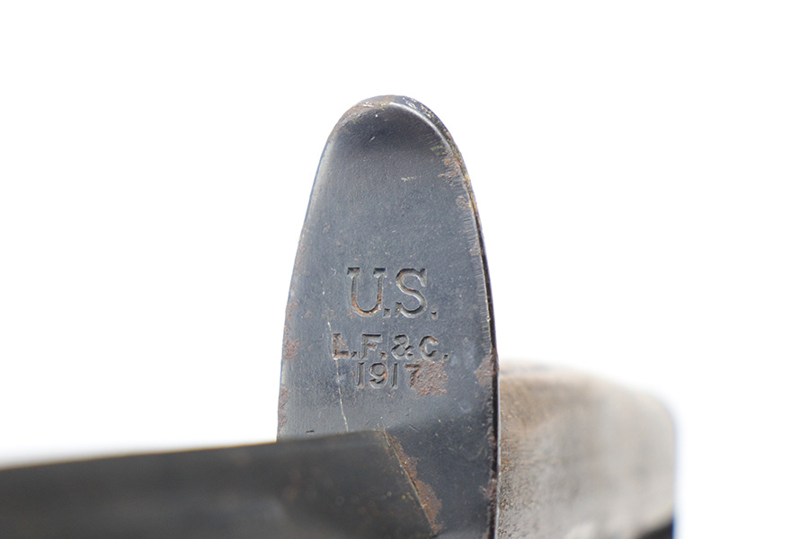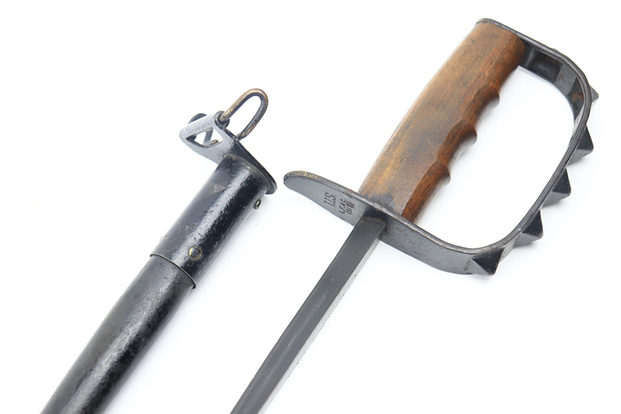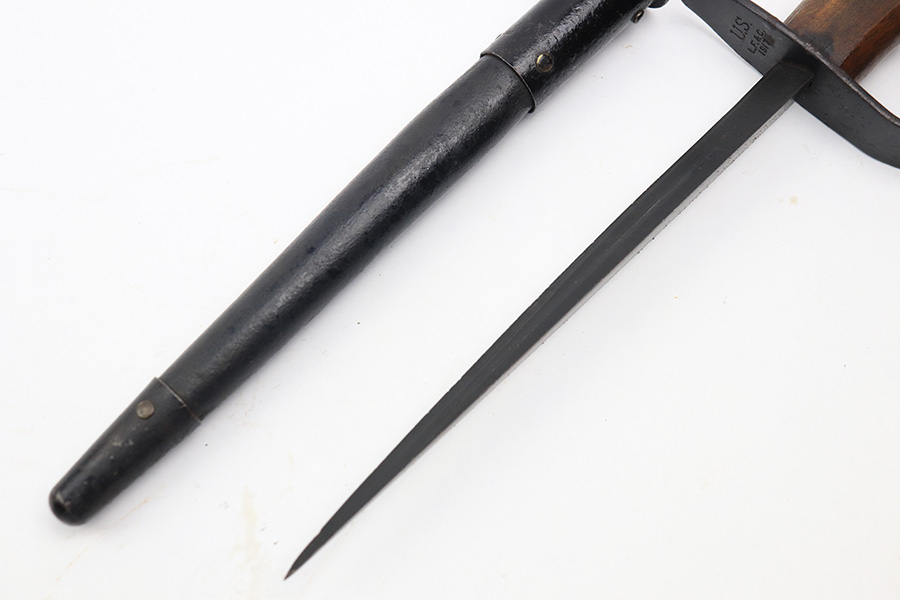 1/4/22 – This is an original WW1 era US trench fighting knife with scabbard. The scabbard has been painted black, but is an original and period correct piece. There is a faint remnant of the Jewell 1918 maker stamp on the scabbard. Metal fittings are in tact. The blade is in great shape as well with very nice bluing throughout and minimal discoloration. The wood handle has no chips or major issues. The hand guard has surface rust and patina throughout.