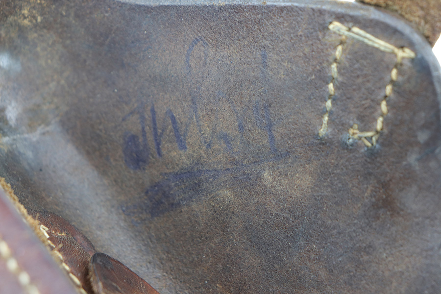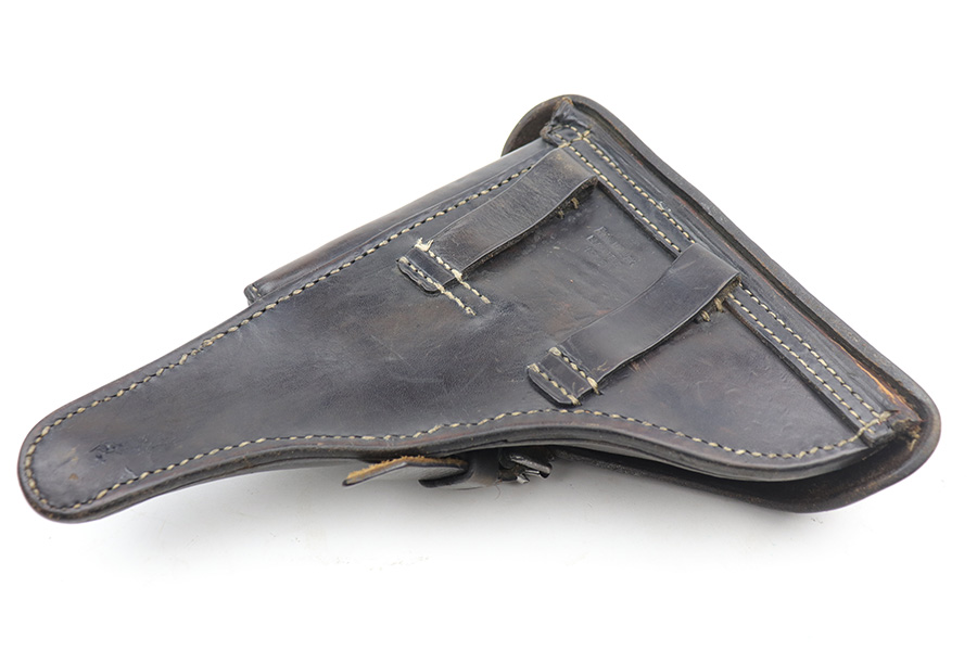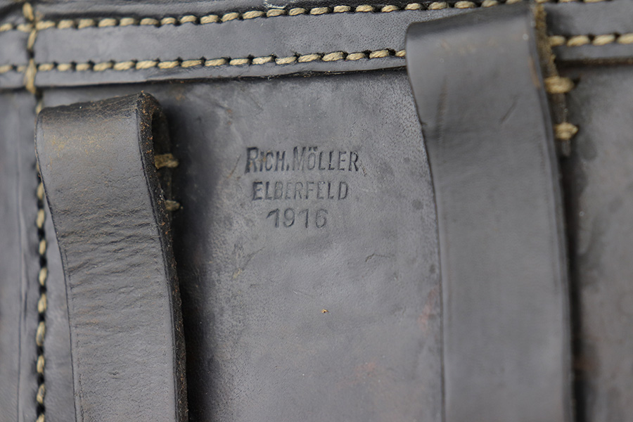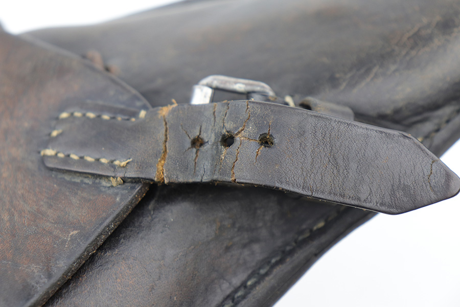10/18/21 – This is an original WW1 production Luger holster. The back leather is dated 1916 with a maker stamp by Rich. Moller. The leather is in great condition despite some surface cracking on the closure strap. There are a few loose stitches on the top leather, but this is mild and the majority of the stitching is in great shape. Considering the holsters’ age, this is a high-end example. The leather is pliable with surface wrinkling throughout but is completely in tact.