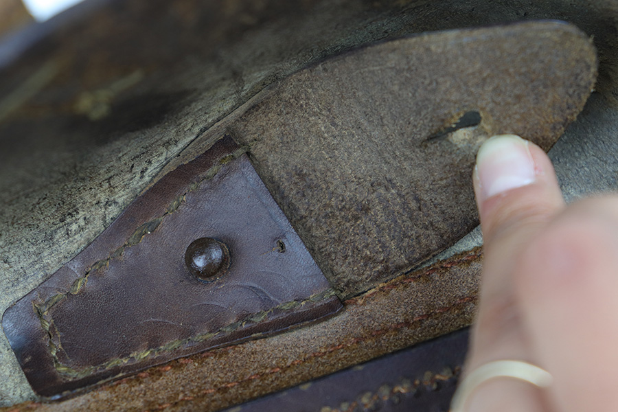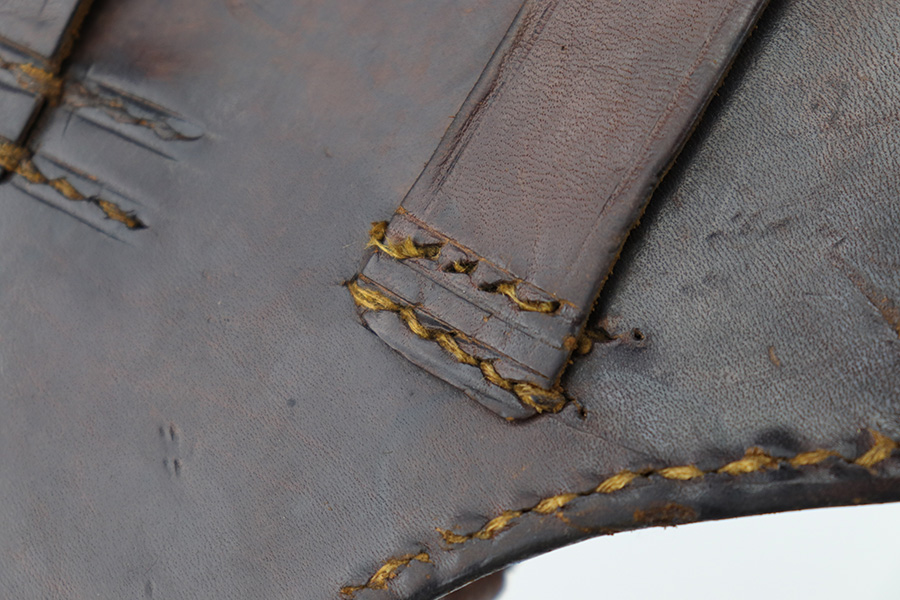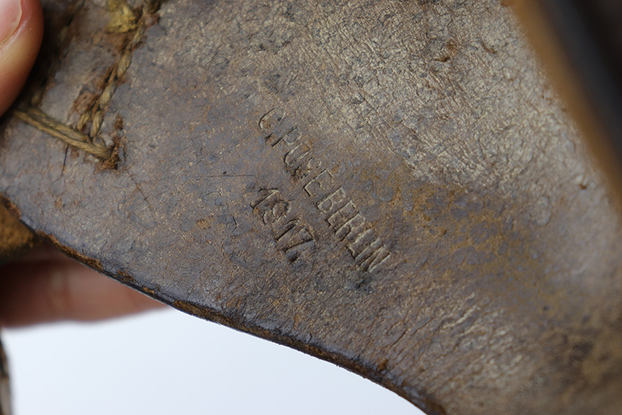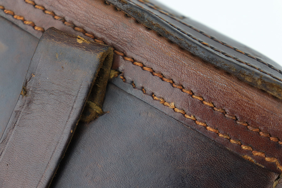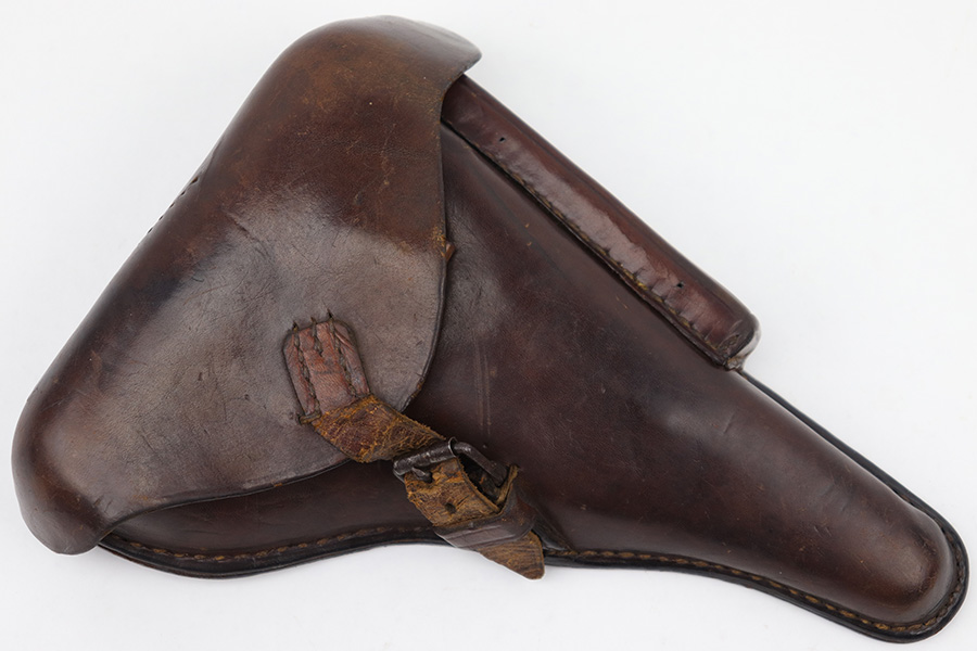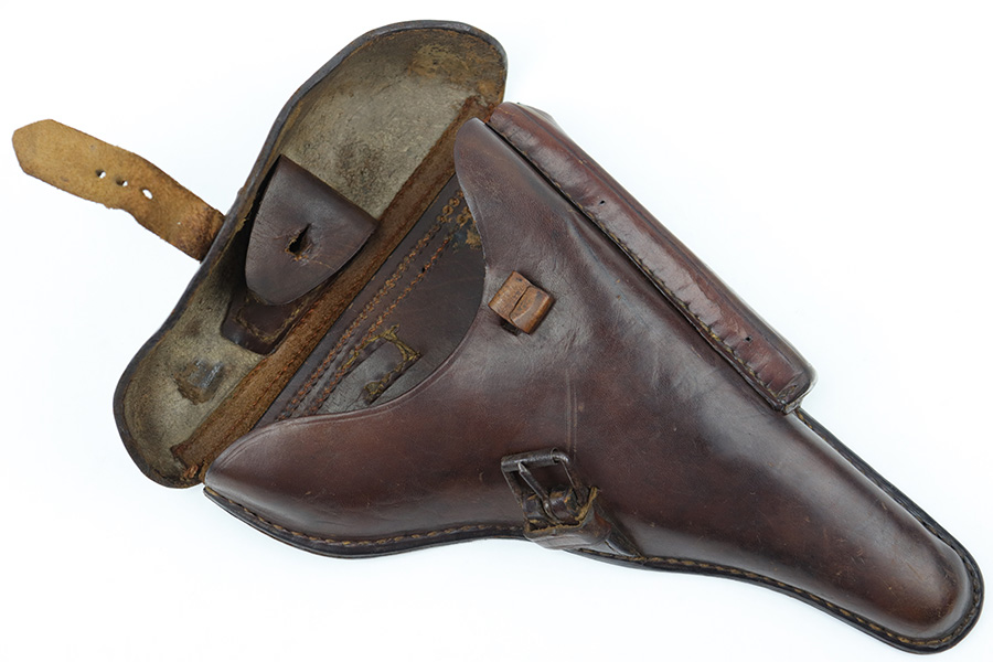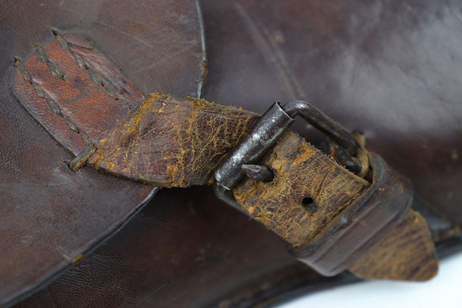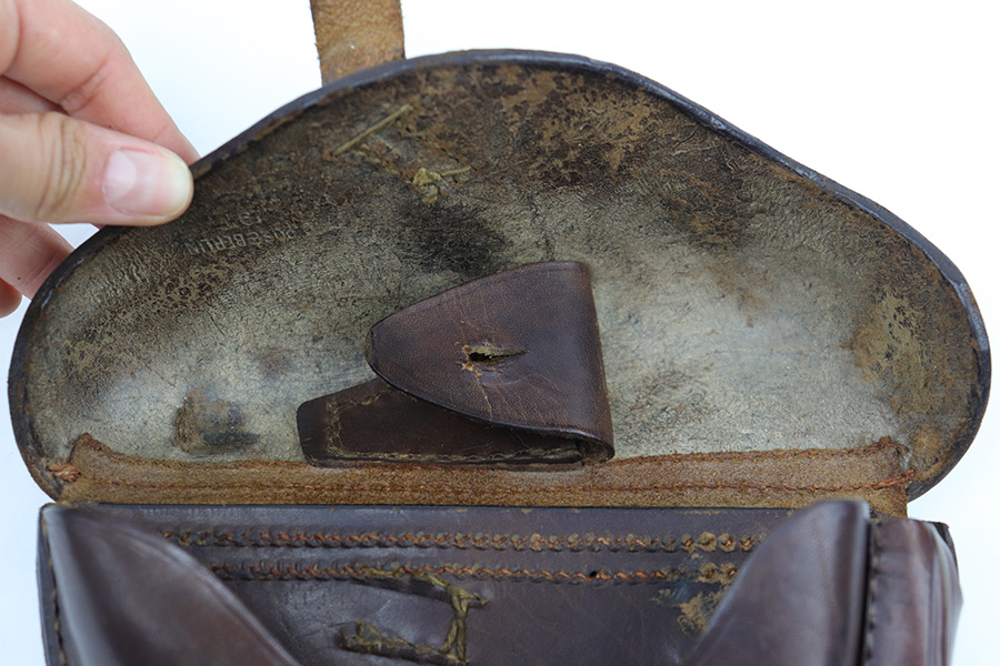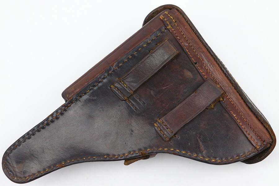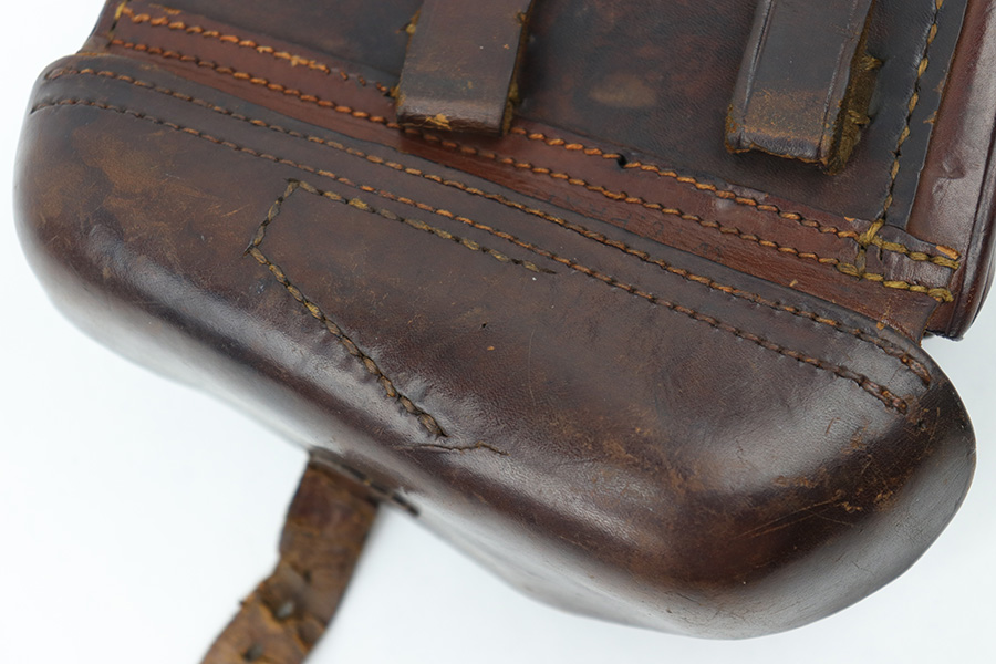 4/6/23 – This is an original WW1 production Luger holster. The holster is in great condition, especially given its age. The leather and stitching are all original, and the interior leather still shows the original maker stamp with 1917 manufacture date. The leather has mild pliability and fairly clean interior. There are one or two loose stitches at the top line of stitching on the right belt loop, but this doesn’t affect functionality and the belt loop is still secure. A top-notch WW1 Luger holster.