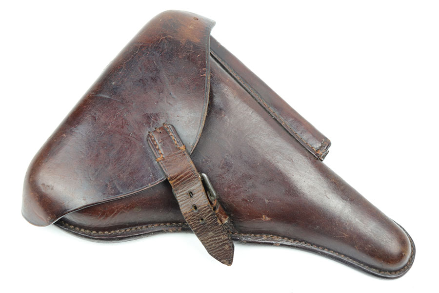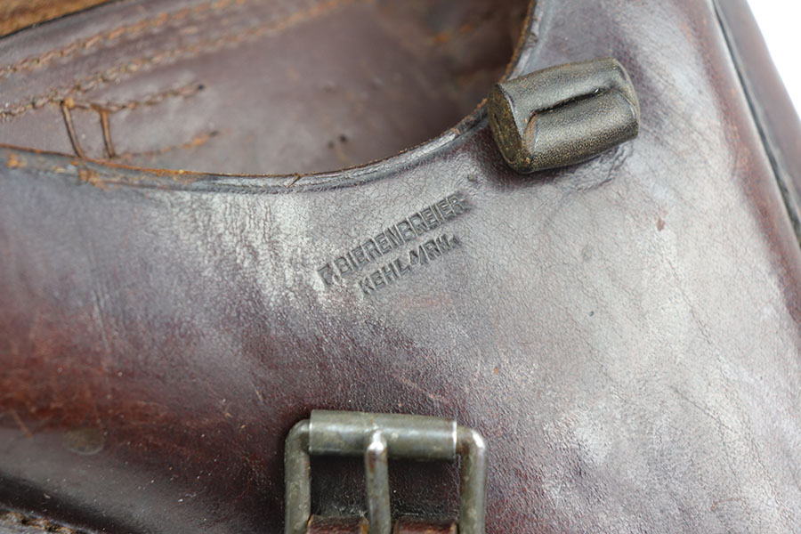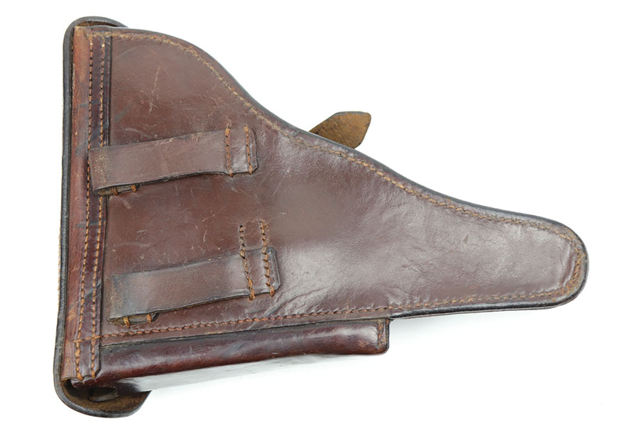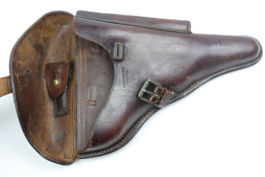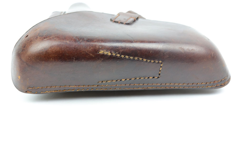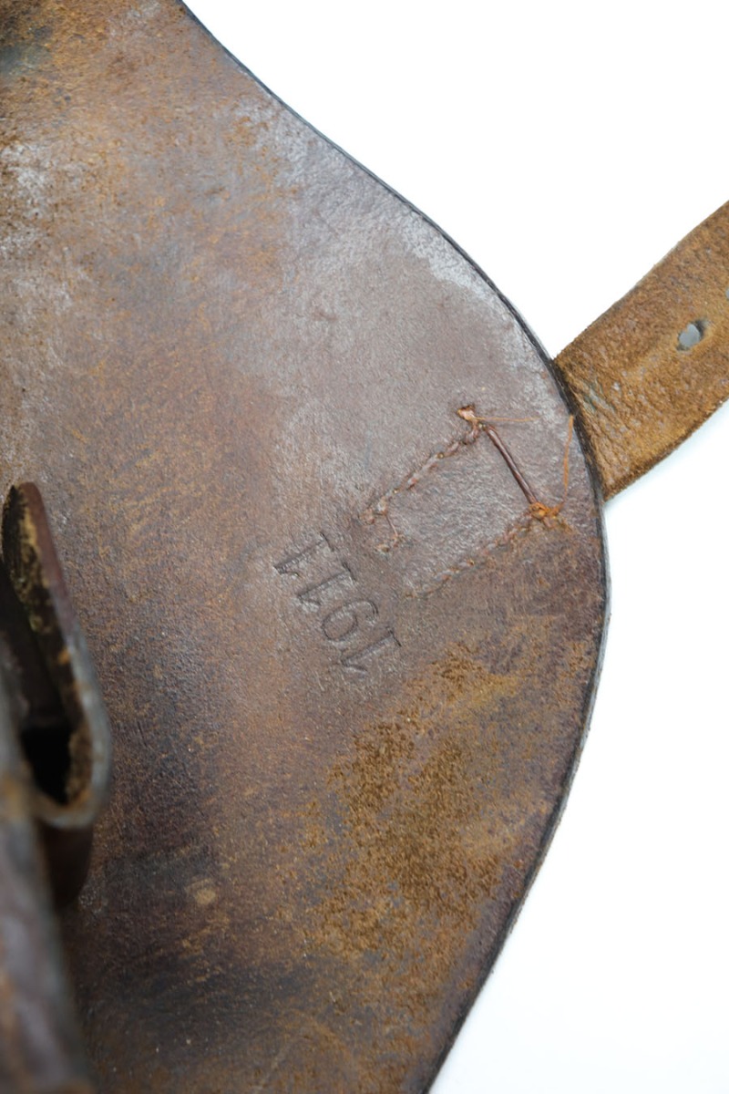 1/11/21 – This is an original WW1 era Luger holster with a 1911 date on the interior lid. The holster is in excellent condition considering its’ age. The leather is fully in tact and fairly clean with no major issues. No stitching issues either. The front leather is maker stamped and the interior lid is 1911 date stamped. Both stamps are crisp. No other markings.
