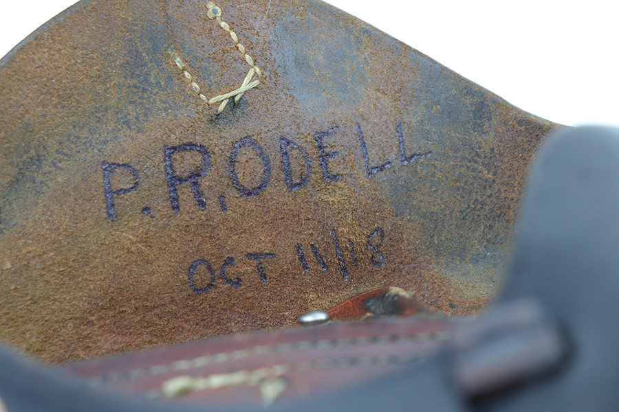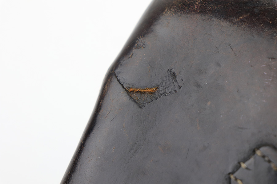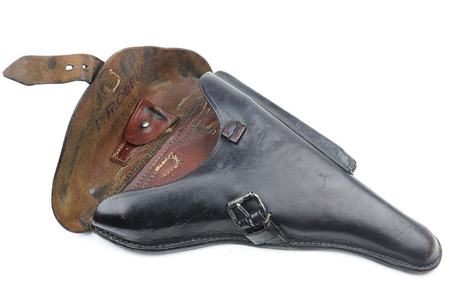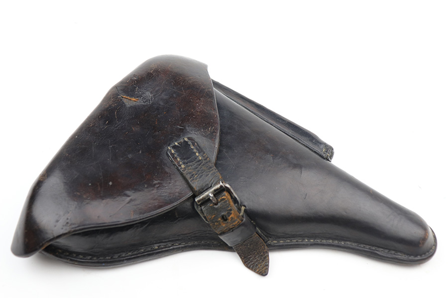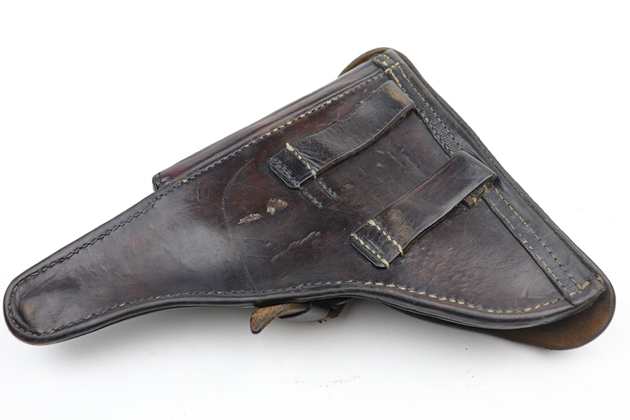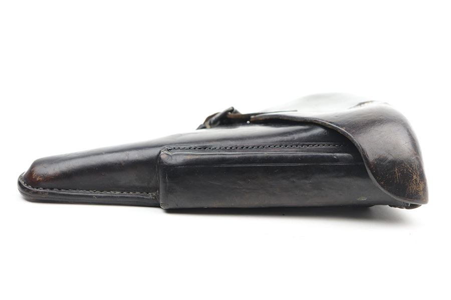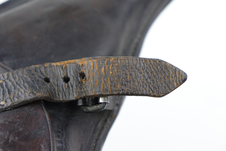 10/20/21 – This is an original WW1 production Luger holster. The holster is maker stamped and dated on the interior of the lid, but the stamp is very light and hard to decipher. The interior leather also has a name written inside. The leather is in great shape despite some mild surface wrinkling on the closure strap, and a fairly deep scuff on the top leather (lid). This doesn’t go all the way through the leather. The stitching is all tight and in tact. A very nice WW1 example.