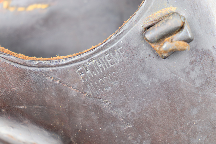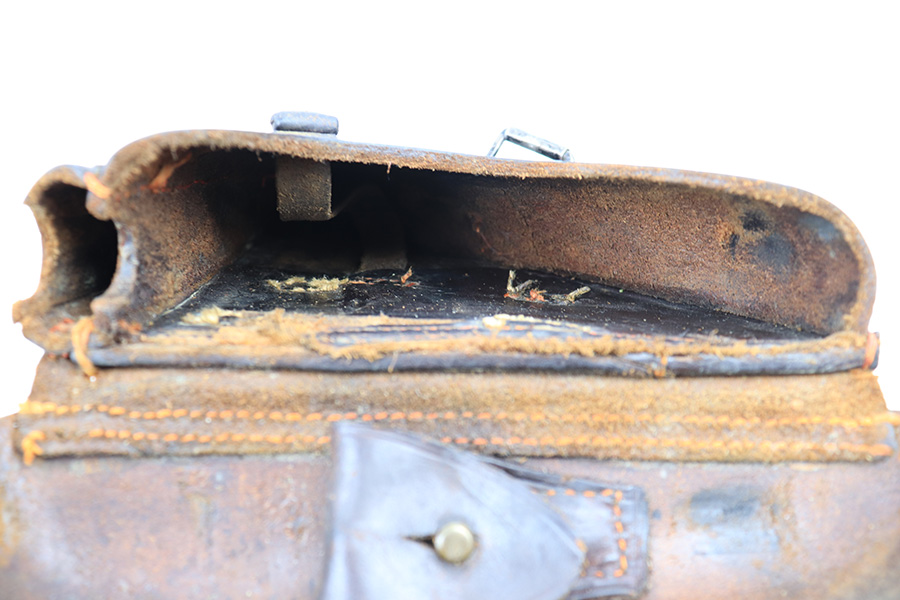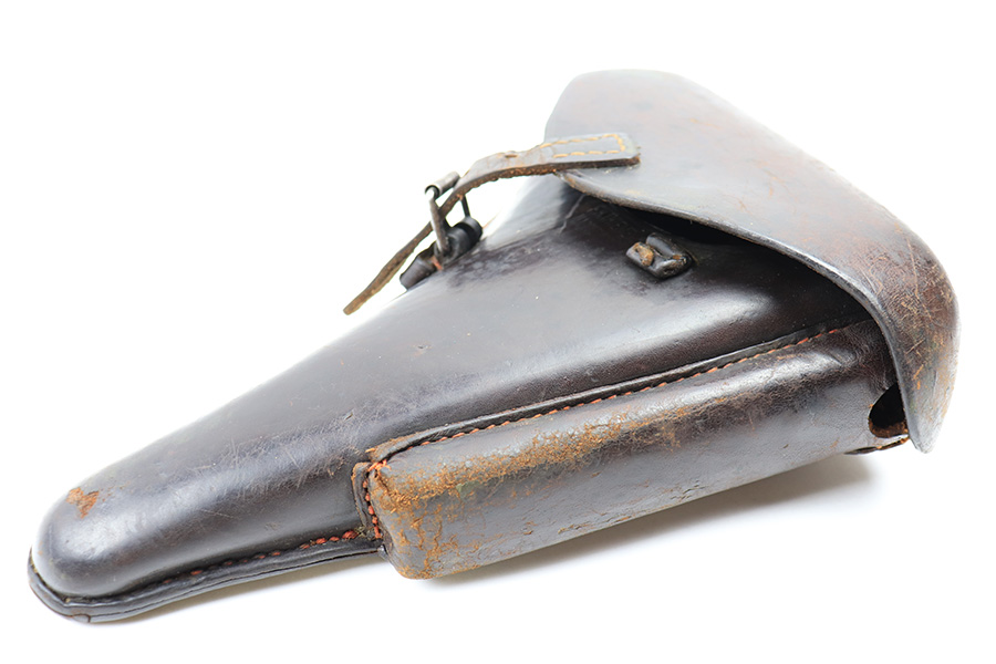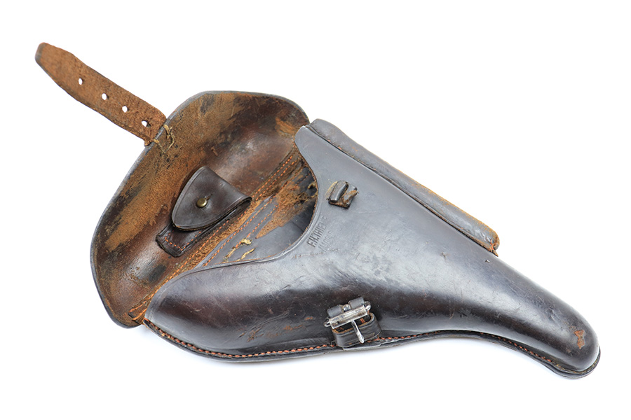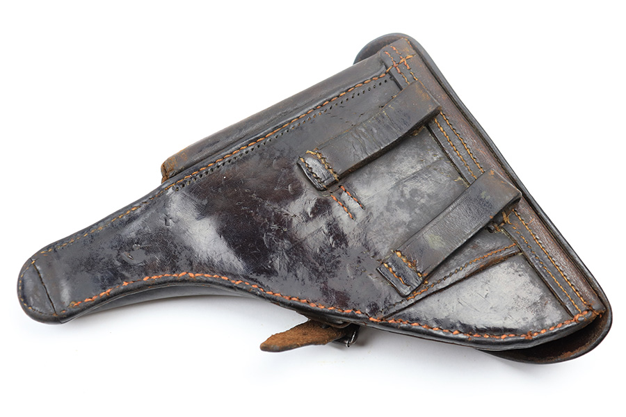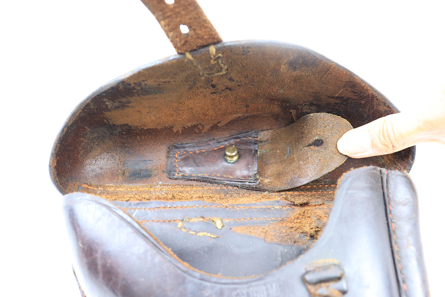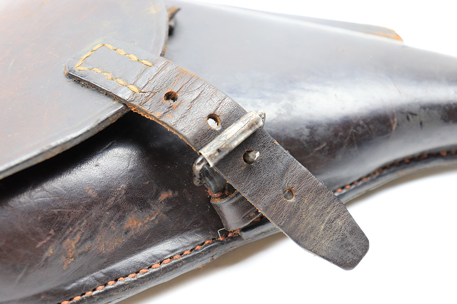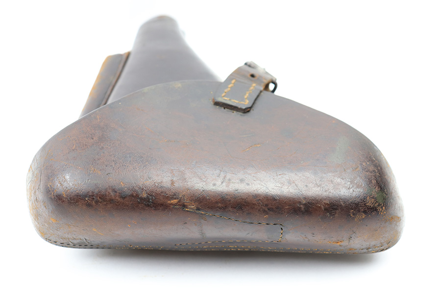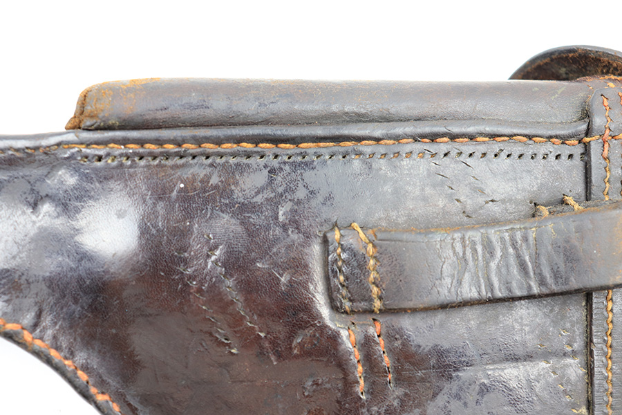 6/23/22 – This is an original WW1 era production Luger holster. The holster is in good overall condition, despite some re-stitching on the back belt loops, as shown in photos. There’s also some odd modifications on the back leather; there’s a line of stitching / cut leather to the right of the belt loops and the toe of the holster. We’re not sure why these modifications are present, but there are also multiple empty stitching holes on the back leather as well. Overall the leather is in great condition despite these modifications, and the holster makes for a nice WW1 representative piece, priced to sell.