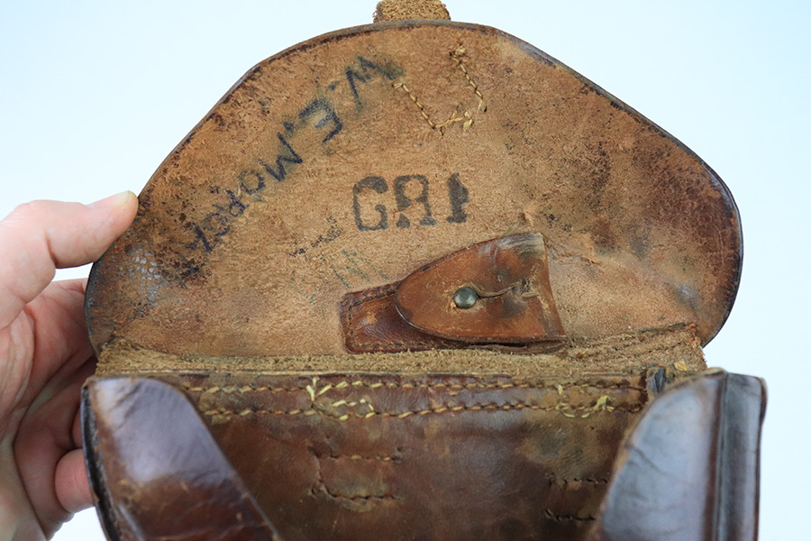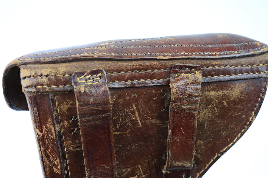 12/21/22 – This is an original WW1 production German Luger holster. The holster has no visible maker marking or date stamp. The leather is soft and pliable with exterior scuffing and surface wear. The closure strap has some surface cracking and the leather is fairly weak, but still completely intact. The toe of the holster has scuffing as well, but this is only surface wear. The back belt loops have been restitched, and the left belt loop is missing one line of lower stitching, but is still attached by the upper line of stitching. The rest of the stitching on the holster looks to be original.