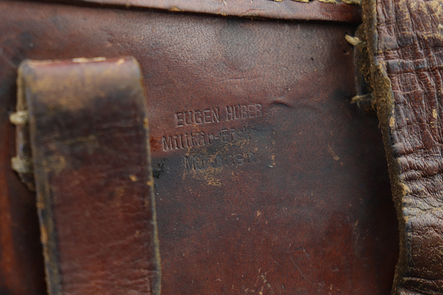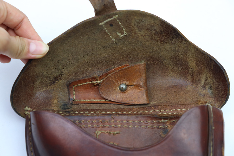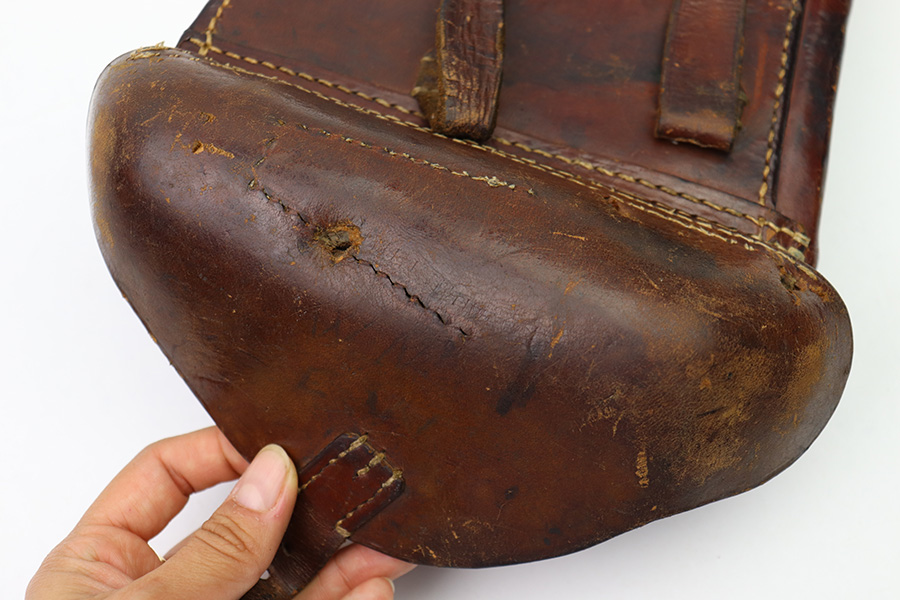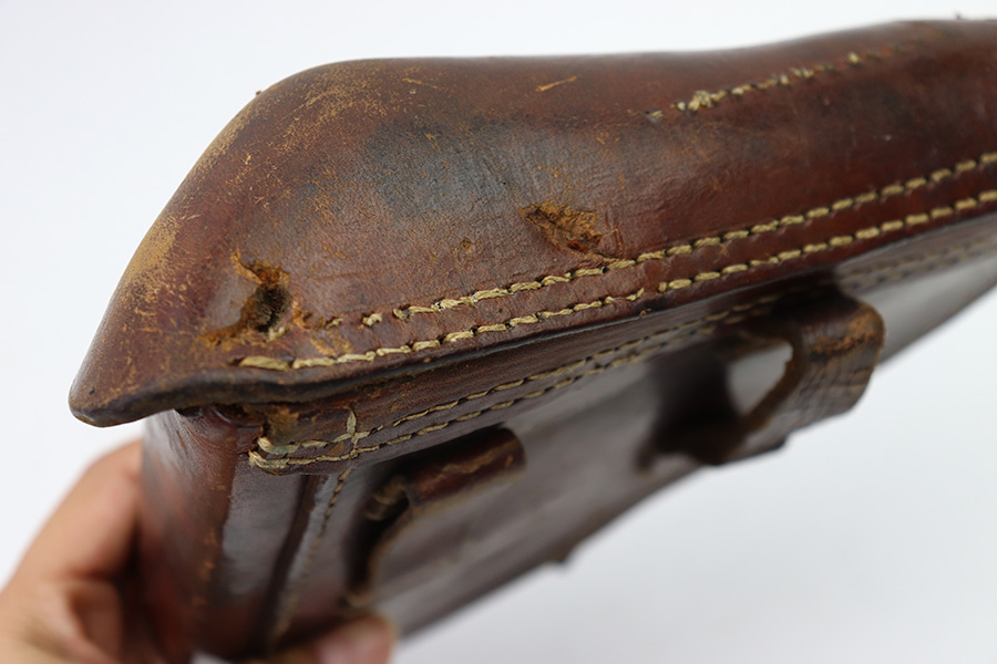8/1/22 – This is an original WW1 era production Luger holster. The holster is WW1 production style, but there are no maker markings or date stamps. The brown leather is in great overall condition with normal pliability and very nice shape. The tope leather has a few small holes from shrapnel or some other sort of impact, as the leather folds in around these holes and is aged properly. The exterior has various surface scuffs and mild discoloration but a clean interior. The stitching is all original and missing around the tool pouch and a few small areas on the lid, but this doesn’t affect functionality and all of the leather is securely attached. Very nice overall condition with some honest wear and “character”.