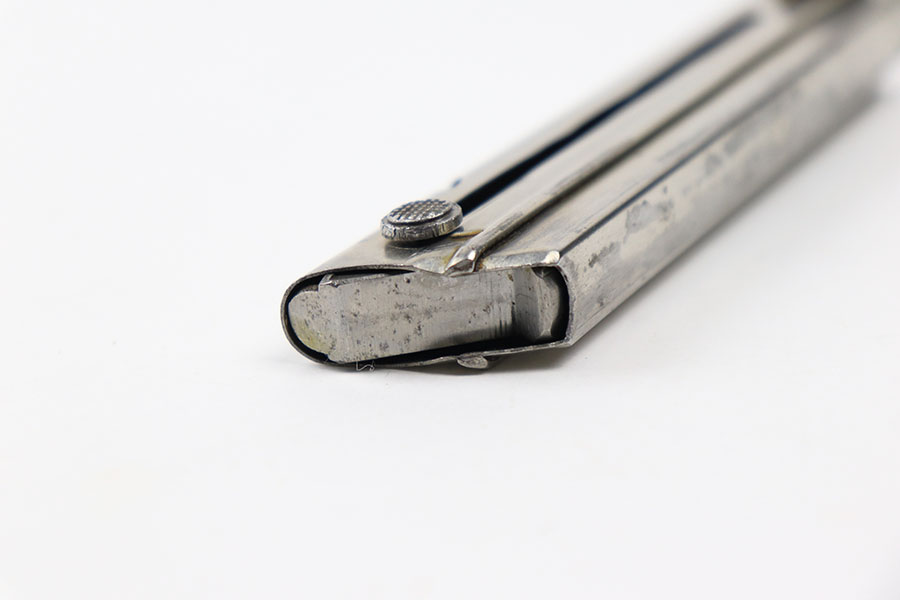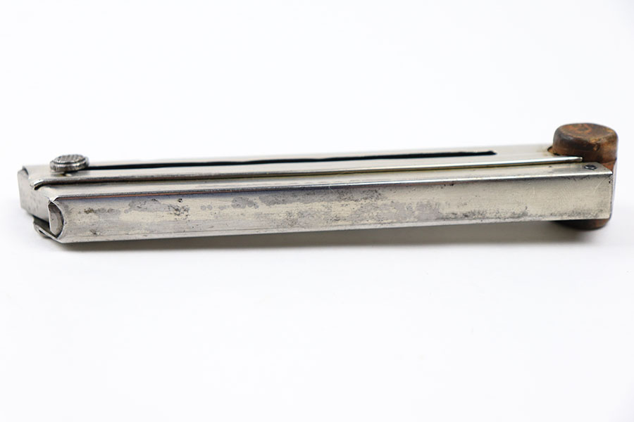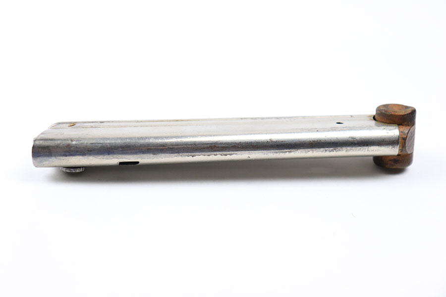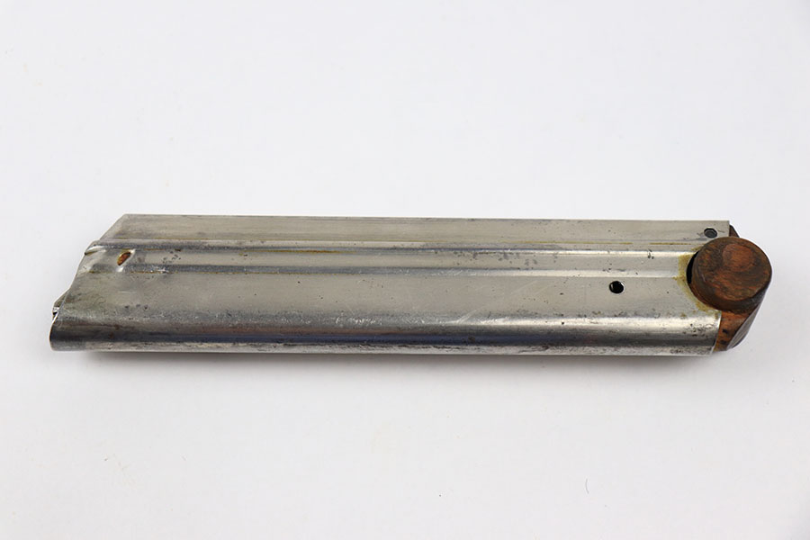 7/14/21 – This is an original WW1 era luger magazine. The magazine has a nickel tube and wood base. The base is serial numbered “4810” with a plus sign, meaning this was the spare magazine. The tube has some light oxidation throughout but no rust or pitting. Strong, fully functional spring.