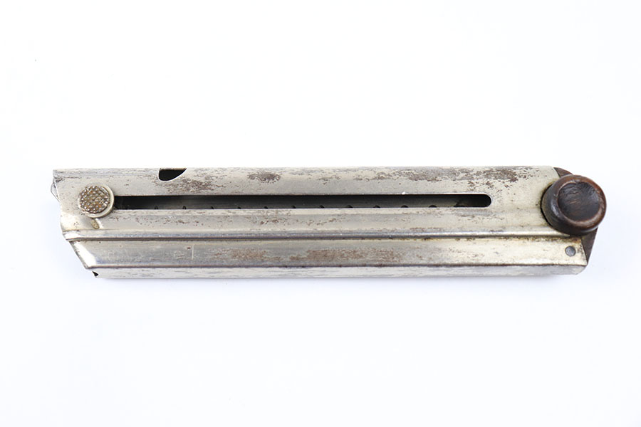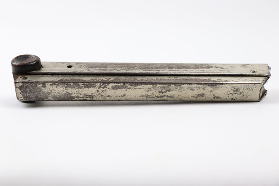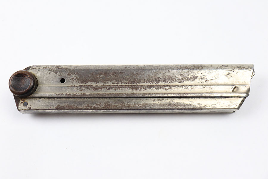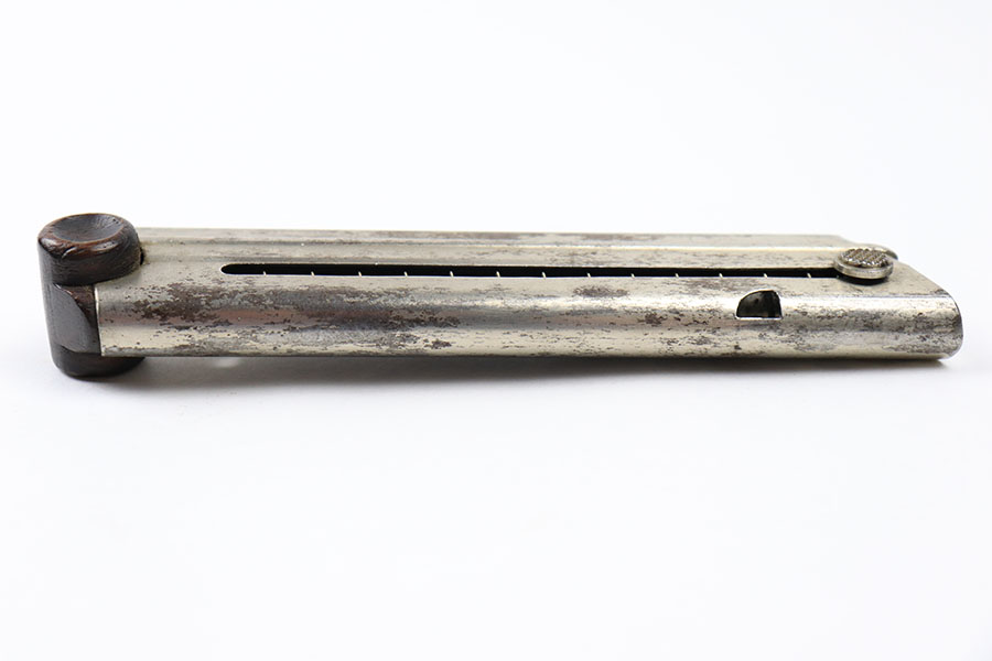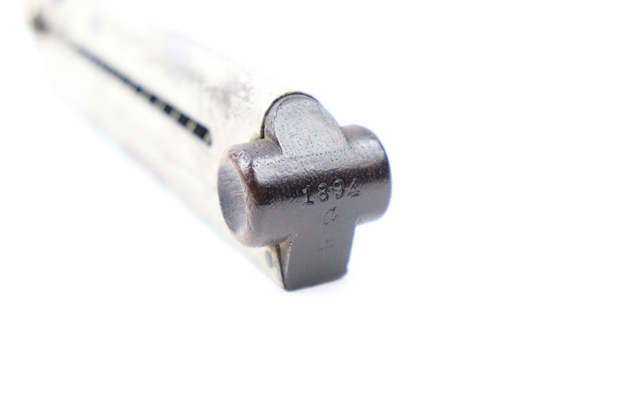 7/16/21 – This is an original WW1 production Luger magazine. The magazine has a wood base in great condition with a serial number stamped 1894a. There is some mild patina / discoloration on the tube. Strong fully functional spring.