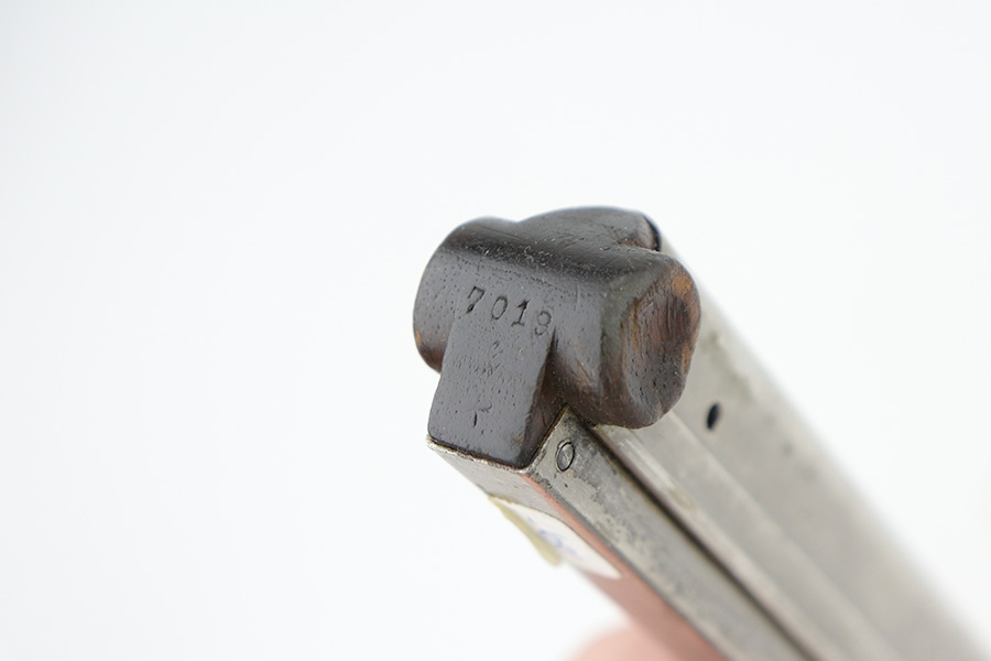 8/30/21 – This is an original WW1 era military issued Luger magazine. The magazine has a wood base and is serial numbered 7019. There’s a faint letter suffix we can’t decipher. Underneath that is a “+” sign. There some mild wear to the ears of the wood base but generally this magazine is in great condition. No rust or pitting and a fully functional spring.