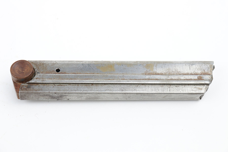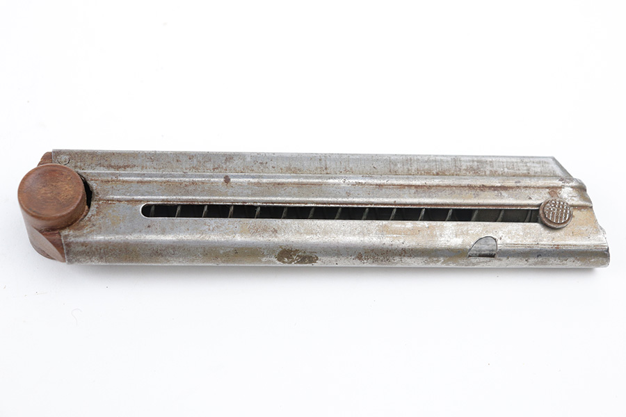 8/30/21 – This is a WW1 era Luger magazine with a nickel tube and wood base. We believe the base is likely a replacement and not original. Priced accordingly. The base is blank with no markings. There is some light surface patina throughout the tube. Strong, functional spring.