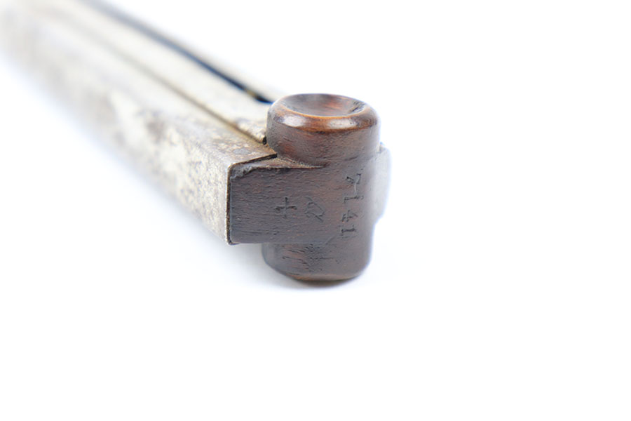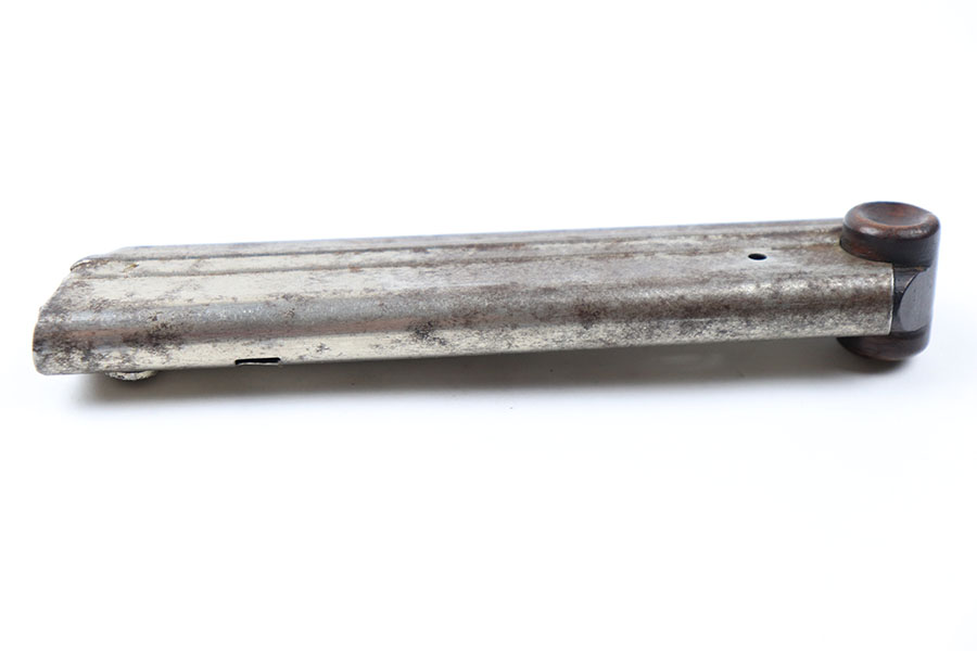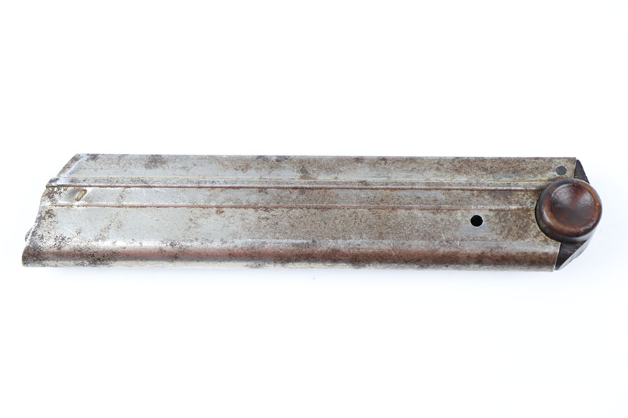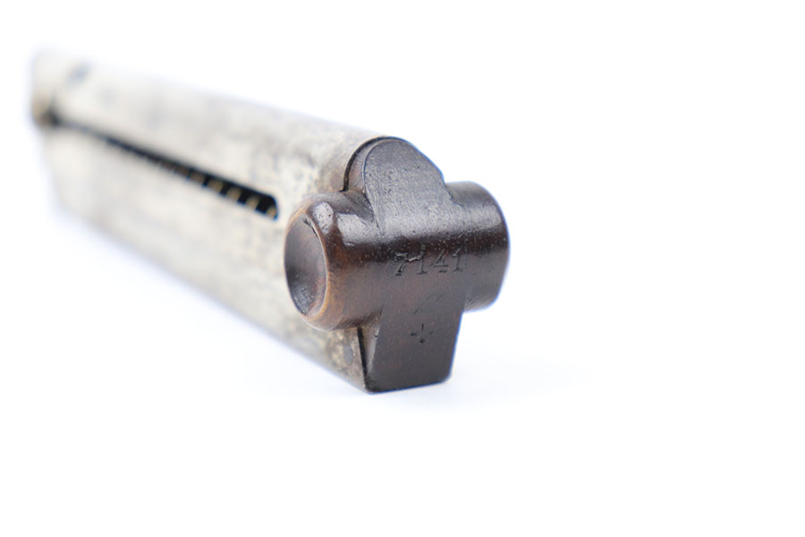 9/15/21 – This is an original WW1 wood base luger magazine. The base has no cracks or chips and is serial numbered 7141a with a plus sign underneath. The magazine tube has light surface patina and mild rust throughout, as shown. The spring is still strong and functional.