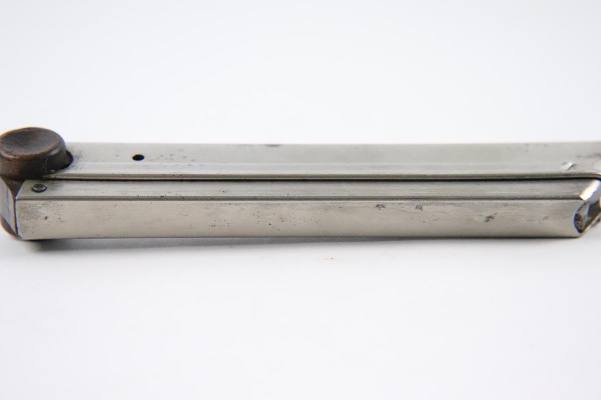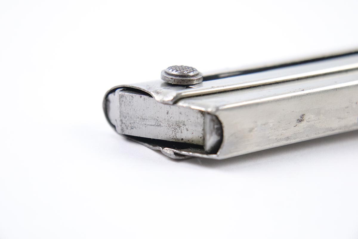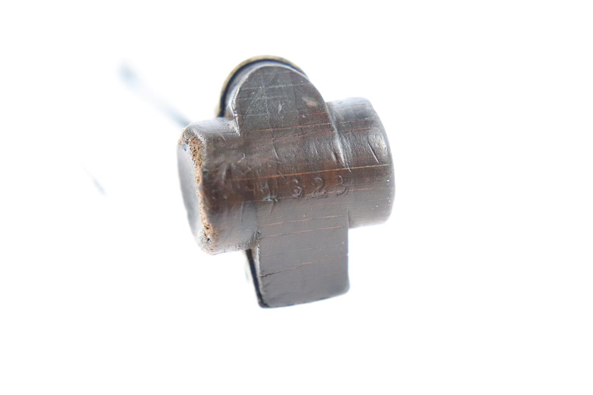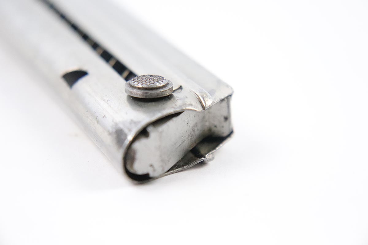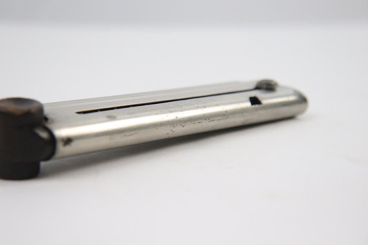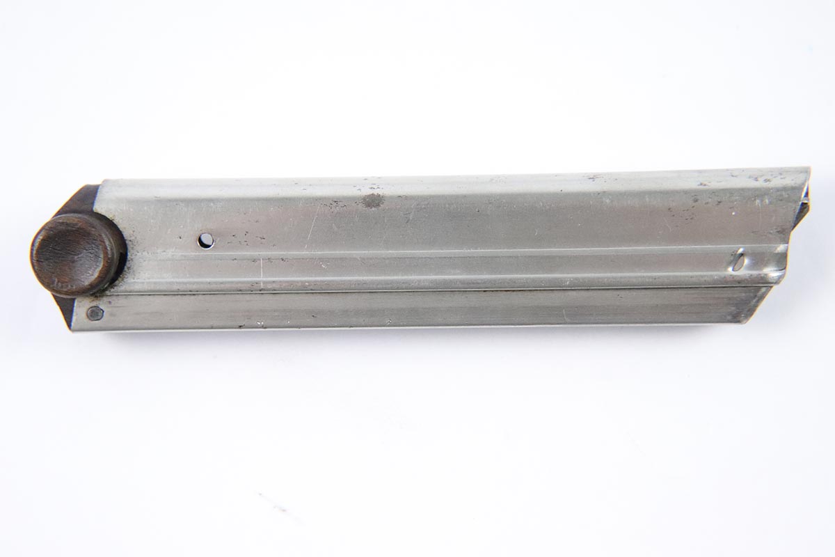5/17/18 – This is an original WW1 production Luger magazine. The magazine is in great shape with an excellent frame, but the wood base has a small crack in it (towards the lower end), and the right ear has a small chip which looks like the bottom portion was grazed or worn down. The magazine is numbered on the base “1623” with no other stamps or markings. The spring is strong and functional.