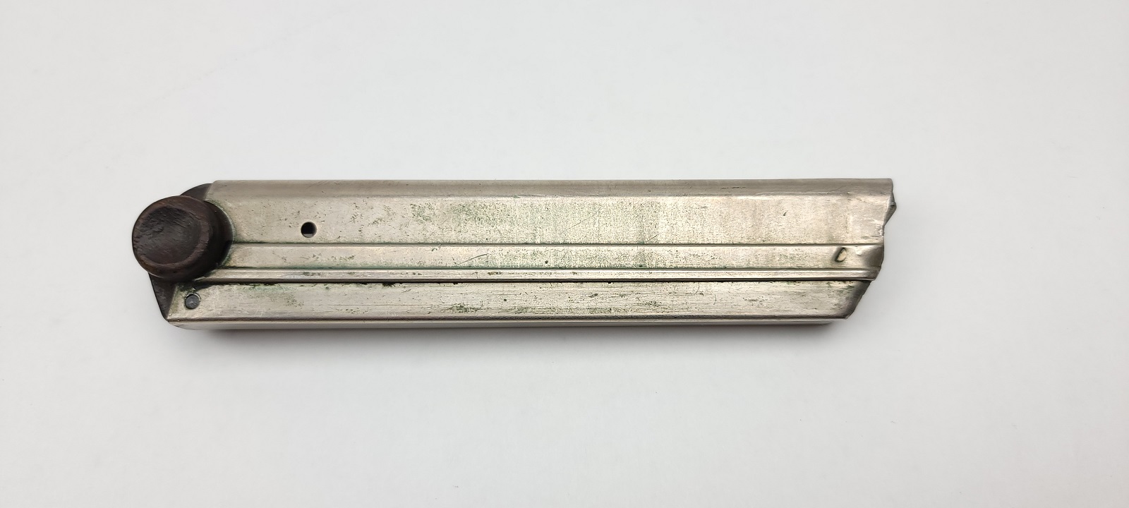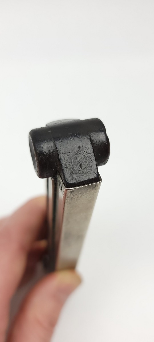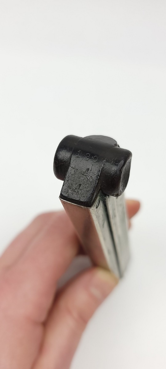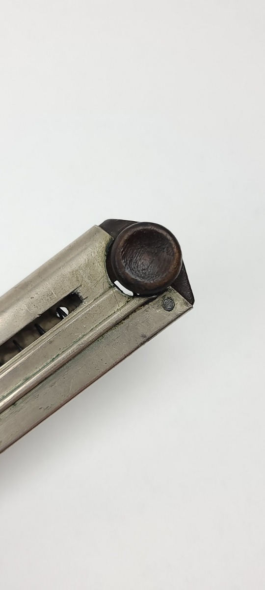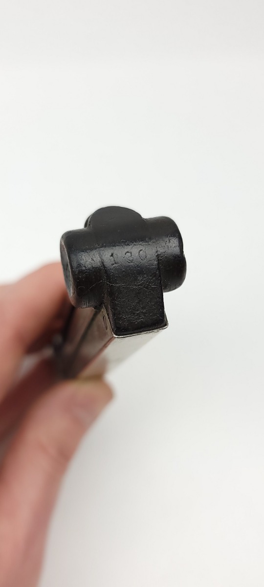 3/8/22 – This is an original WW1 production Luger magazine. The magazine has a wood base that’s in good overall condition. The base is stamped with a 3 digit serial number as shown. There’s some other faint stamps that appear to be a letter suffix and “+” sign. The ears have some minor separation from the tube of the magazine, but this is fairly common. The spring is strong and functional and the tube has no rust or pitting.