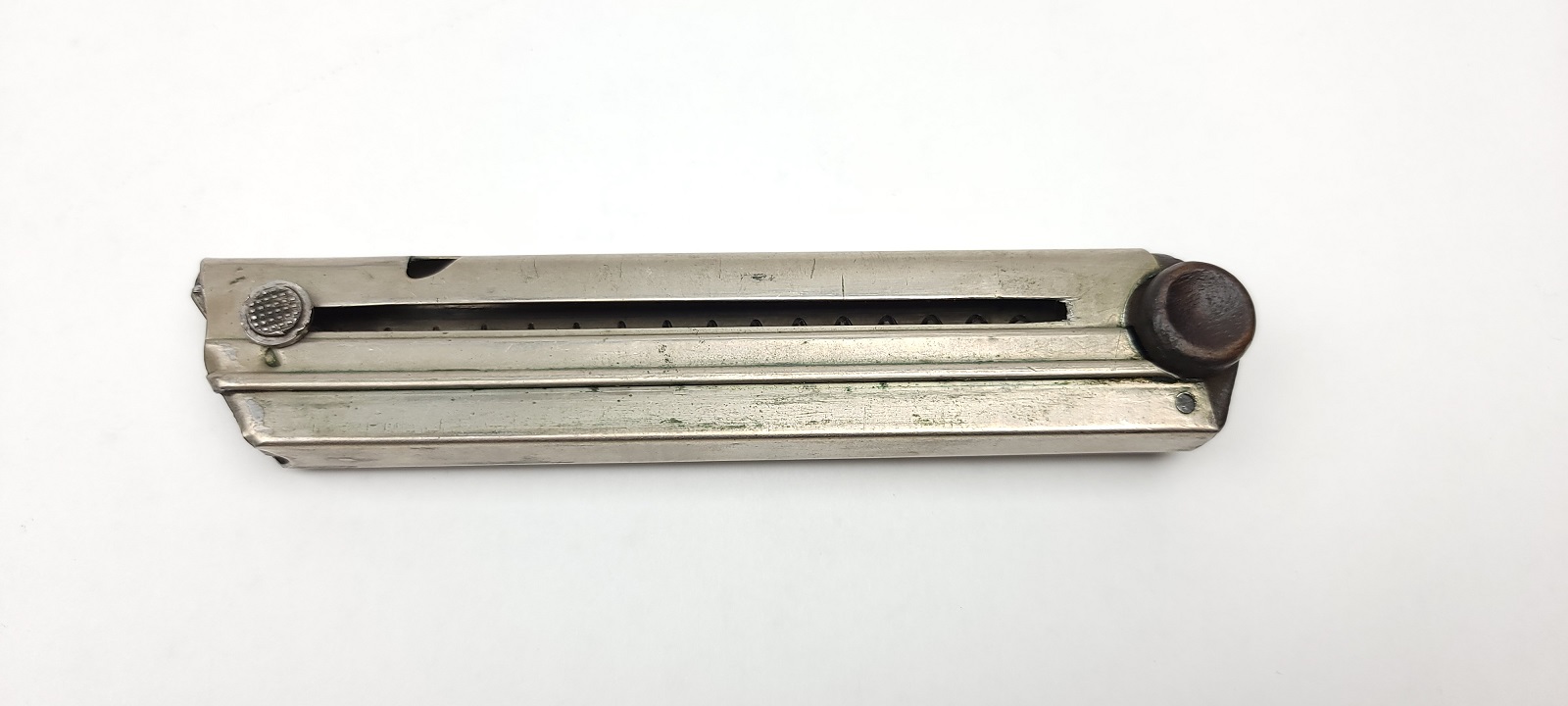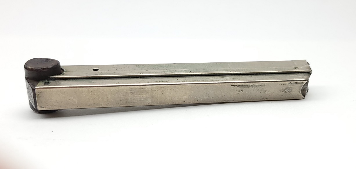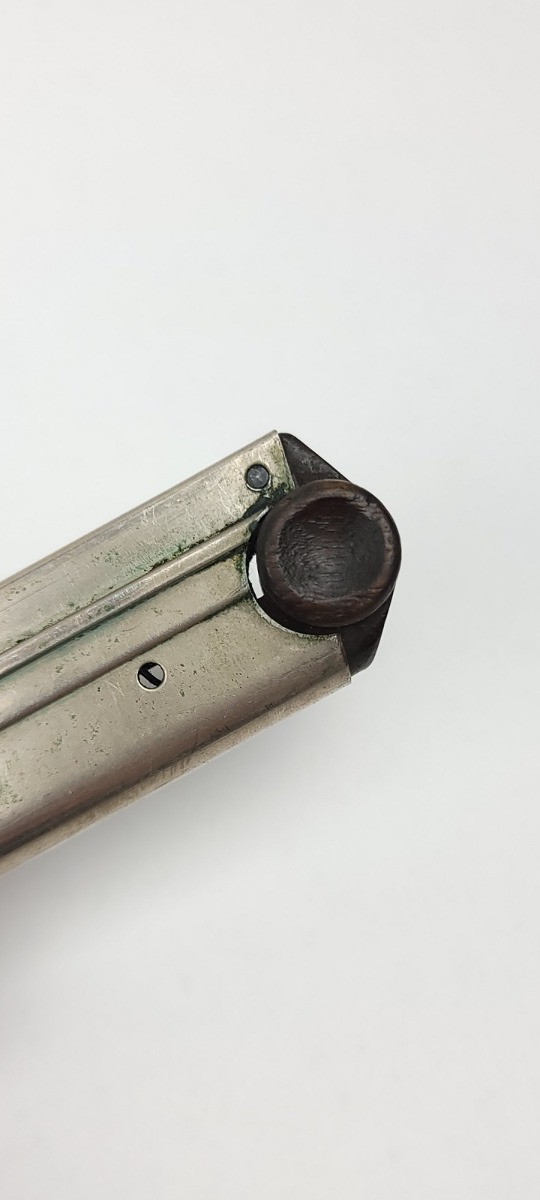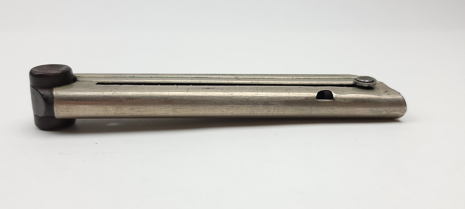 3/8/22 – This is an original WW1 production Luger magazine. The magazine has a wood base that’s in good overall condition. The base is stamped with a 3 digit serial number as shown. There’s some other faint stamps that appear to be a letter suffix and “+” sign. The ears have some minor separation from the tube of the magazine, but this is fairly common. The spring is strong and functional and the tube has no rust or pitting.