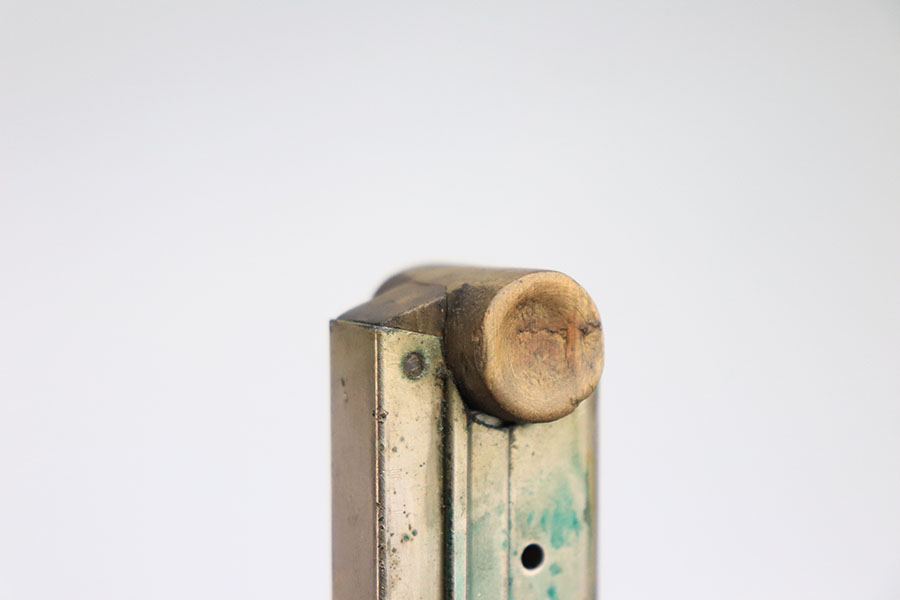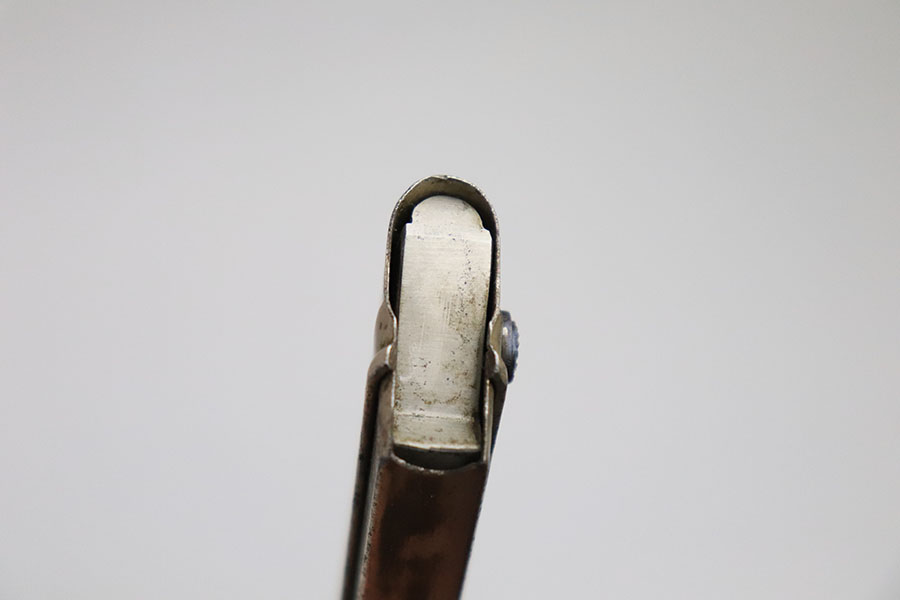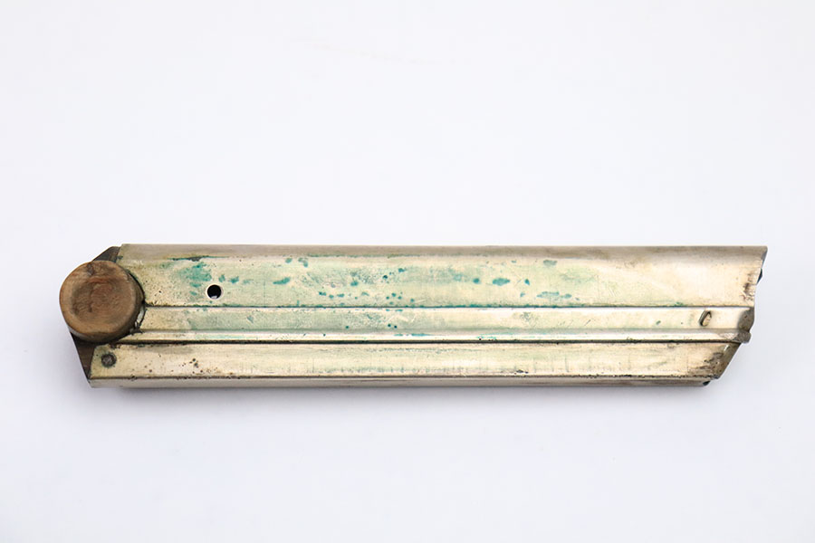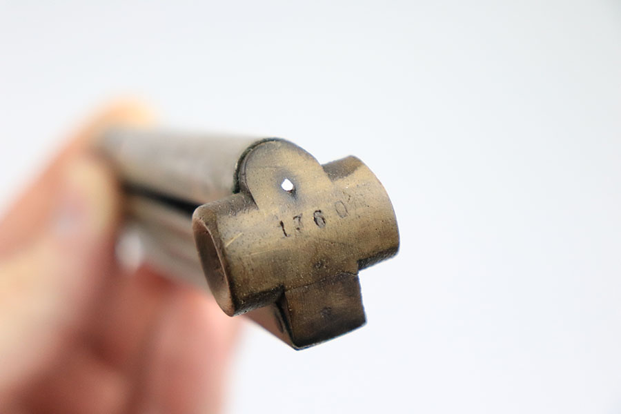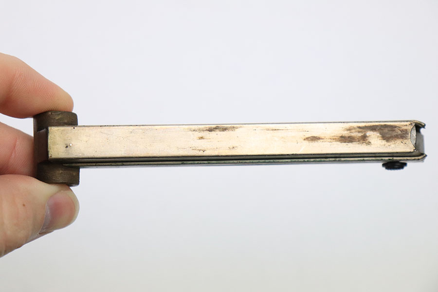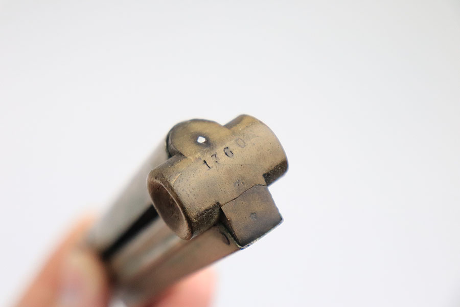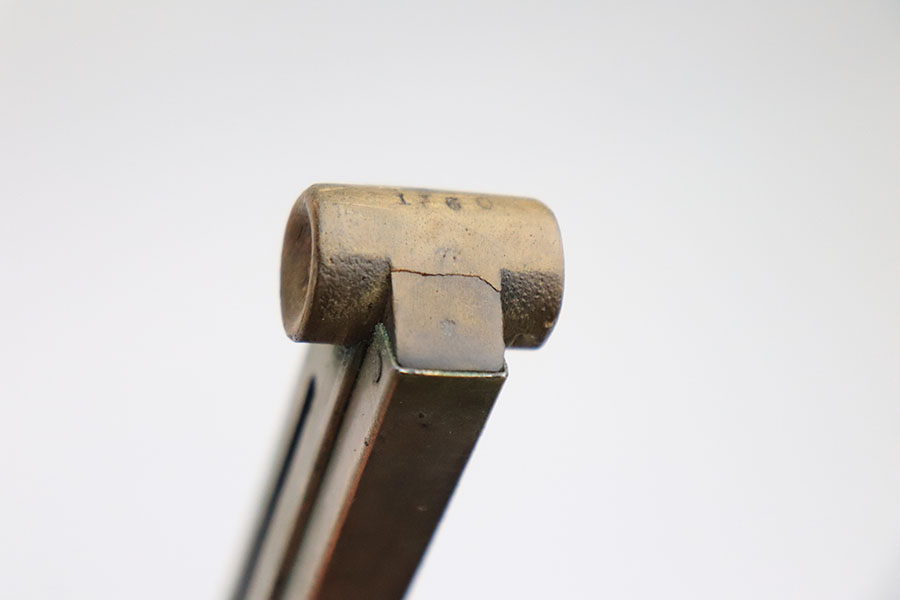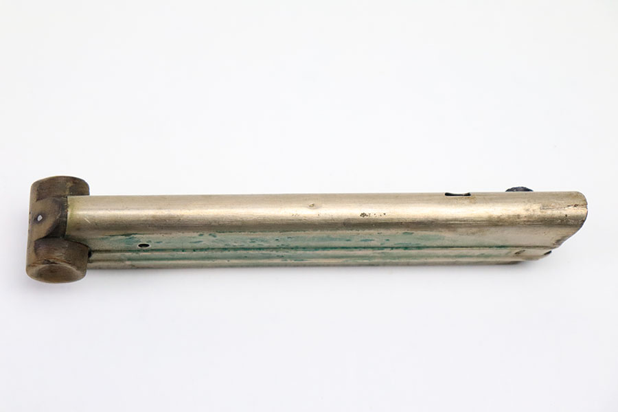 10/11/22 – This is an original WW1 Luger magazine. The magazine has a nickeled tube and wood base. The base has a crack below the serial number, and there’s a small chip in the left “ear”. The base also feels / appears to have been sanded at one point. The result is a faint serial number “1760” and just the top crown of an Imperial proof stamp. The tube has some surface discoloration but no rust or pitting – just typical aging wear. The spring is strong and functional.