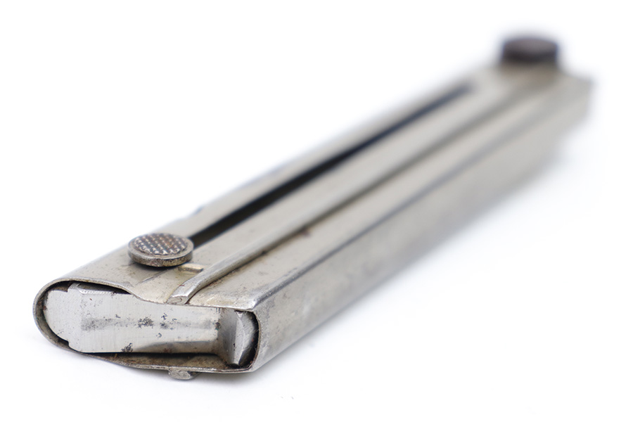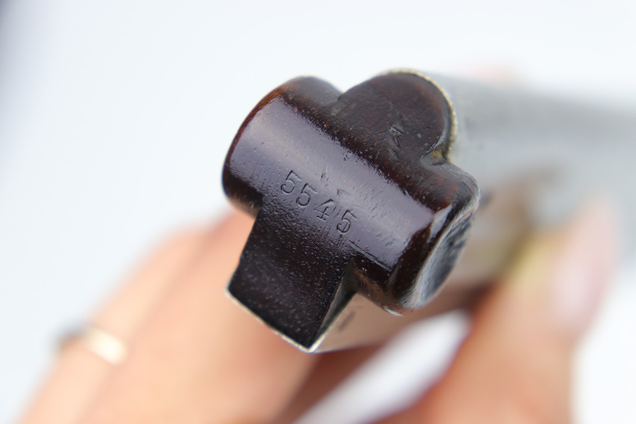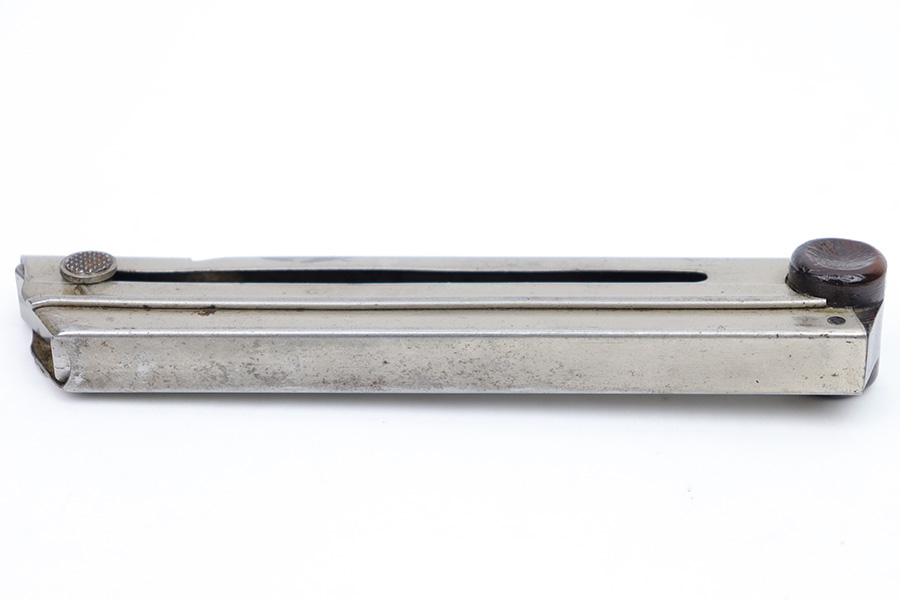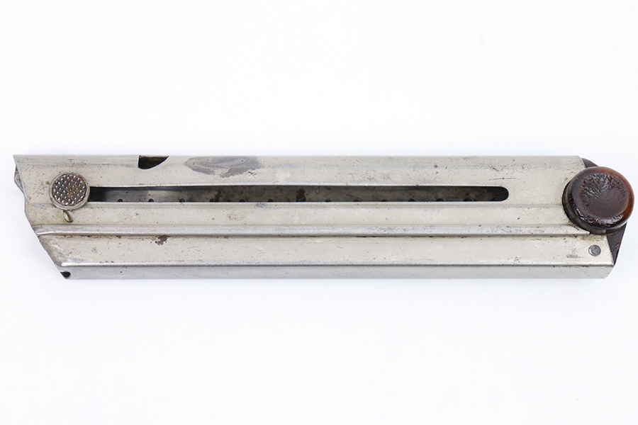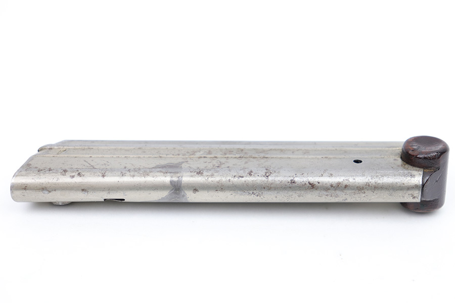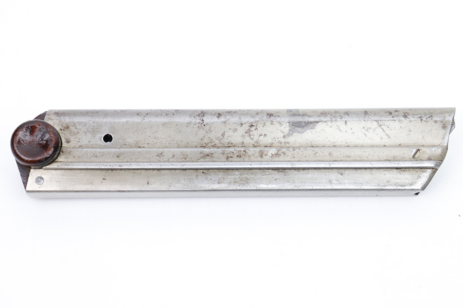 2/6/23 – This is a great example of an original Luger magazine from WW1. The nickeled tube presents surface patina mostly on the front spine and the left side of the magazine. However, the magazine is mostly clean and there are no signs of rust or pitting. The wooden magazine bottom shows some minor wear on both ears and a very minor dent on the left ear. The serial number is “5545”. There are no other markings on the magazine. The spring is strong and functional.