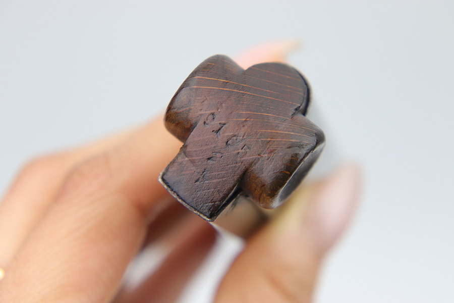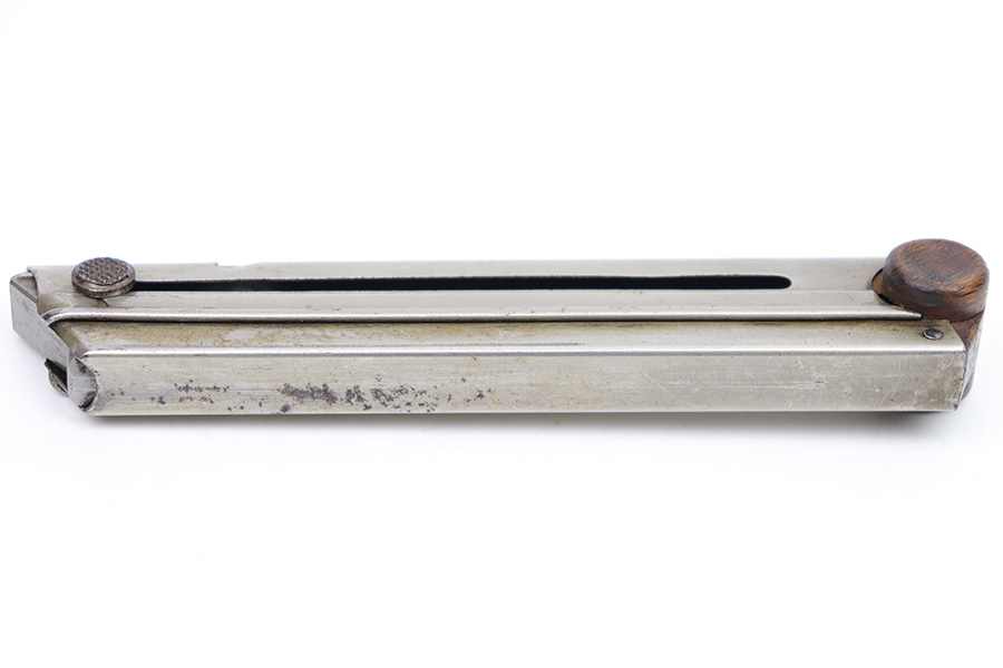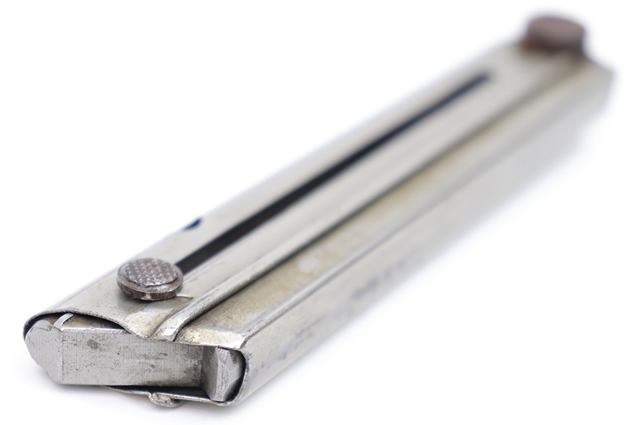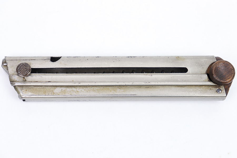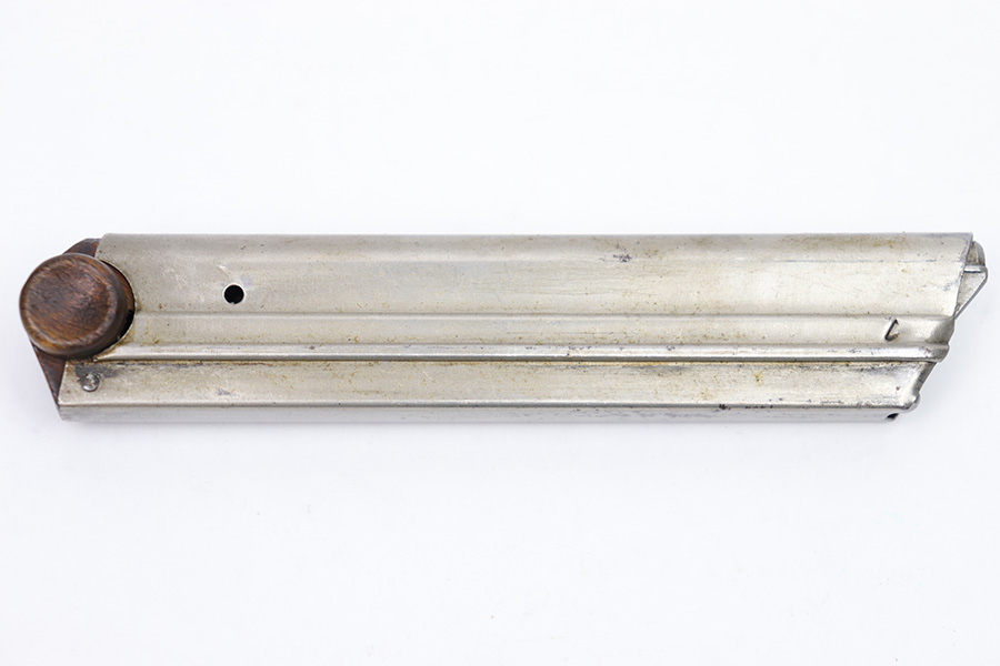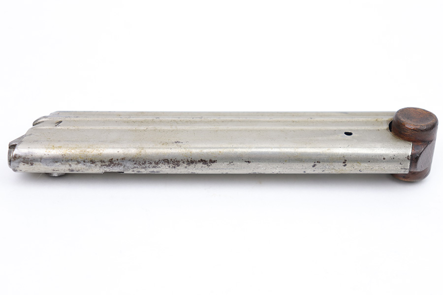 2/6/23 – This is a great example of an original Luger magazine from WW1. The nickeled tube presents minor surface patina mostly on the front and back spine of the magazine, and very minor surface wear on the left side. However, there are no signs of rust or pitting throughout the magazine. The wooden magazine base is in great condition, presenting only minor signs of wear due to handling and age. The serial number is “9165” with a letter suffix underneath, and a plus sign stamped under the serial number. The letter suffix is too faint to tell with certainty which letter it is. The spring is strong, smooth, and functional.