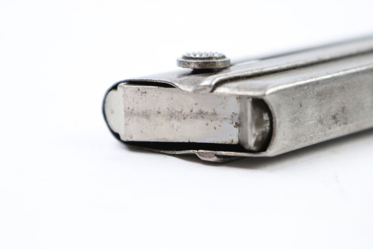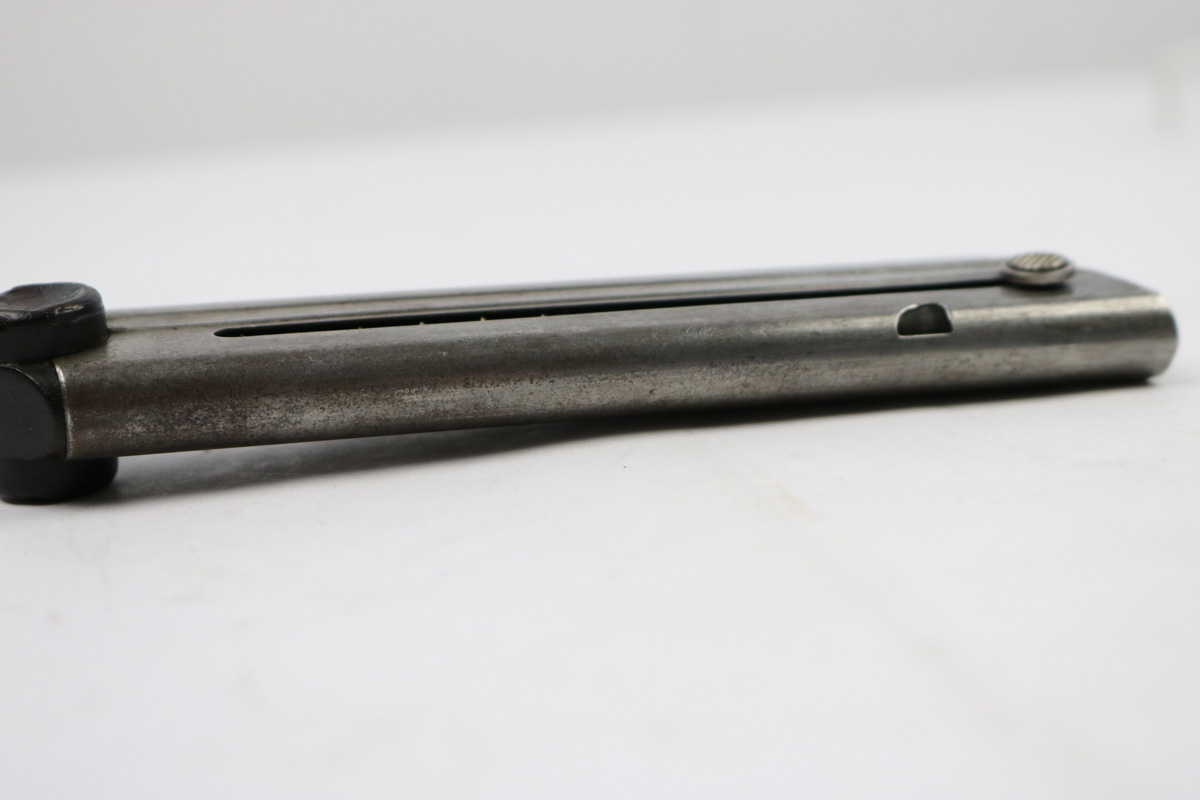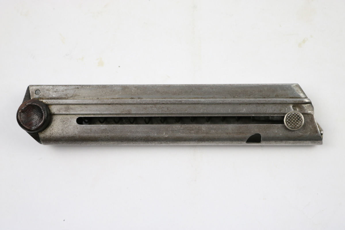 6/28/18 – This is an original WW1 production Luger magazine. The magazine has patina throughout the tube, but this is mostly light discoloration. The base is completely in tact serial numbered 4141c with a “+” sign underneath. Makes a nice collectible spare magazine. Spring is strong and fully functional. Guaranteed original.