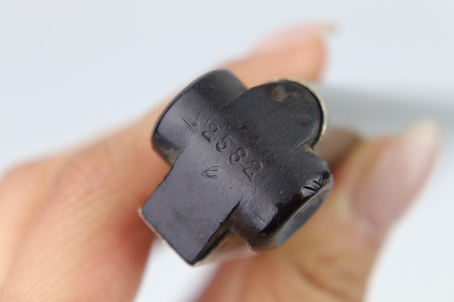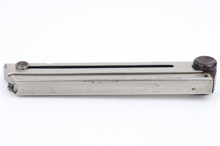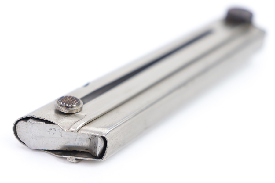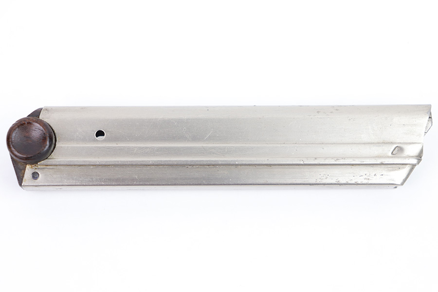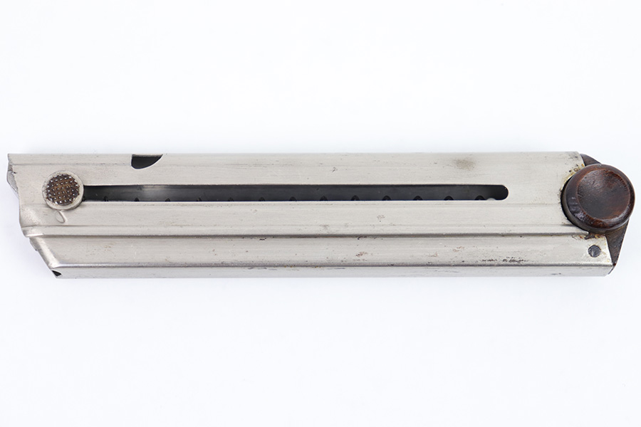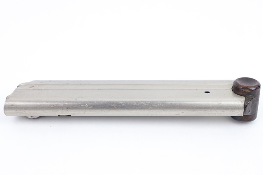 2/28/23 – This is an original WW1 production Luger magazine. The magazine has a nickel tube that’s in great condition with no rust or pitting, and only some very mild surface patina. The wood base has a few minor dents but no cracks or chips. Numbered 2582 L. The spring is strong and functional.