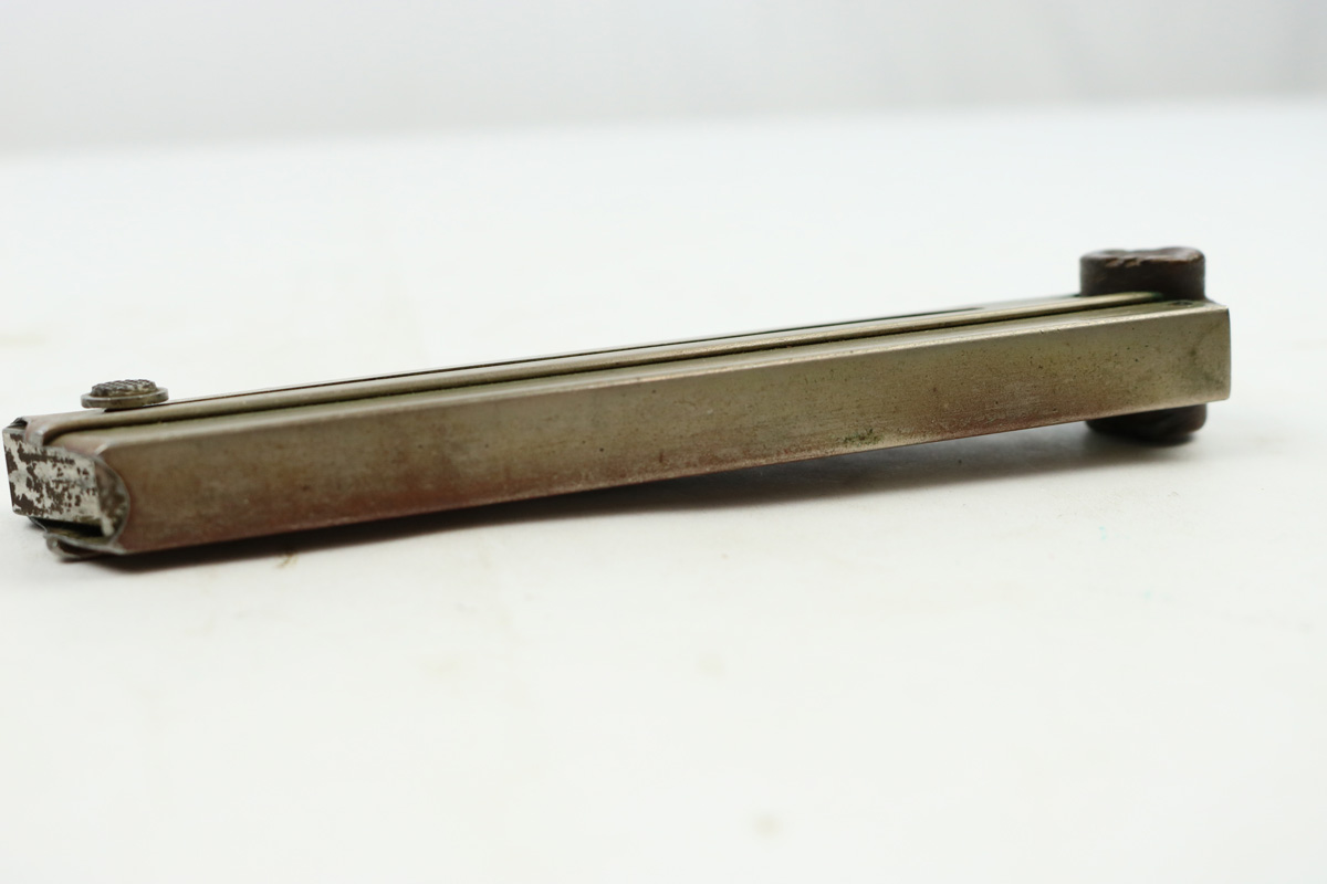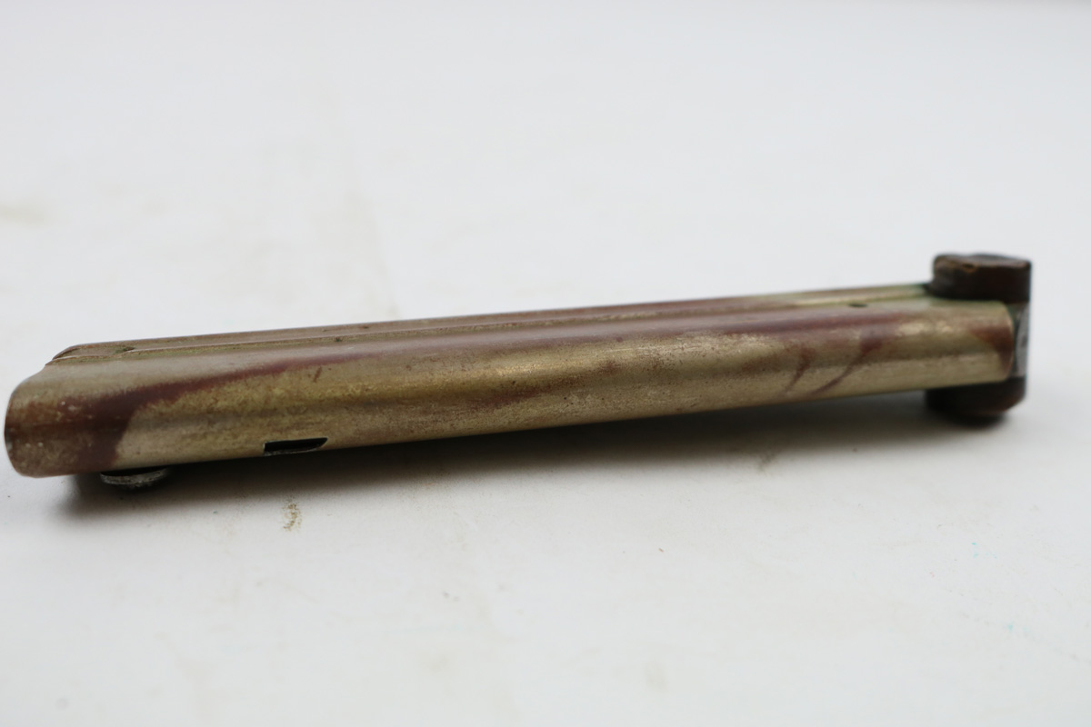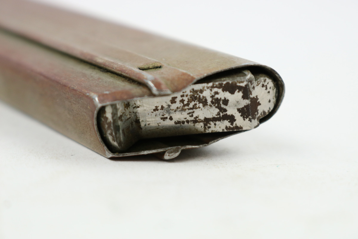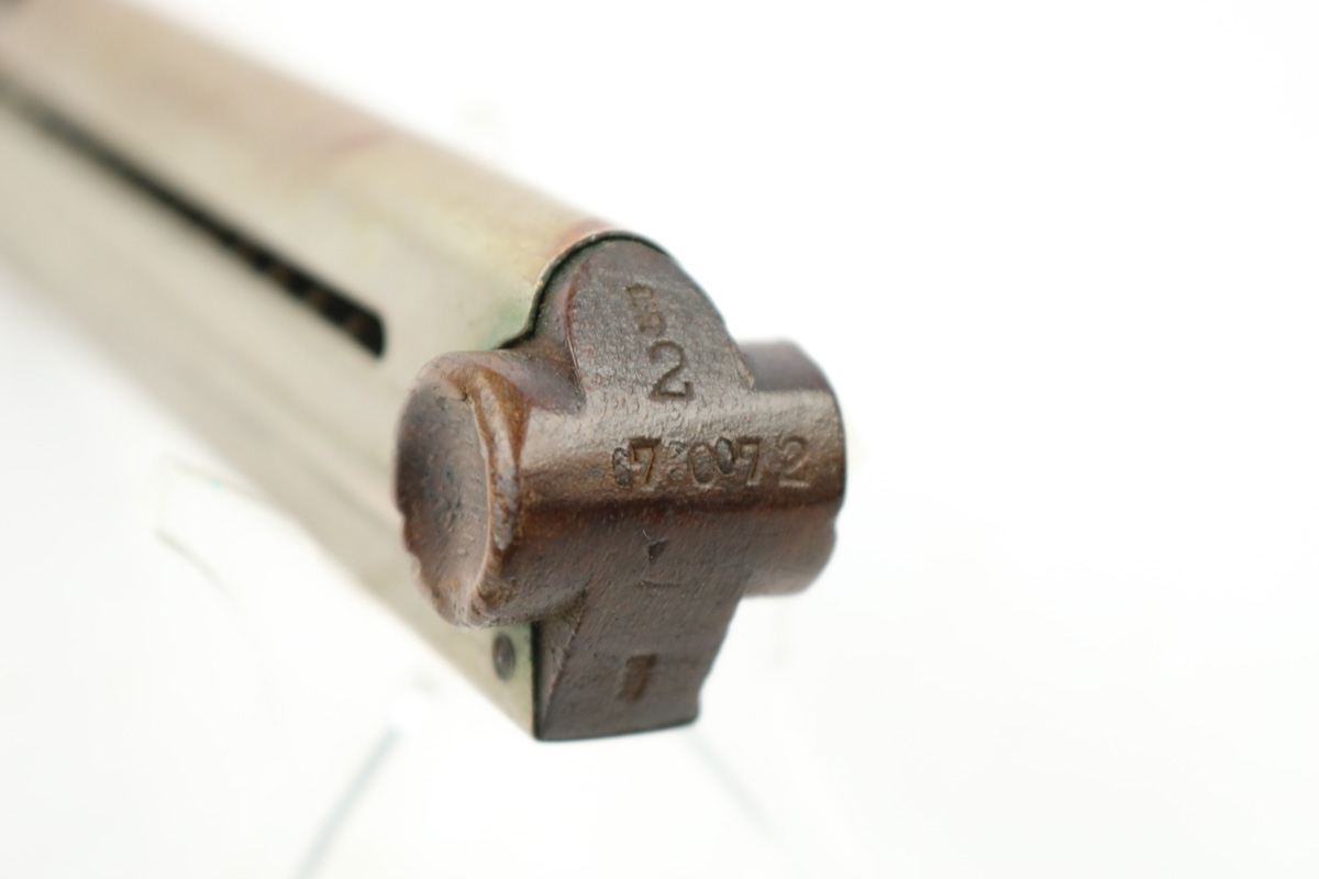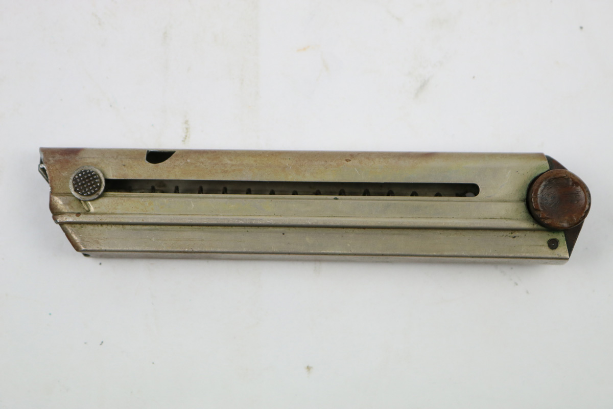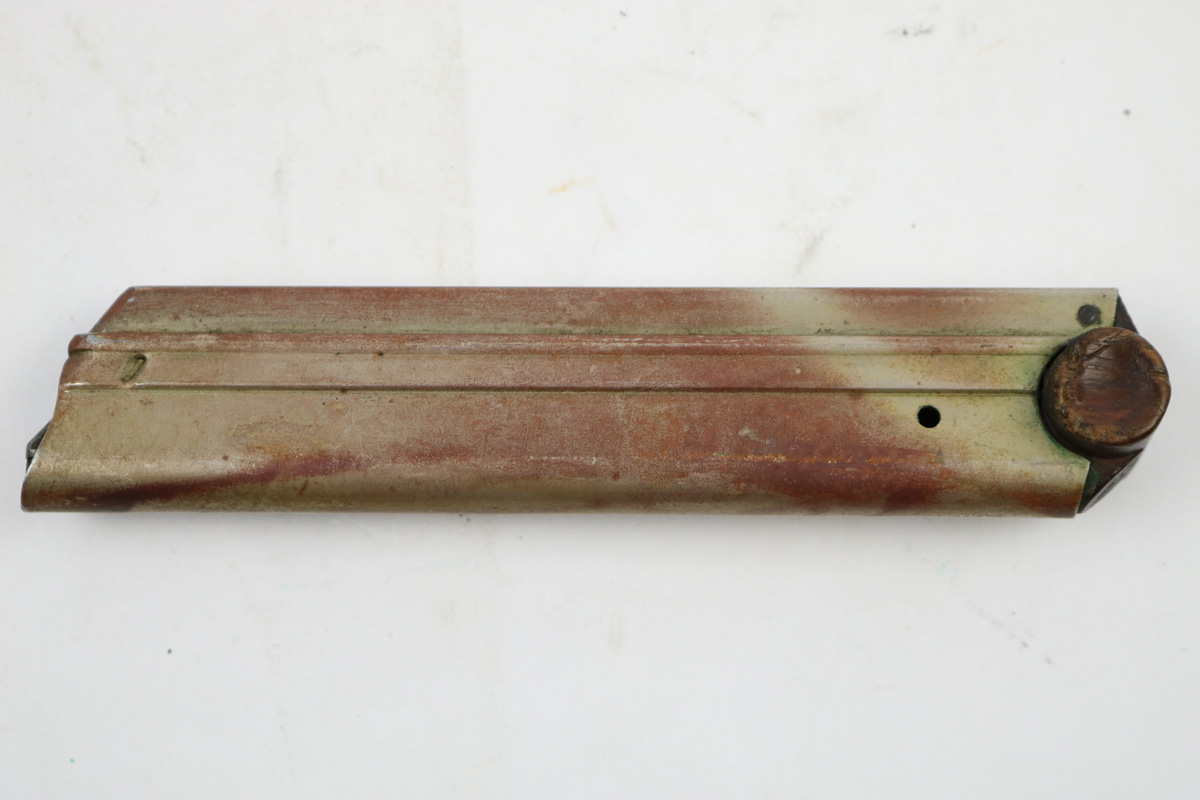 8/7/18 – This is an original WW1 production Luger magazine. The wood base has some light “chewing”/chipping on the ears – or ends of the base. The tube has a reddish discoloration, but I believe this is paint and not rust. The follower is discolored and worn, but the magazine is original and fully functional overall. The base is stamped with a serial number, but then appears to have another serial number beside or over top the original numbering. There are two imperial proof stamps. Guaranteed original.