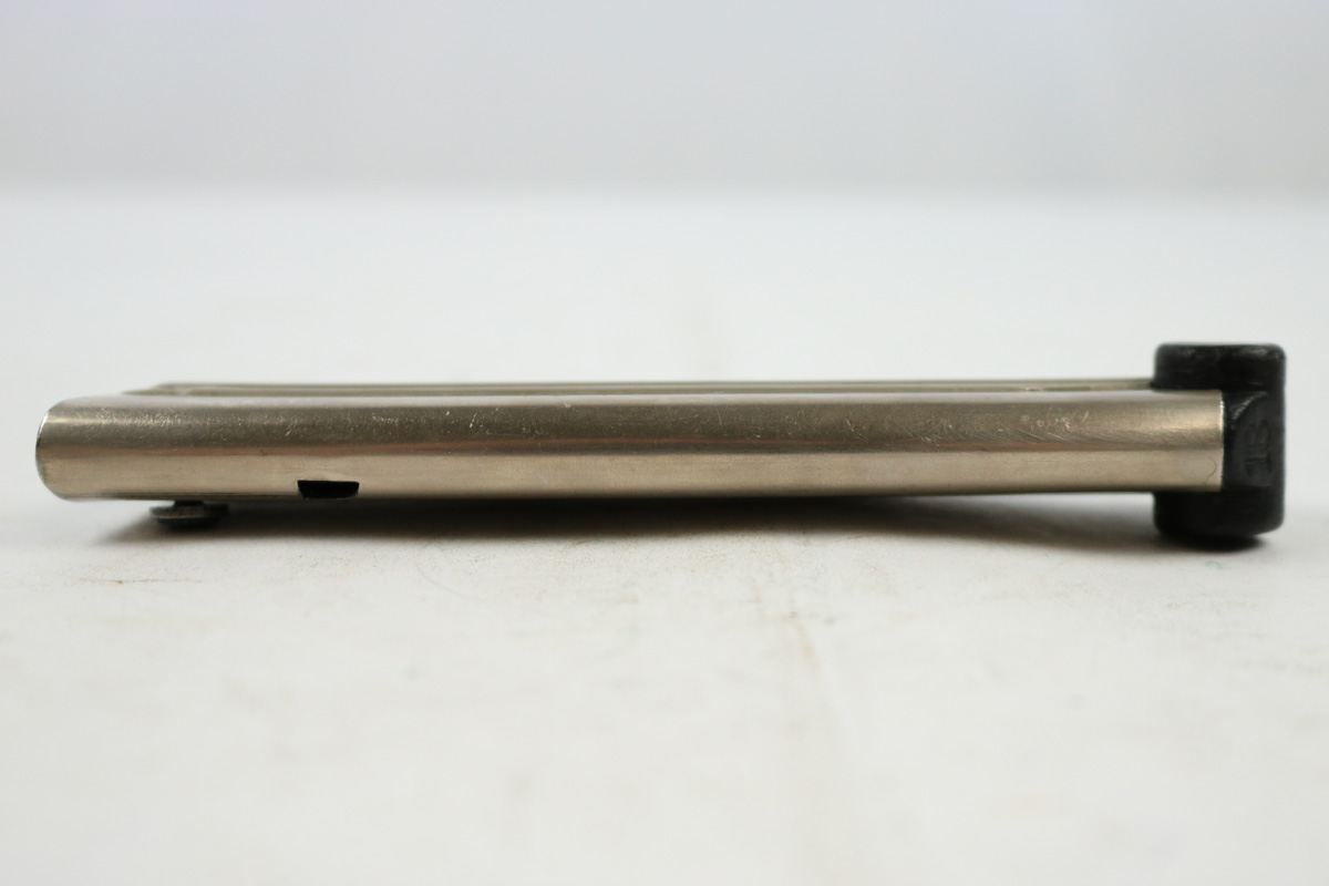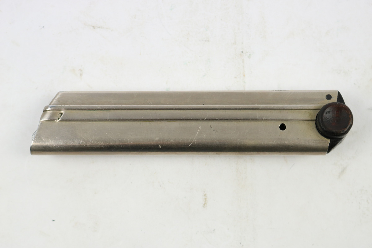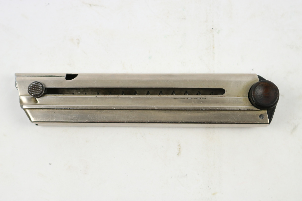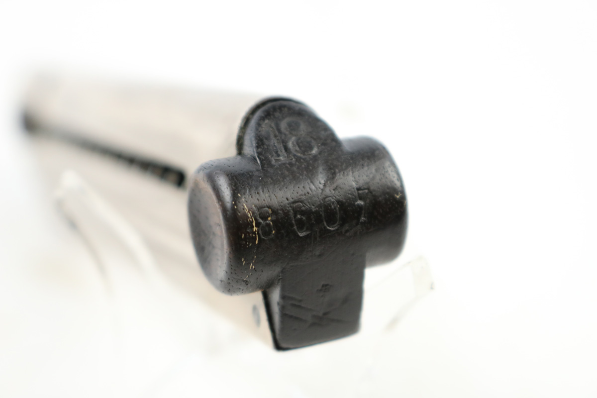 8/24/18 – This is an original WW1 production Luger magazine. The base of the magazine is wood, and serial numbered with a unit (or police) stamp “18”. There’s also a faint imperial proof stamp on the lower portion of the base. The base has no cracks or chips. The frame is excellent and original. The spring is fully functional. Guaranteed original.