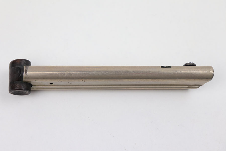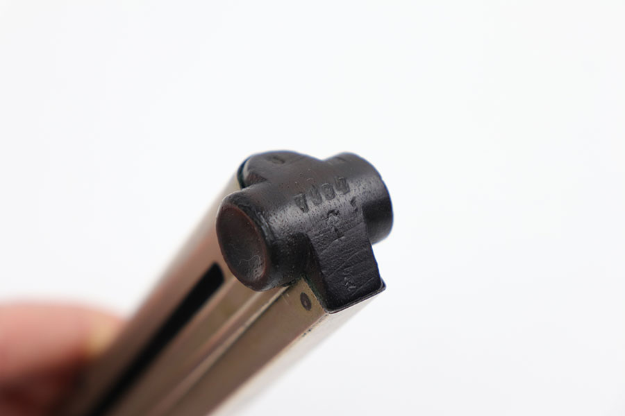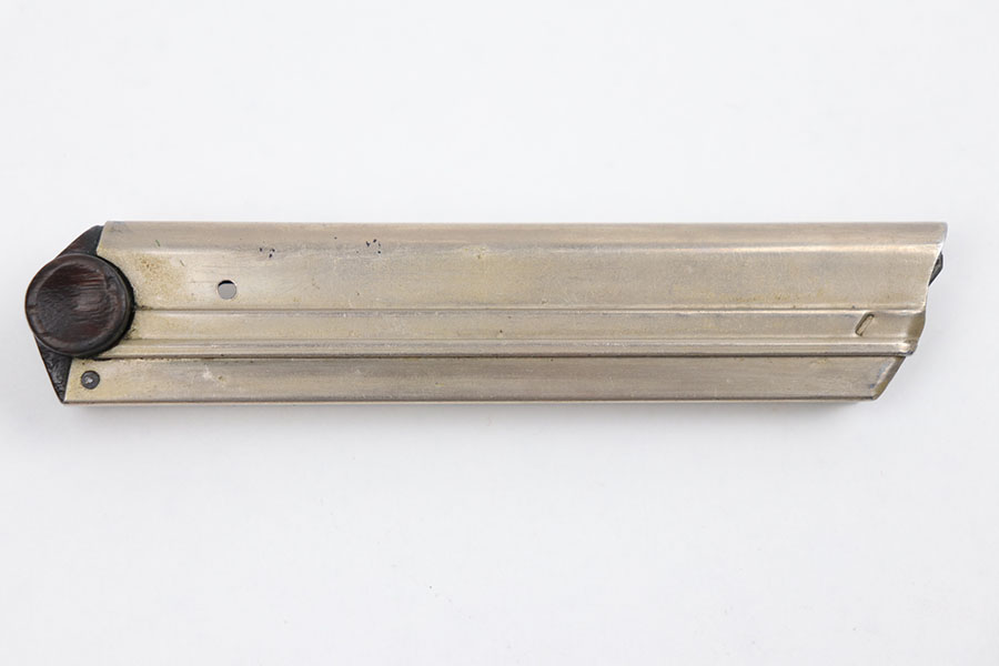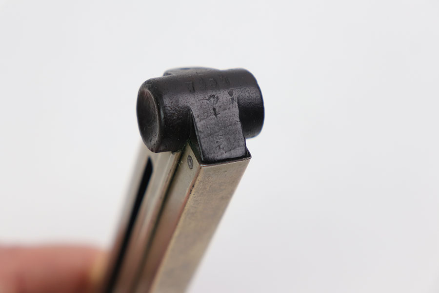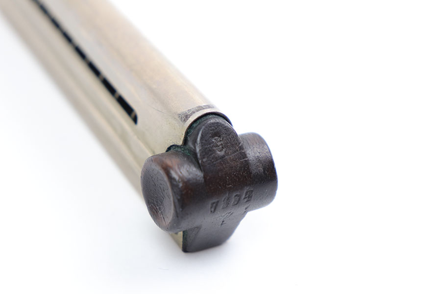 12/10/20 – This is an original WW1 production Luger magazine in excellent condition. The wood base is serial numbered 7394r, but we’re uncertain of the letter suffix because it’s faint. There is also an imperial proof stamp. The base has no cracks or chips. The tube is excellent as well with no rust or pitting, and the spring is strong.