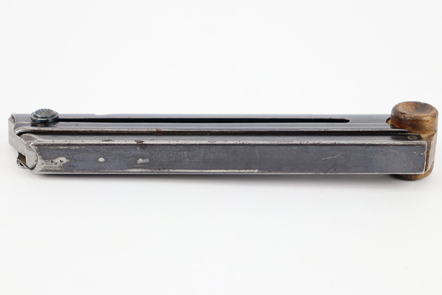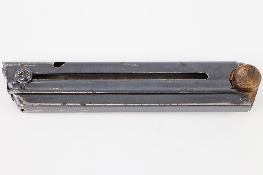 10/4/23 – This is a WW1 original Luger magazine with a blued tube and wood base. The tube is WW1 era original, as some commercial models came with blued magazines. The bluing shows signs of natural aging and some light finish loss but no major issues. Some small spots of surface rust beginning to form but this is mild. The base is in great shape with a visible serial number 3872c, and a plus sign underneath. Strong, smooth spring.