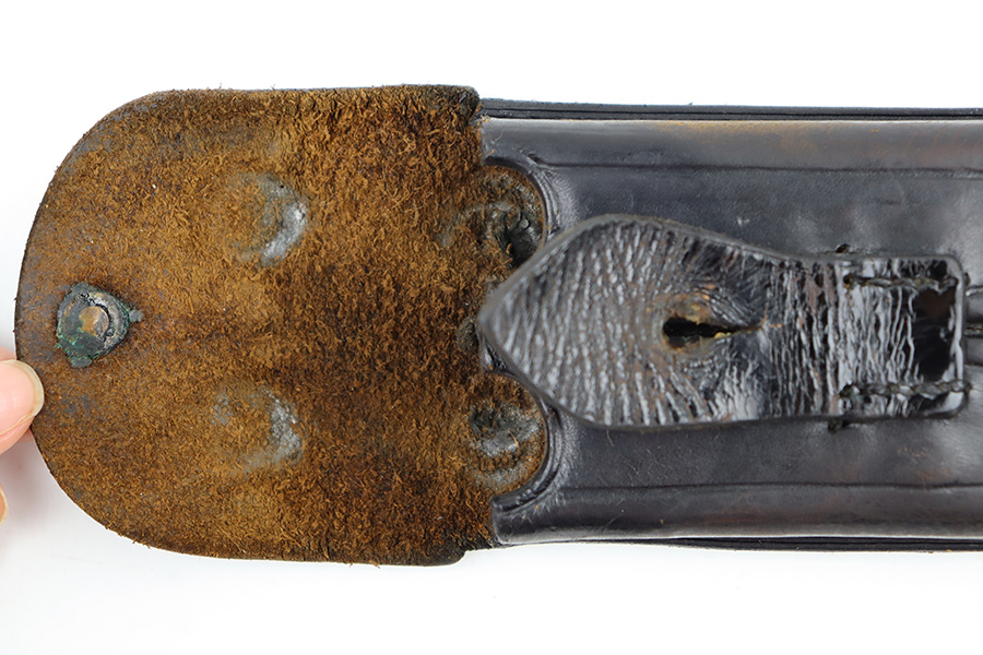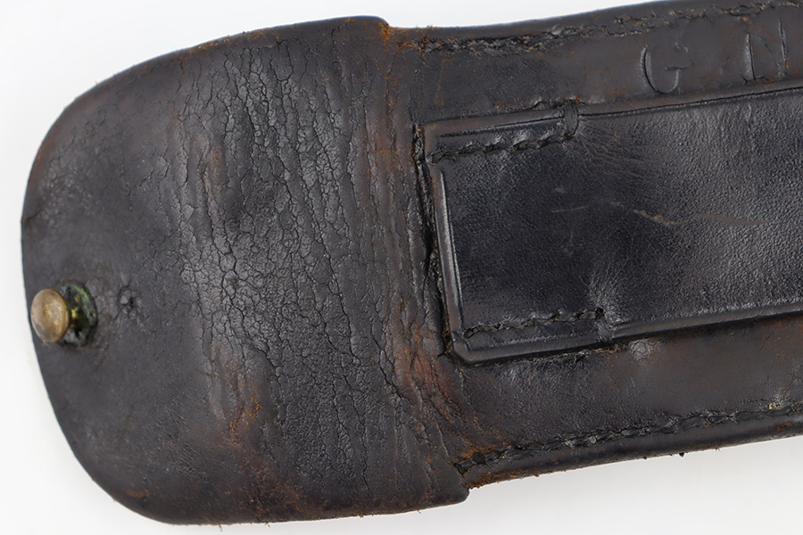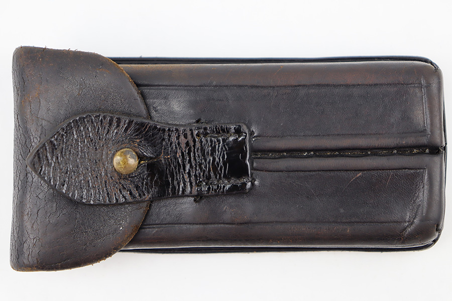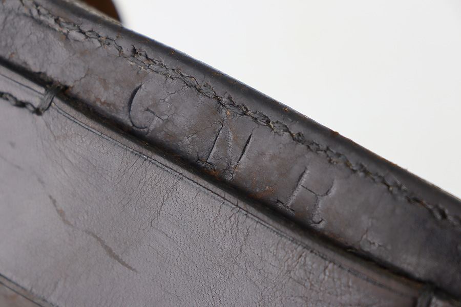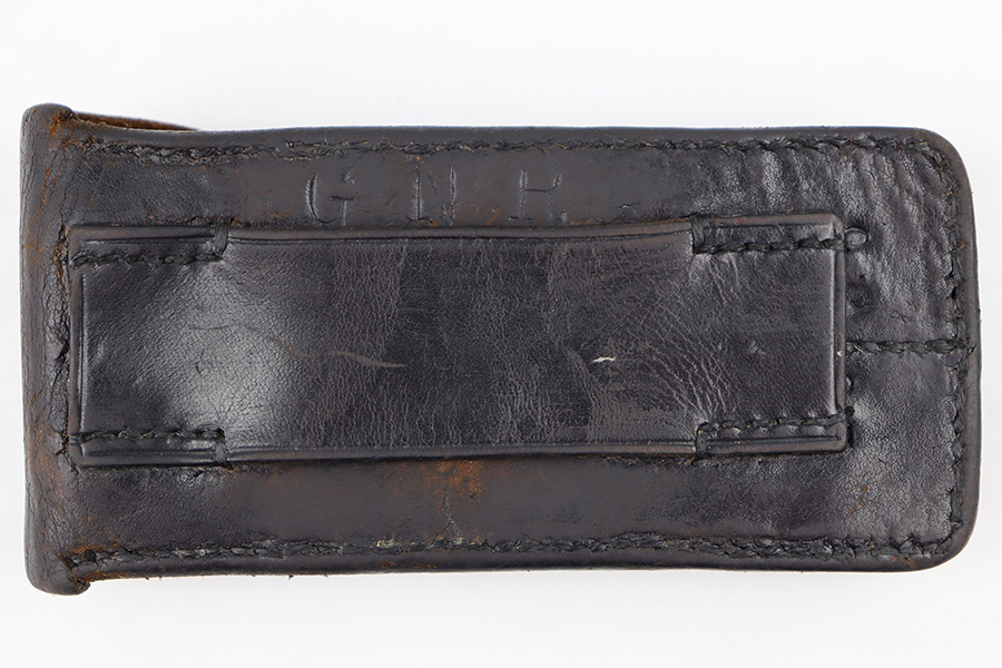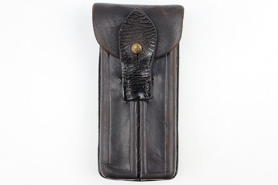 9/7/23 – This is an original WW1 era production dual-magazine pouch for a Luger pistol. These were originally made for use with Artillery models, but any luger magazine will fit. The leather is in great condition with normal use wear and aging throughout. No visible markings except for some initials on the back leather that were added post-factory. The stitching is all original and intact, except for a few loose stitches on the closure strap, which is still secure. Brass closure knob.