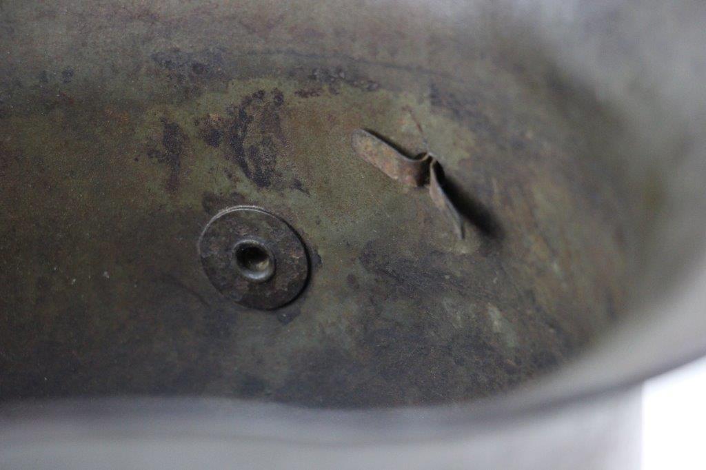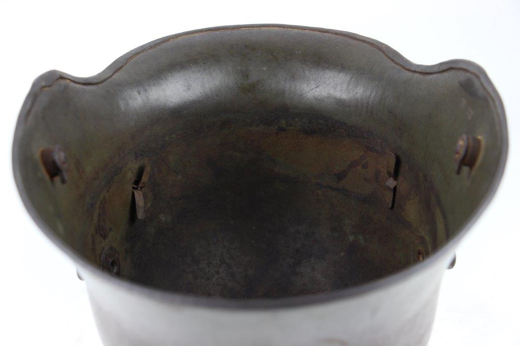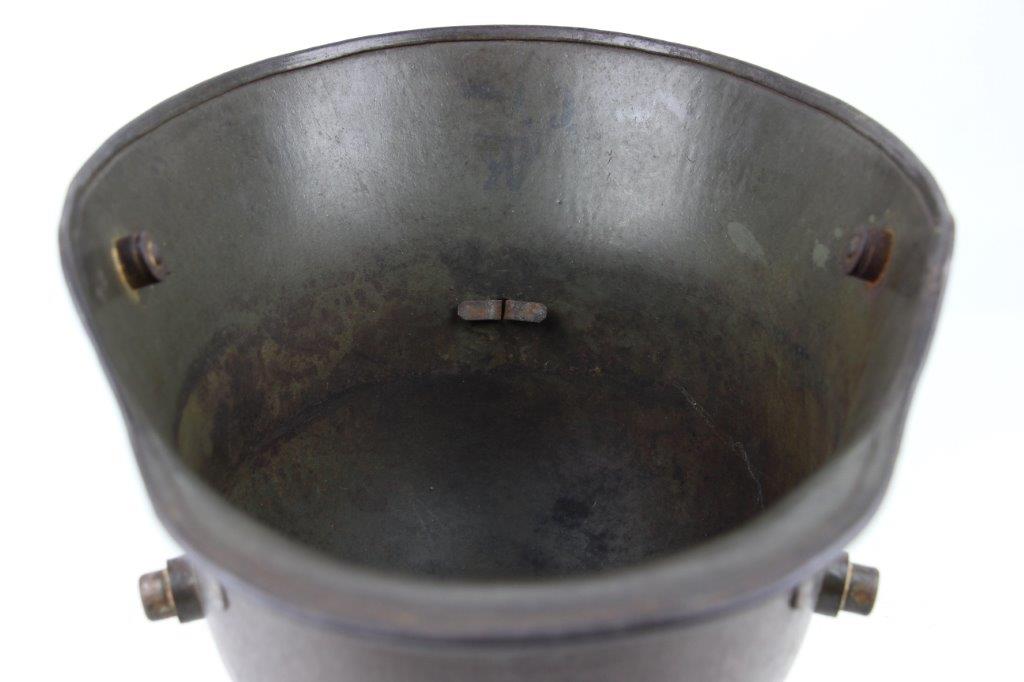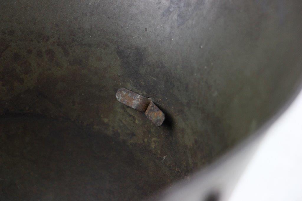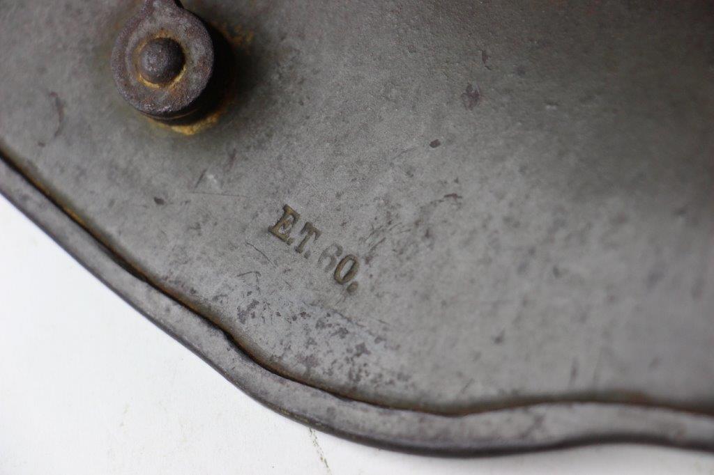 6/20/24 – This is an original WW1 German M1916 Helmet Shell. The helmet is in great condition with all original fixtures and all 3 original liner mounting rivets. The shell has natural surface patina throughout and mild aging wear but no dents or major issues. Original olive green field paint is still visible and mixed within the patina throughout the shell. The interior is maker and size stamped “E.T. 60”, as shown. No other markings. A great, straightforward field-worn example.