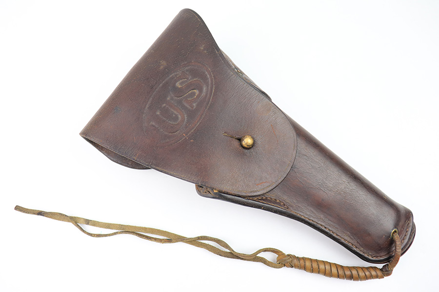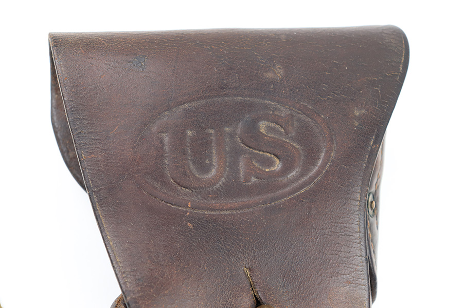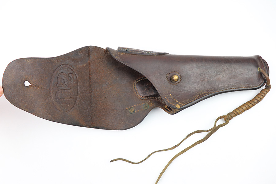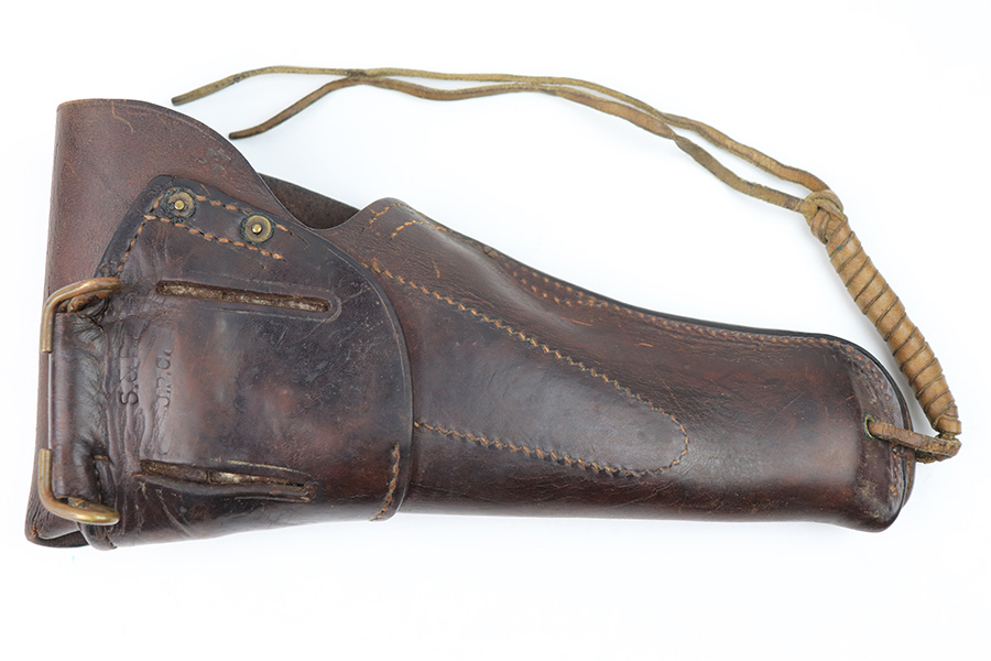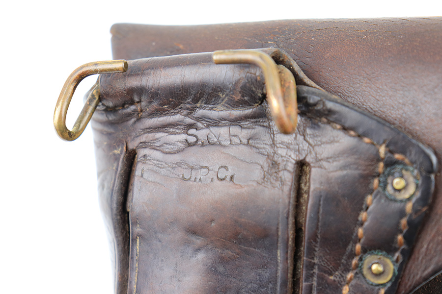 1/6/23 – This is an original WW1 production M1916 holster for a M1911 pistol. The holster is stamped on the back leather with a “S. & R.” maker and inspector initials “J.P.C.”. The leather is soft and pliable throughout, displaying honest wear and surface wrinkling on the exterior leather. There’s no major issues however, and all of the original stitching is intact.