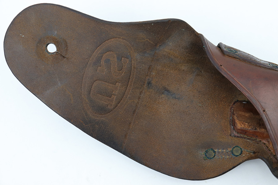 3/30/23 – This is an original WW1 production M1916 holster for a Colt M1911 pistol. The holster is in great condition with very nice dark brown leather that has normal pliability and light use wear. No excessive damage, and distinct US stamp on the front leather. The back leather is maker stamped, dated, and inspector initial stamped. The stitching is all original and intact.