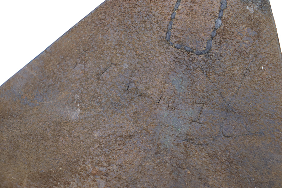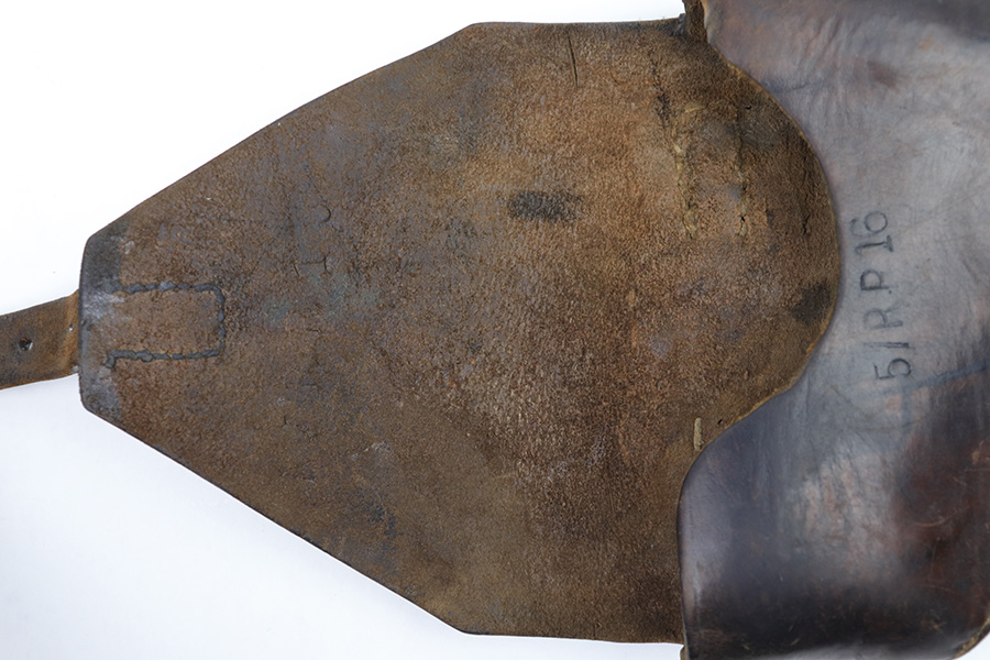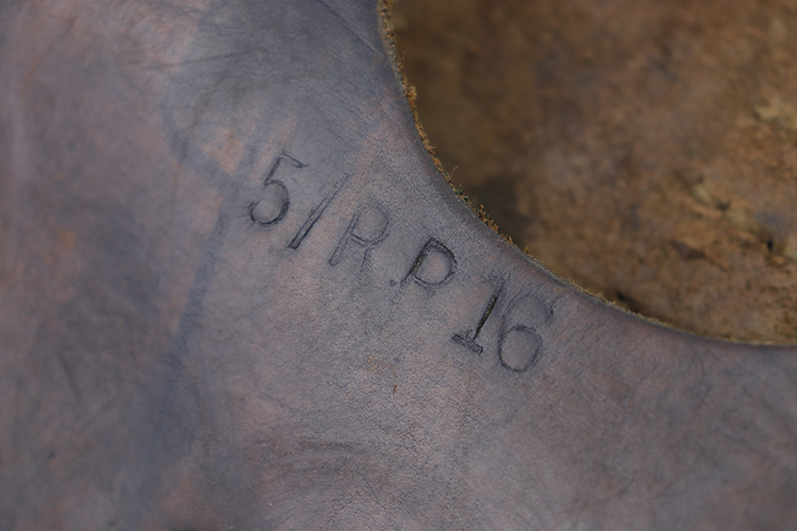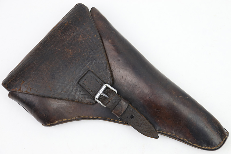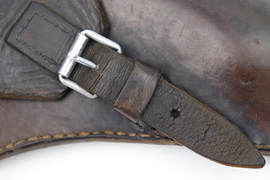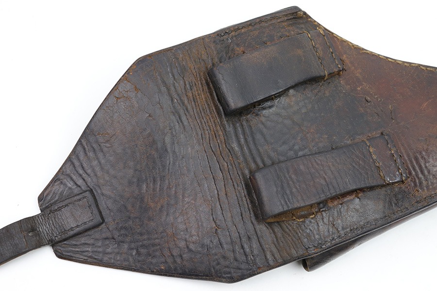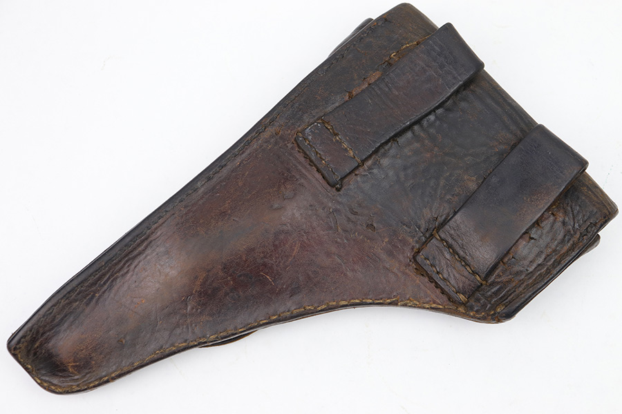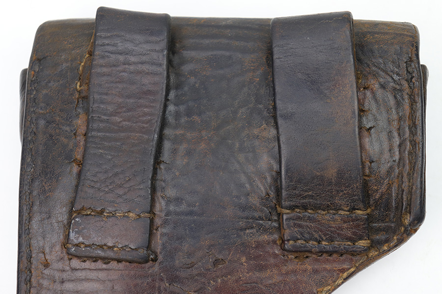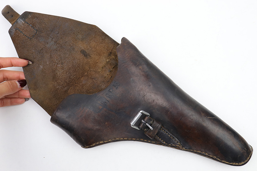 1/17/23 – This is a modified leather holster that fits a Luger pistol. The holster has unit stamp / number and letter markings on the interior lid and front leather, as shown. We’re not sure the significance but we think this is likely WW1 production based on the style and aging. The leather is soft and pliable with what looks like replacement belt loops. The stitching is aged and in great condition throughout the holster. Normal pliability.