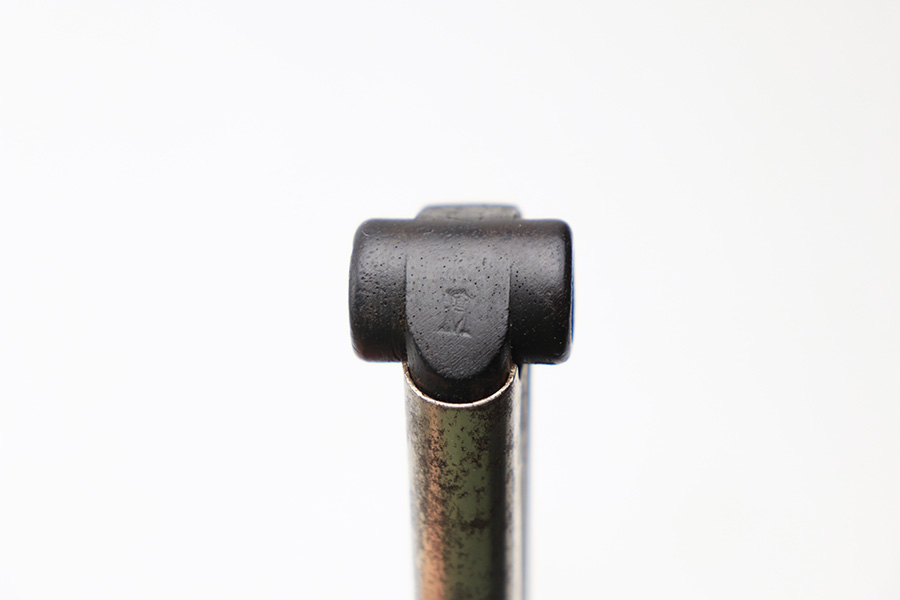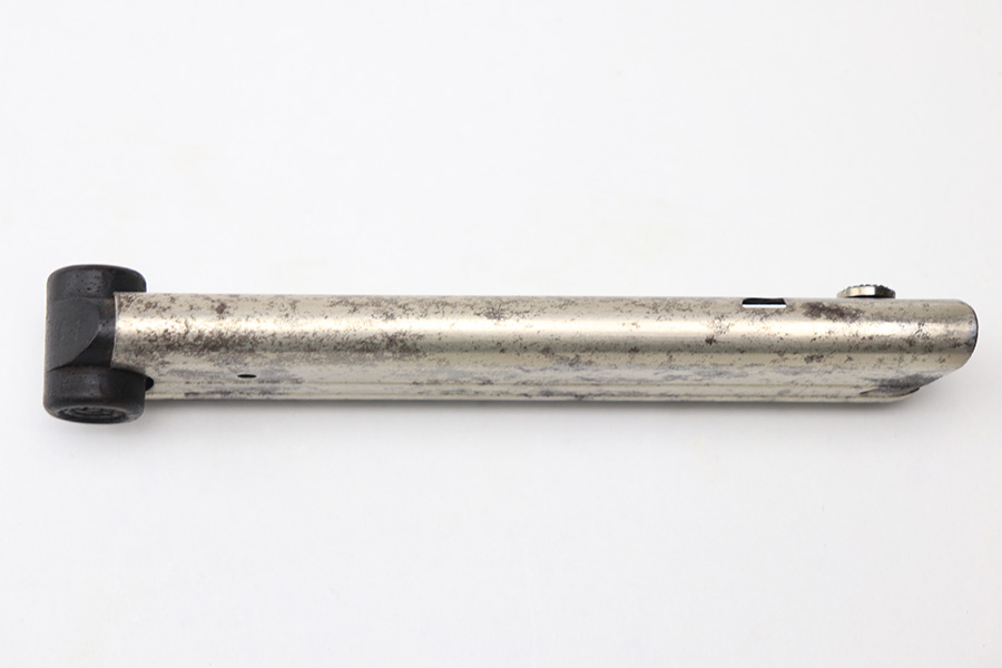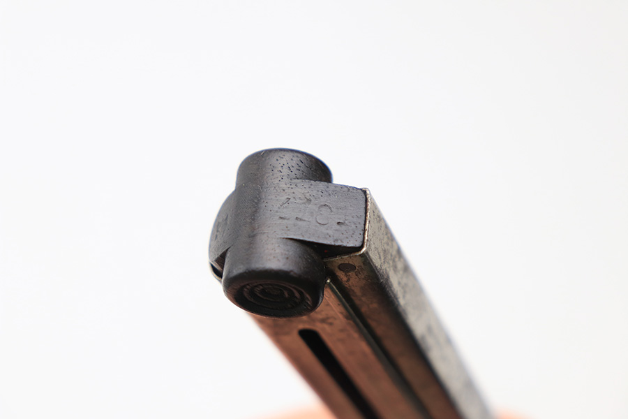 1/3/22 – This is a great example of a rare WW1 Navy Luger Magazine. The nickeled tube is in good condition with light patina throughout. The magazine’s bottom is made of a dark wood, and marked with serial number “4181” and a “Crown M” proof. Concentric circles on either side, or “ear” of the base.