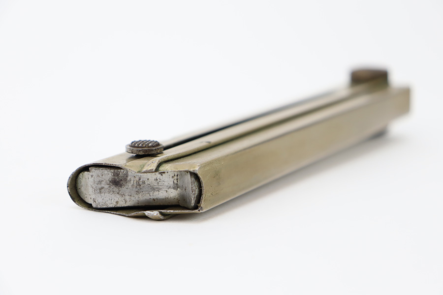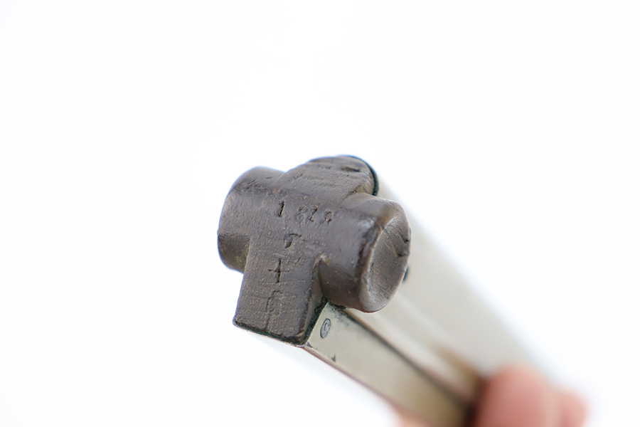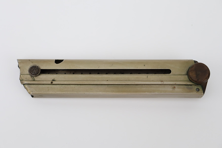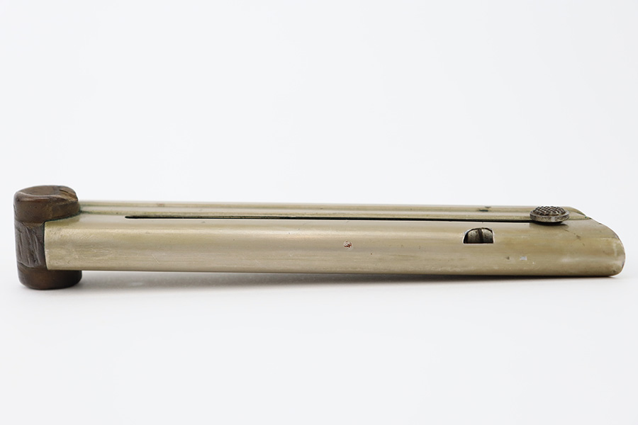11/14/23 – This is an original WW1 Luger magazine. The magazine has an excellent condition tube with some natural yellowing from age, but no rust or pitting. The wood base has no cracks or chips and is serial numbered 8571o. Strong, functional spring.