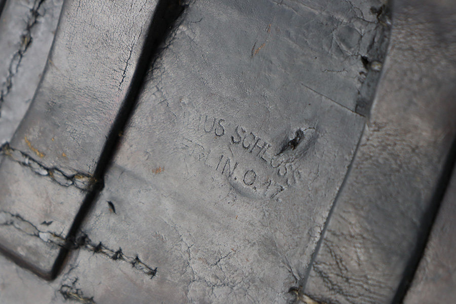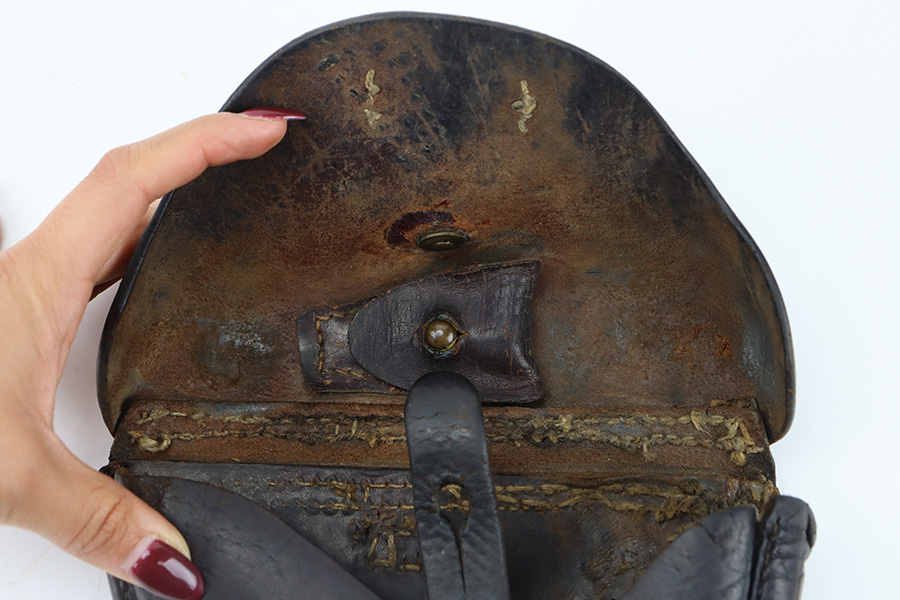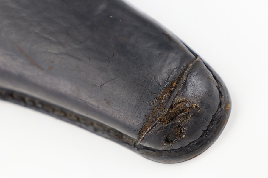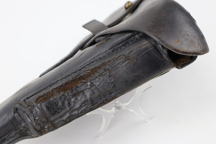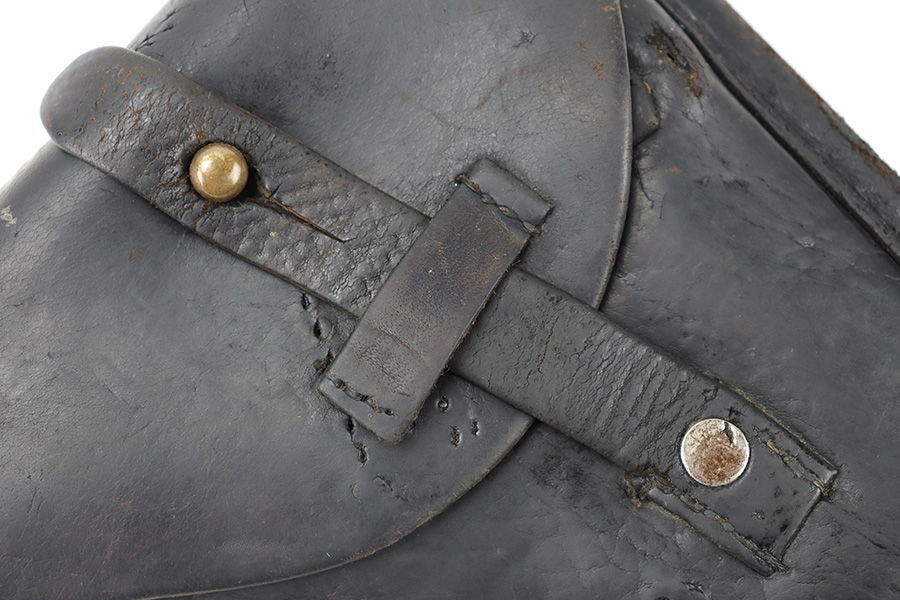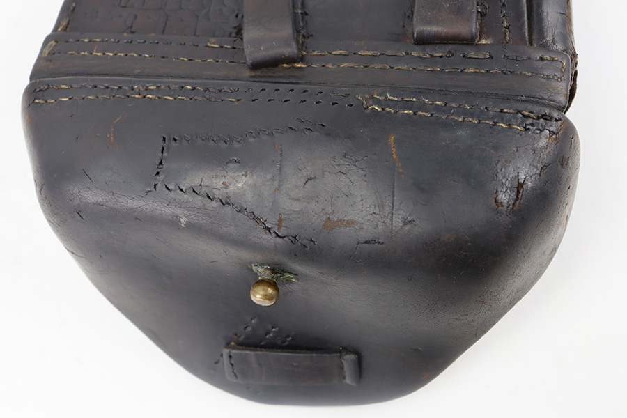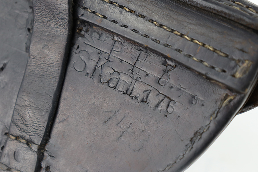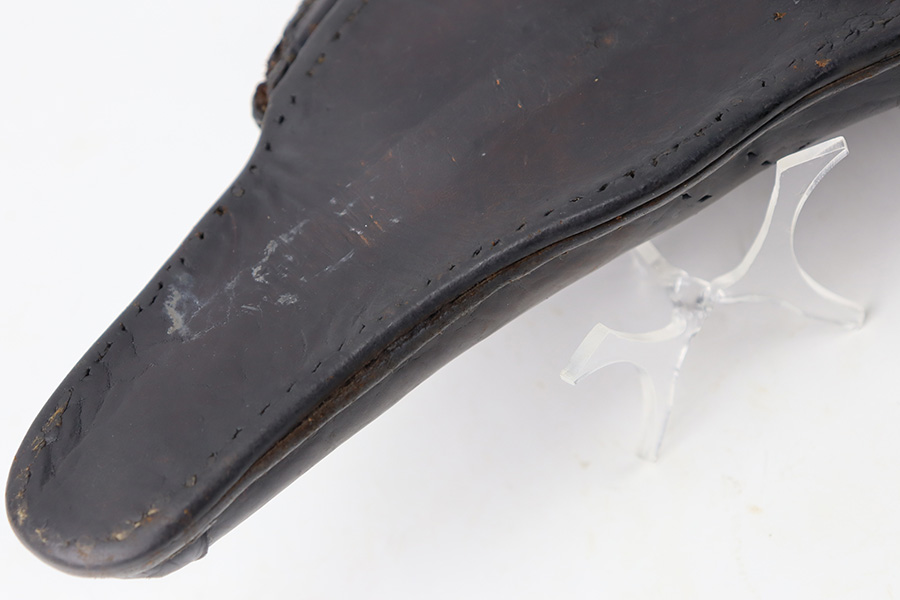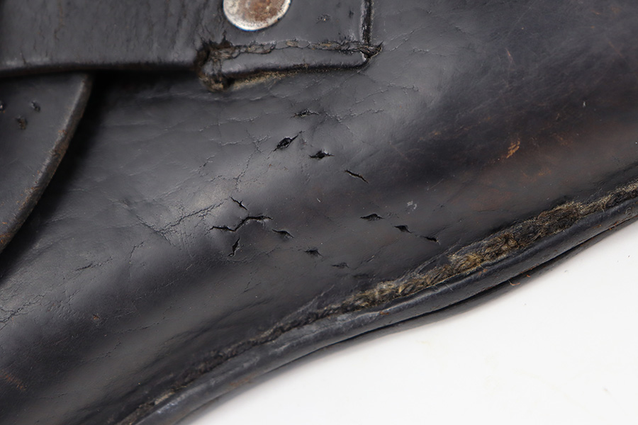 11/30/23 – This is an early, likely WW1 production Luger holster that was later modified into police style. We suspect this was a post-WW1 Weimar-era modified holster, but can’t be sure. The holster has multiple areas of empty stitch holes from the modifications performed, and there’s an added rivet on the closure strap as shown. The leather is soft and pliable throughout with aging and a repair at the front toe. The stitching near the toe is loose as well, causing some mild separation of the leather. Still structurally sound however.