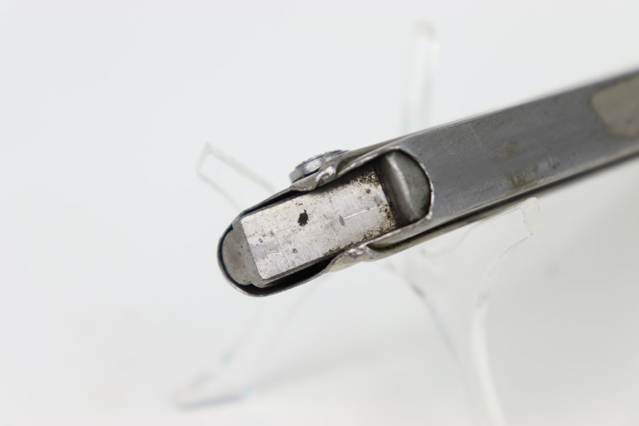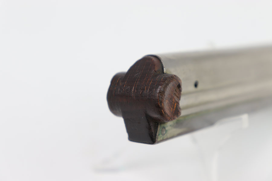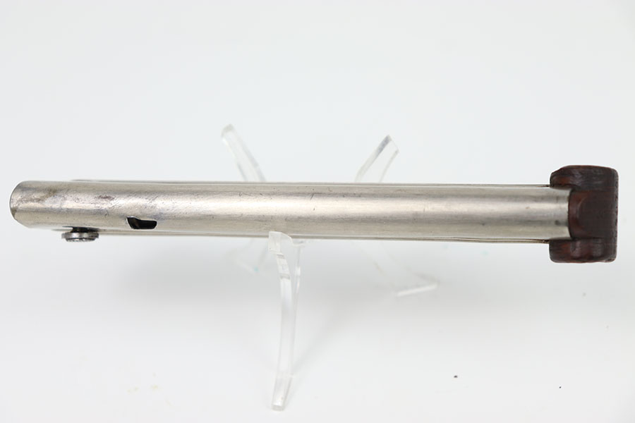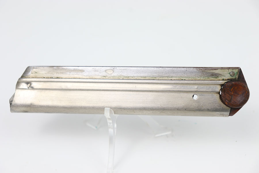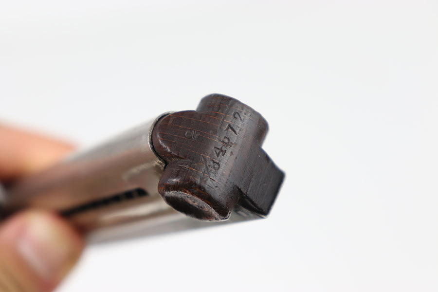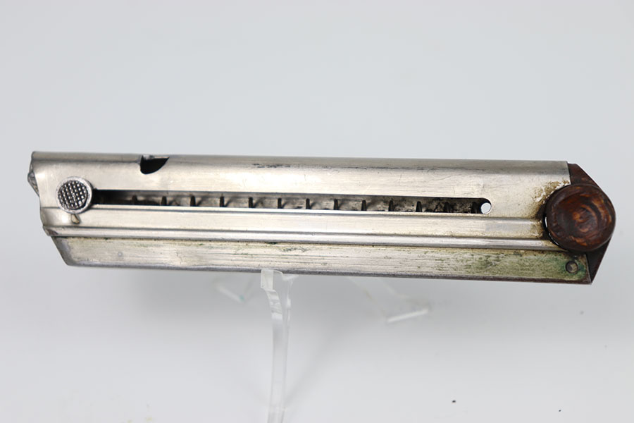 8/9/24 – This is a good example of an original Luger magazine from WW1. The nickeled tube presents minor surface patina mostly on the front and back spine of the magazine, and minor surface wear throughout. However, there are no signs of rust or pitting throughout the magazine. The wooden magazine base is in nice condition, presenting some honest signs of handling and age with one chip to the knob on the left side. The serial number is “84672” with no letter suffix underneath. The base is also numbered with a 2 indicating it is a police magazine. The magazine release notch has a slight indentation to it. The spring is strong, smooth, and functional.