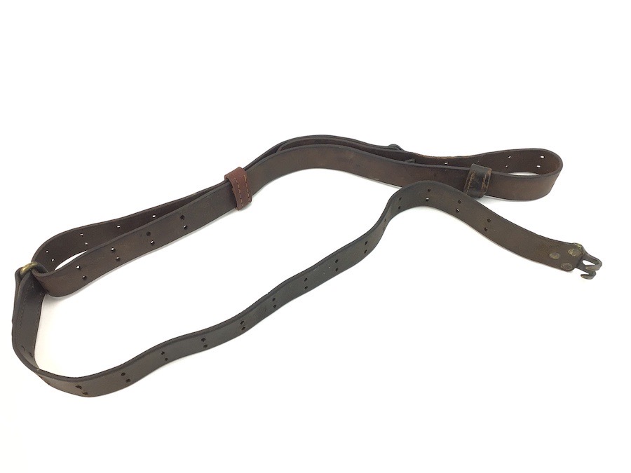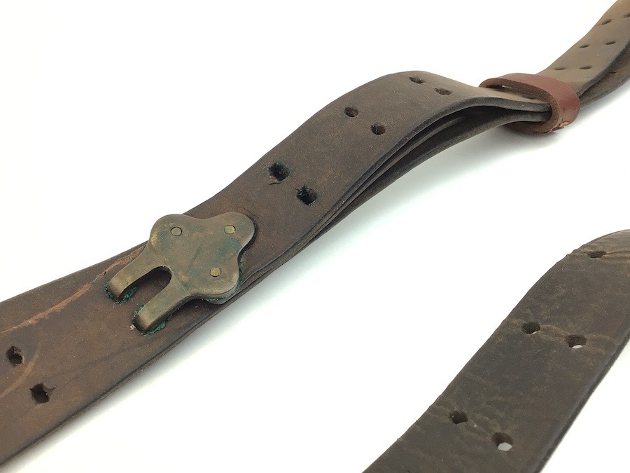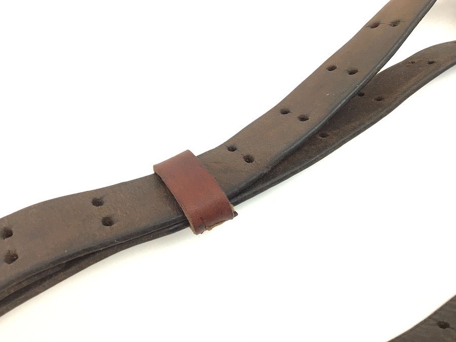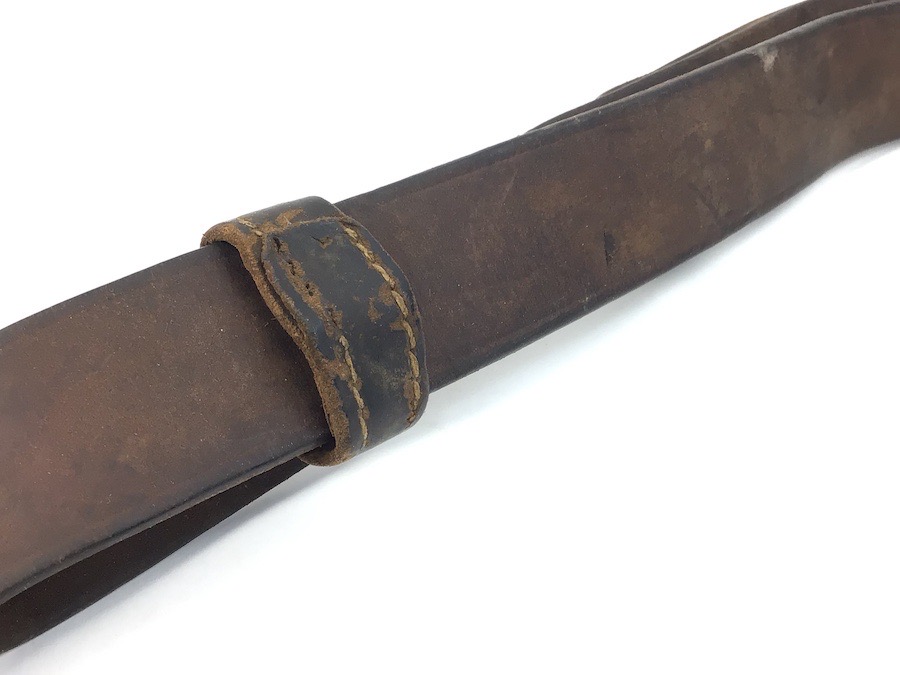 6/12/23 – This is an original WW1 era leather rifle sling. The sling/strap is in great condition – especially when accounting for its’ age. The leather has some minor surface wrinkling and wear, but no deep cracks or issues. The strap is maker stamped “I.S. Co.” as well as “WHF.” and a 1917 date stamp. Most of the stitching is intact except for a small area on one of the keepers. The other keeper appears to have been replaced as it is a slightly different color.