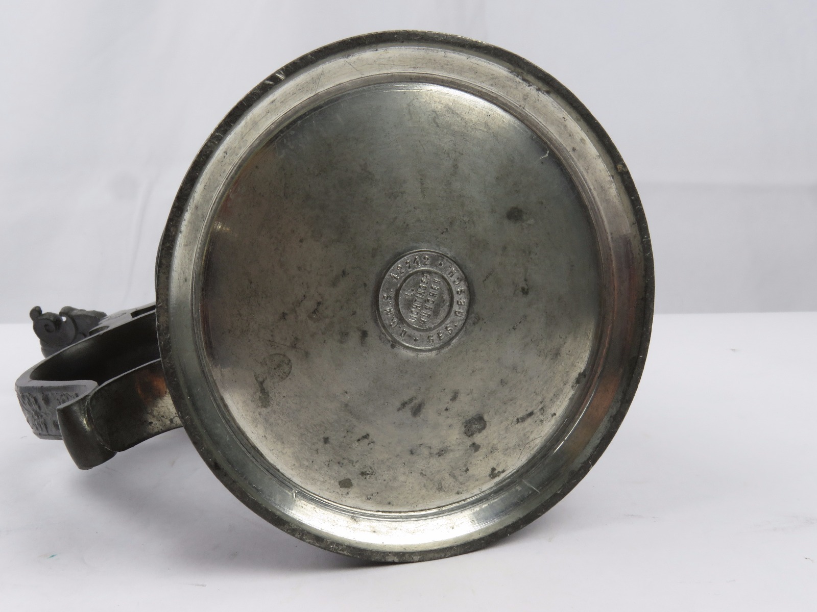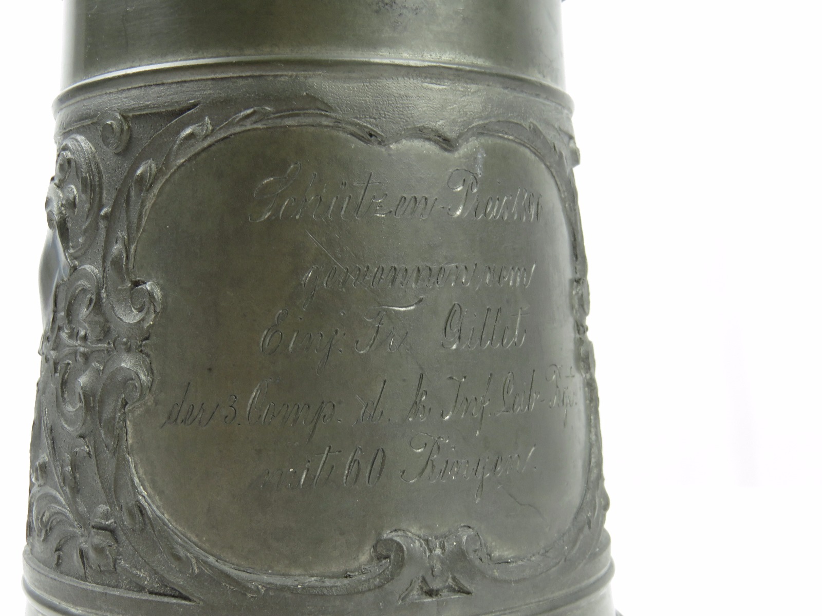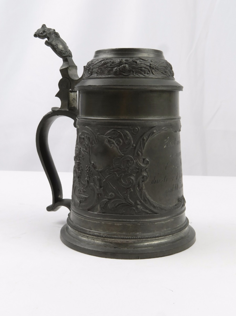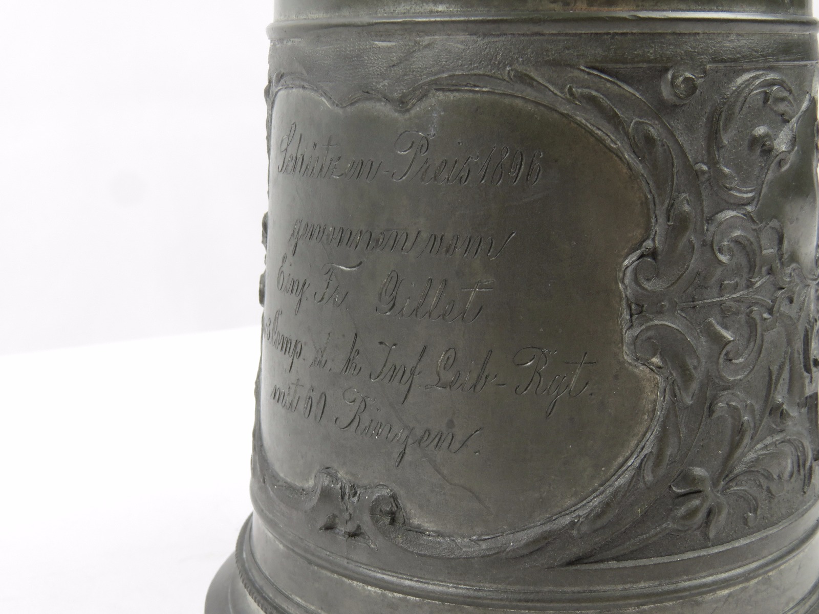 8/2/17 – This is an original pre WW1 production German Shooter’s Prize mug/stein. The mug is completely engraved and in 100% original condition. The inscription on the front of the mug is written in German cursive, but roughly translates to “1896 Shooting Prize awarded to the first year recruit Frederich Gillet of the 3rd Co. of Kaiser’s Infantry Guard Regiment with 60 rings.” This is a unique collectible piece in absolutely perfect condition. The interior has no staining or corrosion. The lid opens and shuts easily. The base is maker marked from Munchen. The engraving depicts demonic wine spirits, snapes, grapes, and hops. Guaranteed original.