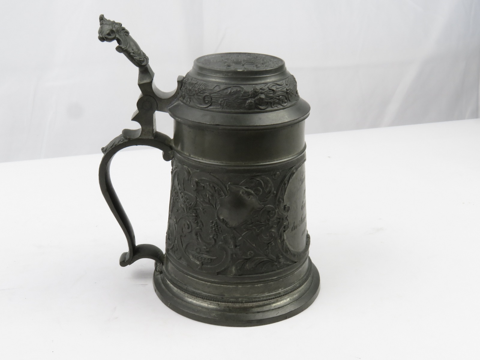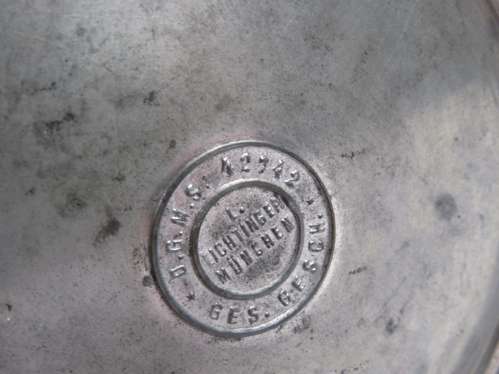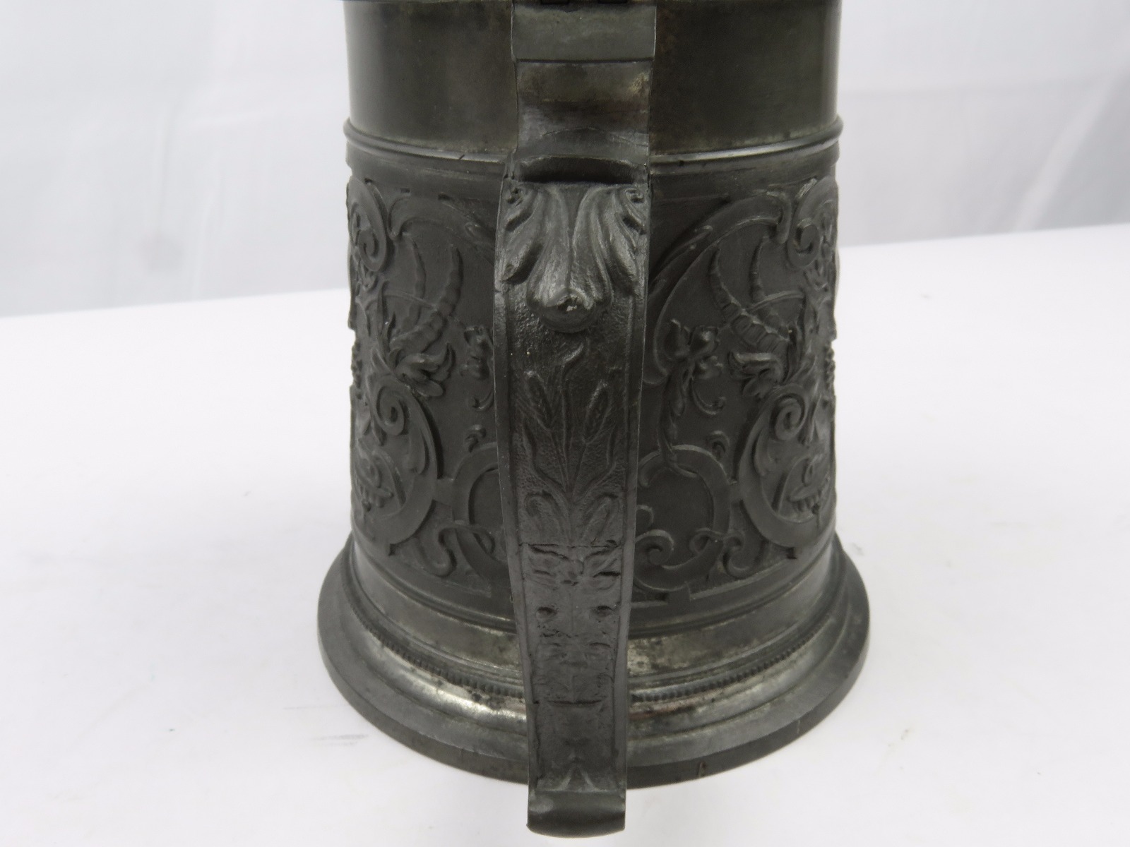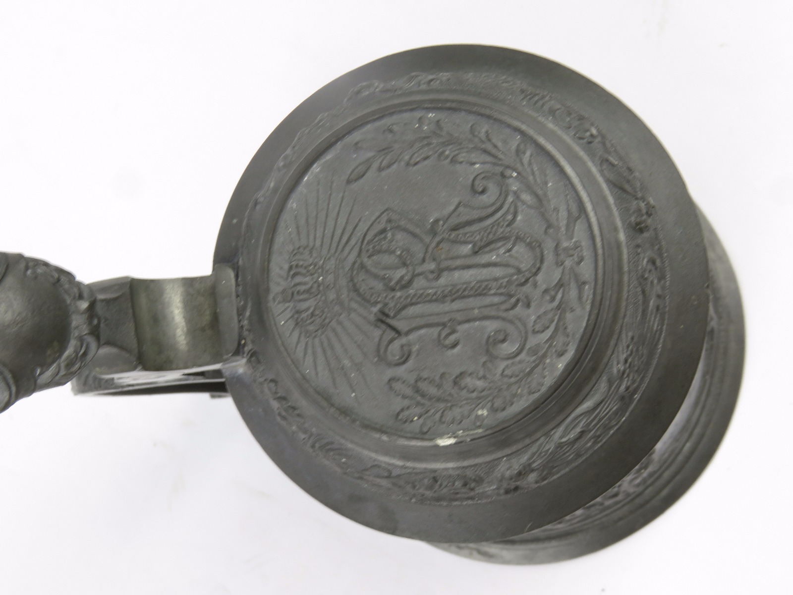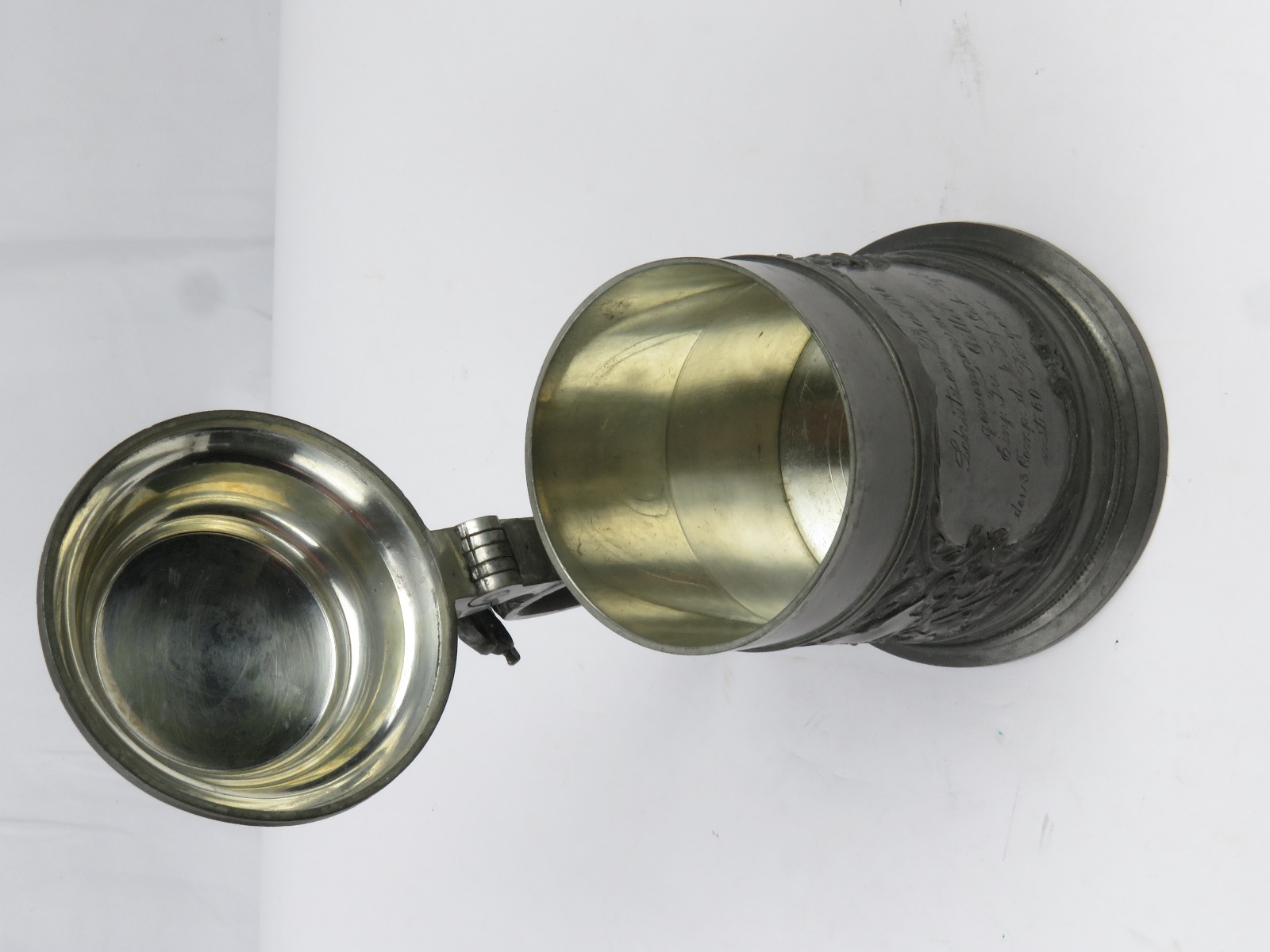 8/2/17 – This is an original pre WW1 production German Shooter’s Prize mug/stein. The mug is completely engraved and in 100% original condition. The inscription on the front of the mug is written in German cursive, but roughly translates to “1896 Shooting Prize awarded to the first year recruit Frederich Gillet of the 3rd Co. of Kaiser’s Infantry Guard Regiment with 60 rings.” This is a unique collectible piece in absolutely perfect condition. The interior has no staining or corrosion. The lid opens and shuts easily. The base is maker marked from Munchen. The engraving depicts demonic wine spirits, snapes, grapes, and hops. Guaranteed original.