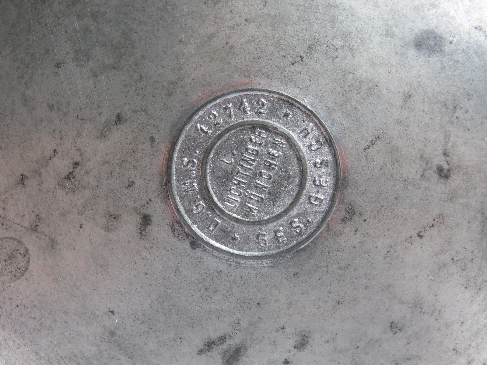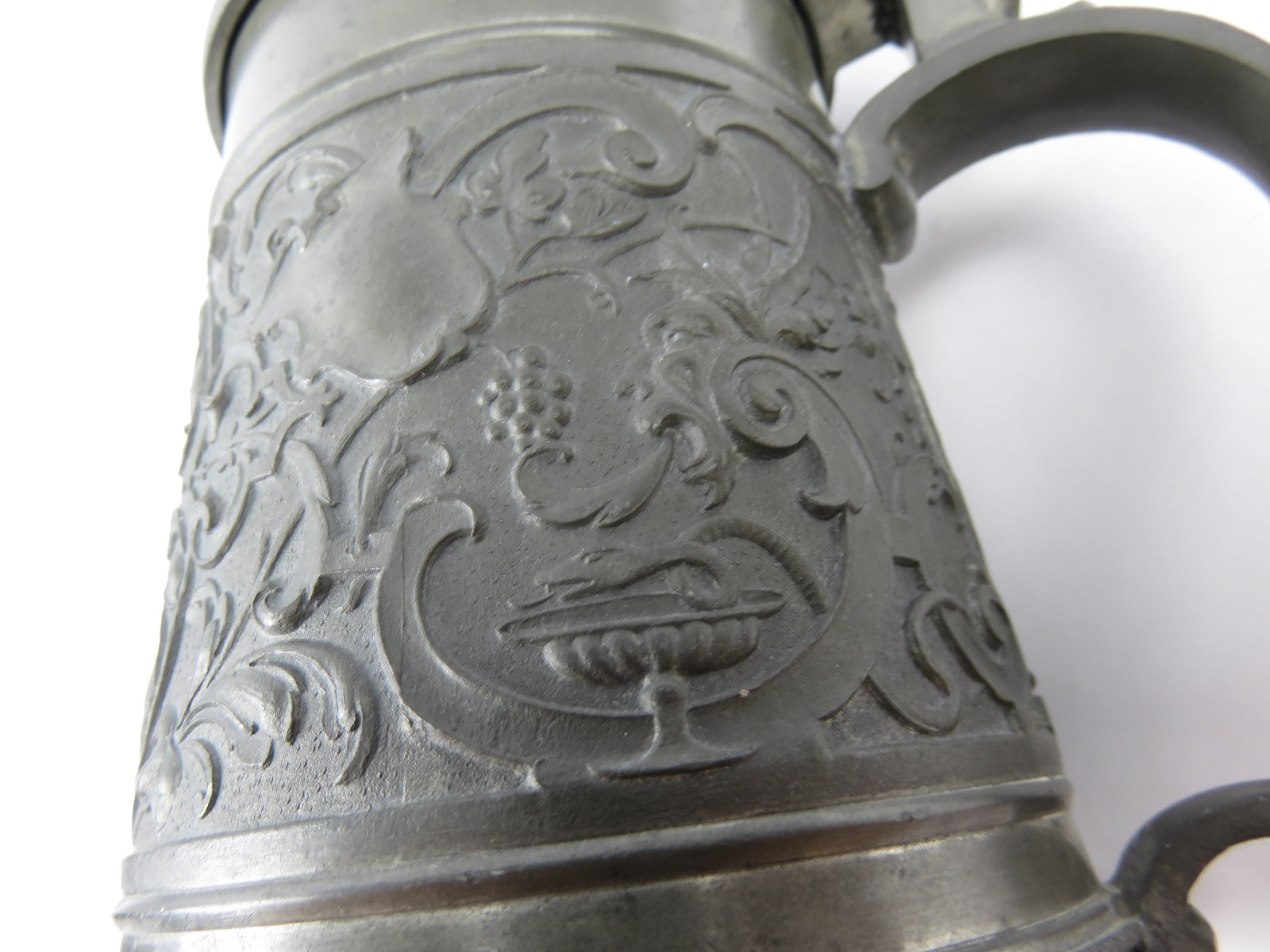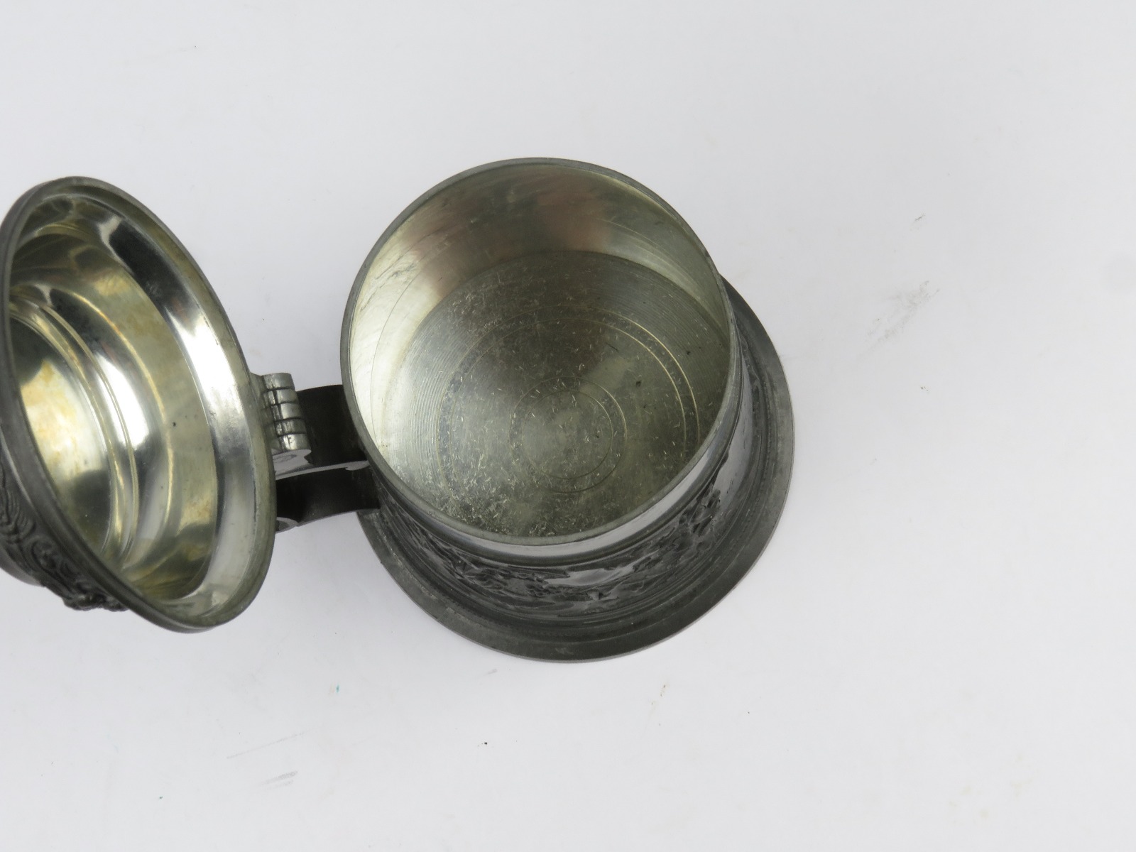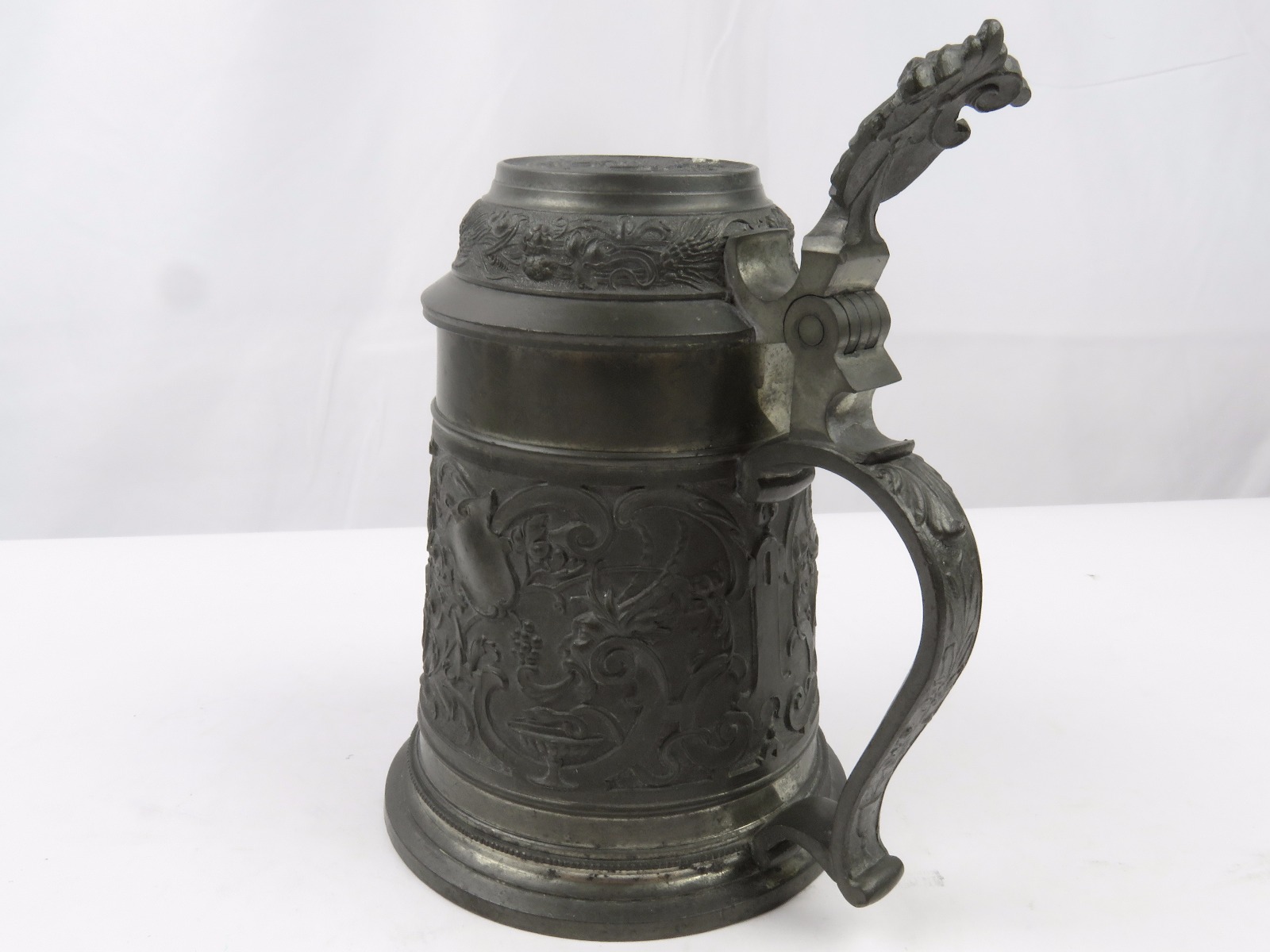 8/2/17 – This is an original pre WW1 production German Shooter’s Prize mug/stein. The mug is completely engraved and in 100% original condition. The inscription on the front of the mug is written in German cursive, but roughly translates to “1896 Shooting Prize awarded to the first year recruit Frederich Gillet of the 3rd Co. of Kaiser’s Infantry Guard Regiment with 60 rings.” This is a unique collectible piece in absolutely perfect condition. The interior has no staining or corrosion. The lid opens and shuts easily. The base is maker marked from Munchen. The engraving depicts demonic wine spirits, snapes, grapes, and hops. Guaranteed original.