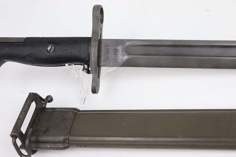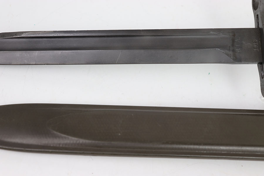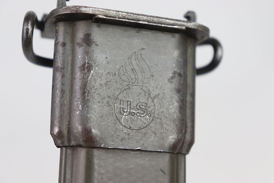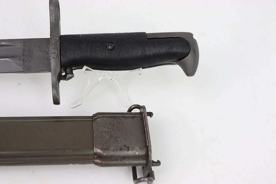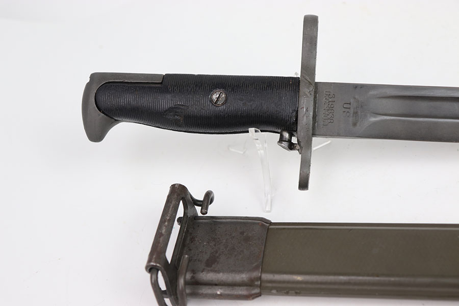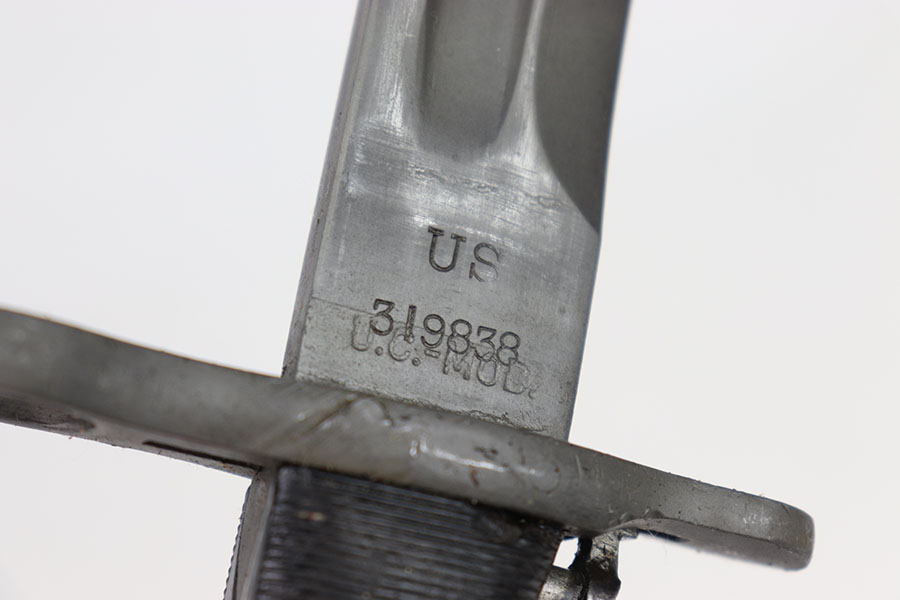 5/29/24 – This is a good example of an original WW1 Springfield US M1905 Cut Bayonet made by Rock Island Arsenal in 1918. This example has good blade that has been cut down to 10 inches. The blade looks to have been refinished as there is little scabbard marks or signs of additional sharpening. There are some dents on the flat top side of the blade. The blade is marked RIA 1918 on one side and US with the serial number on the other. That same side has a lightly struck “U.C. Mod” marking over the serial which could have been a modification in WW2. The grips are in average condition due to one having a moderate chunk taken out of it as seen in the photos. Nice hand guard and pommel. The Scabbard is in good shape with one chip at the tip and some patina throughout the metal side. One side of the scabbard is marked with the flaming bomb. Locking mechanism works as it should.