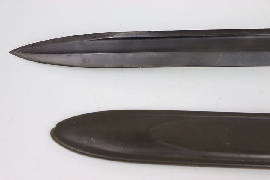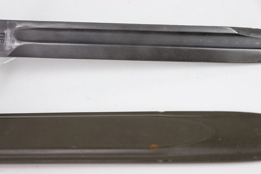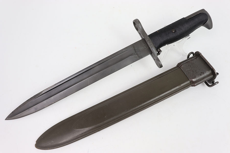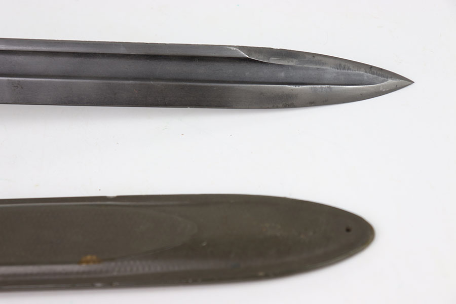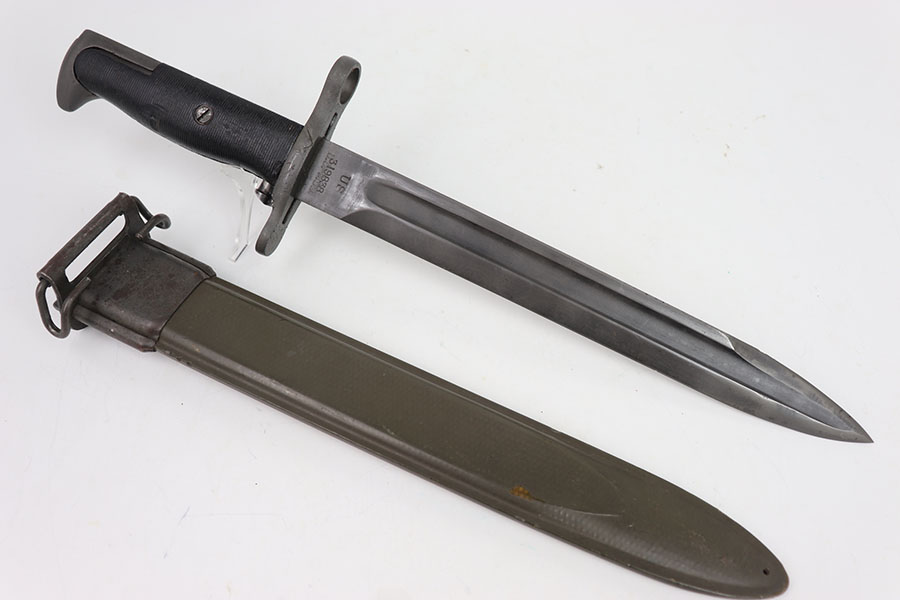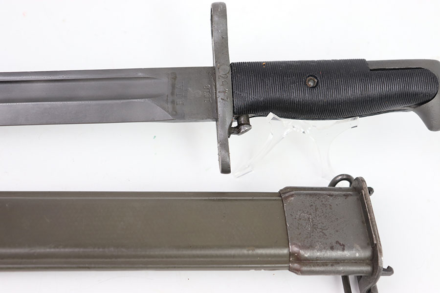 5/29/24 – This is a good example of an original WW1 Springfield US M1905 Cut Bayonet made by Rock Island Arsenal in 1918. This example has good blade that has been cut down to 10 inches. The blade looks to have been refinished as there is little scabbard marks or signs of additional sharpening. There are some dents on the flat top side of the blade. The blade is marked RIA 1918 on one side and US with the serial number on the other. That same side has a lightly struck “U.C. Mod” marking over the serial which could have been a modification in WW2. The grips are in average condition due to one having a moderate chunk taken out of it as seen in the photos. Nice hand guard and pommel. The Scabbard is in good shape with one chip at the tip and some patina throughout the metal side. One side of the scabbard is marked with the flaming bomb. Locking mechanism works as it should.