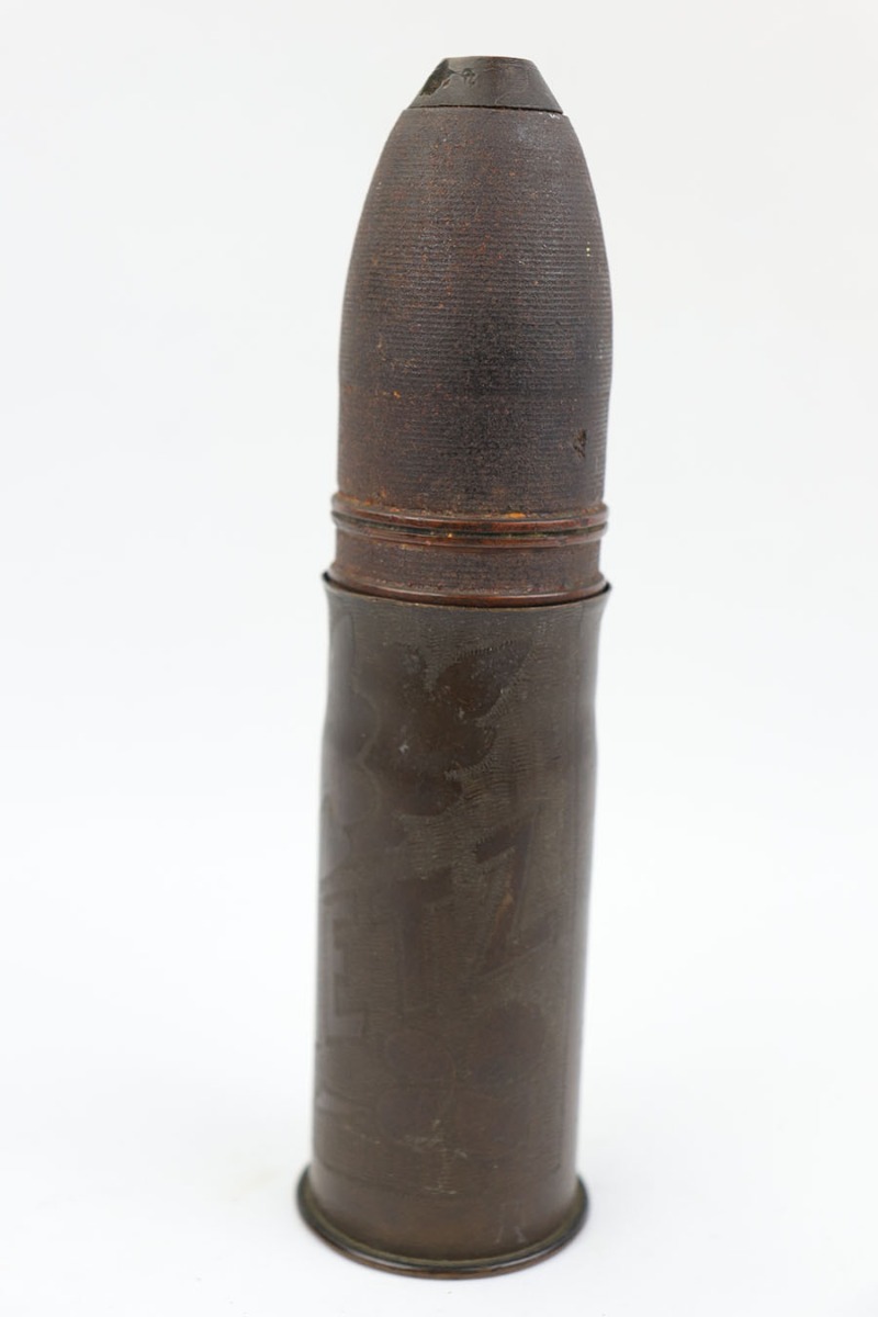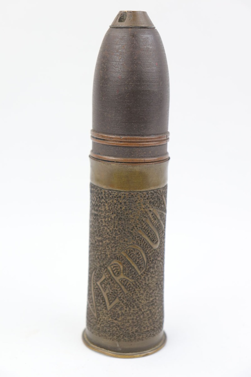 3/20/20 – This small lot of items includes two WW1 trench-art inert mortar shells, and a US AEF medal from WW1. The shells are marked “Verdun” and “Metz” – each with a unique design. The medal is in great condition with the original ribbon, lapel pin, and US button. See photos.