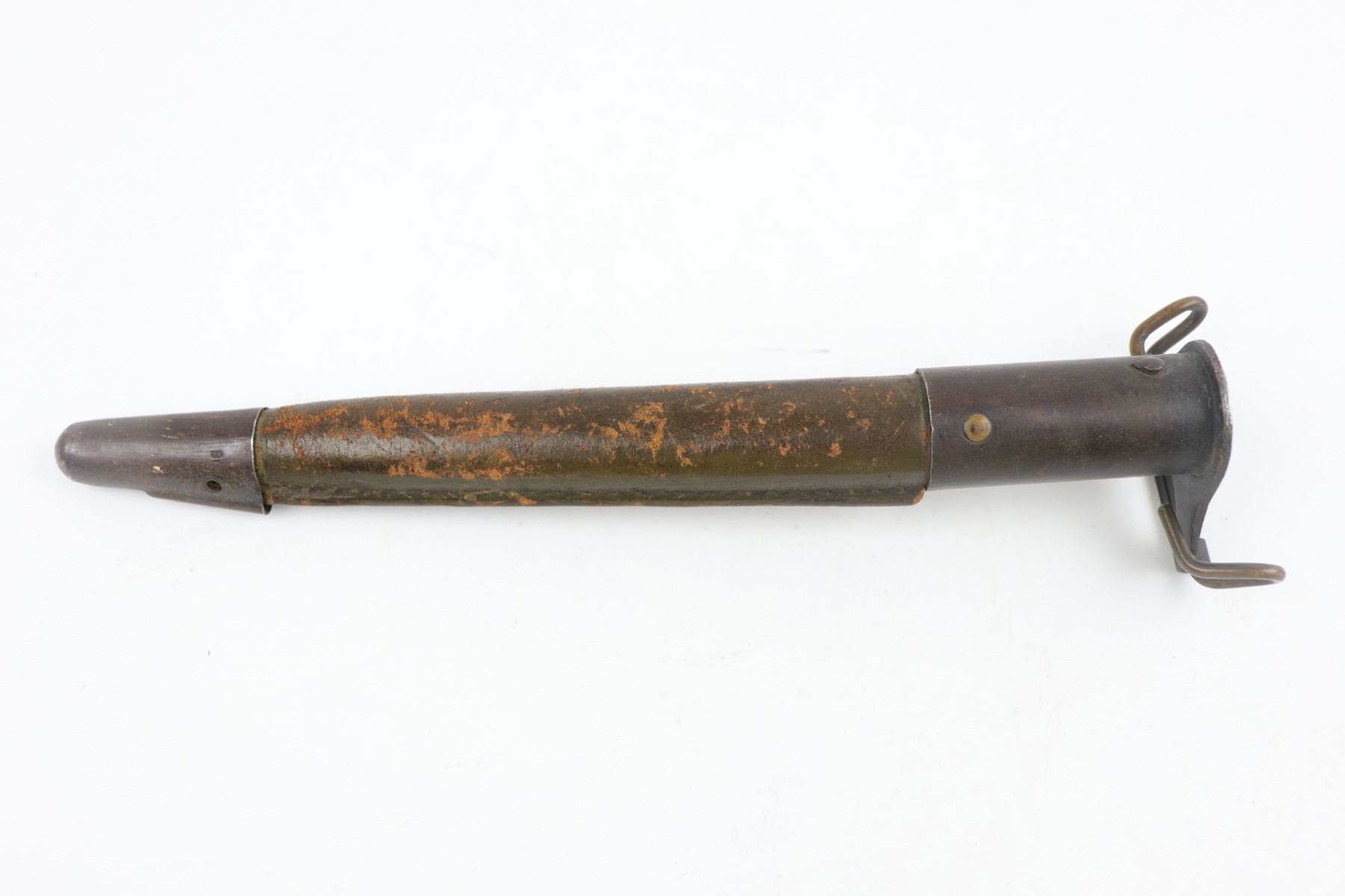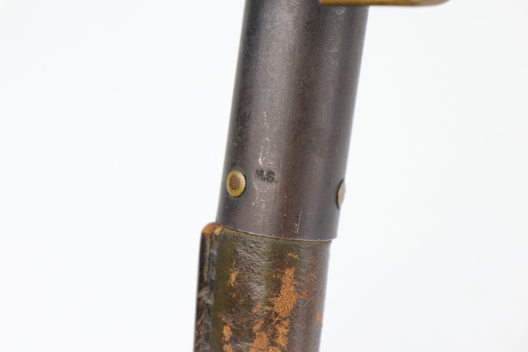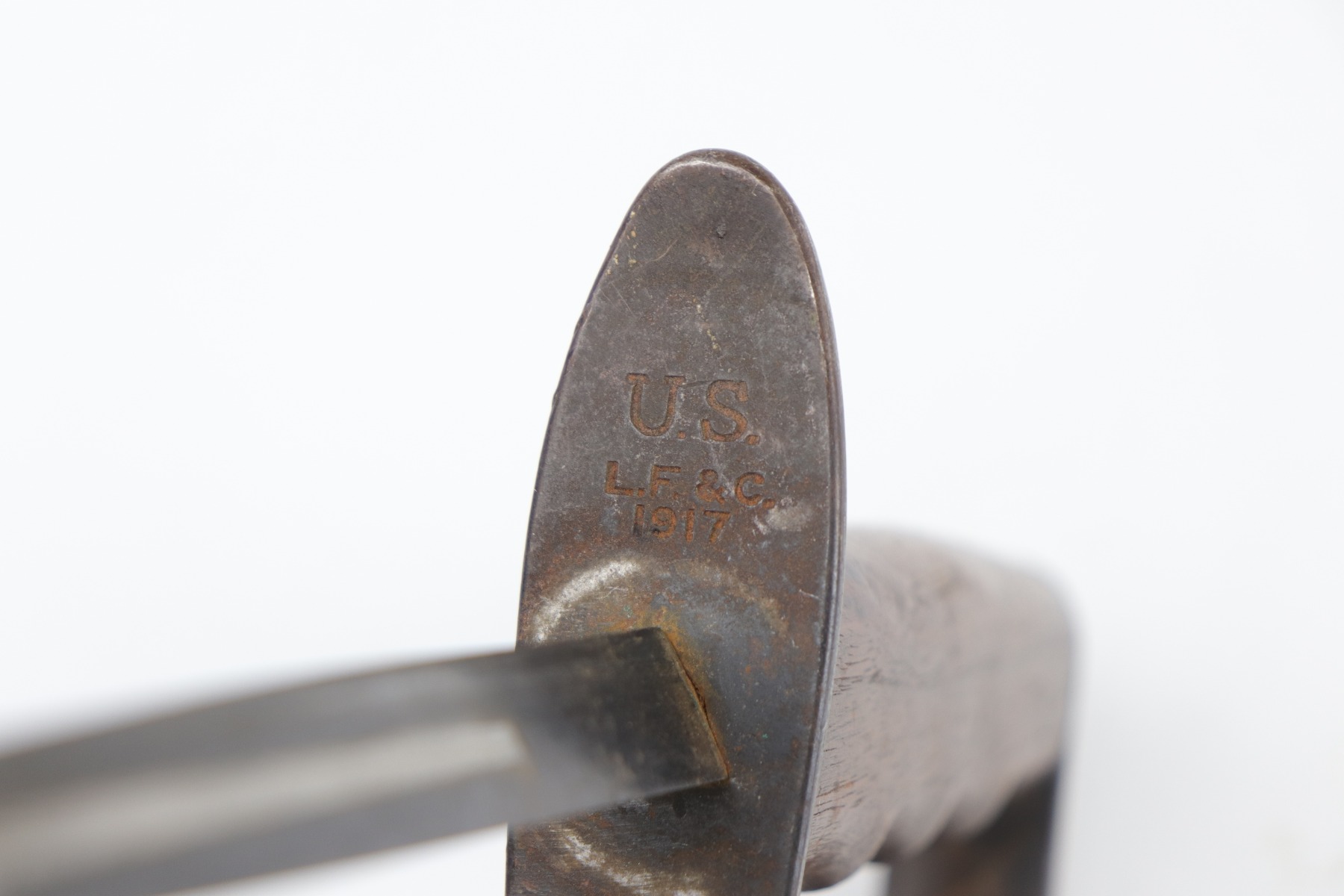 7/15/20 – This is an original WW1 Trench Fighting Knife in its original scabbard. The knife is dated 1917 and marked “US” and “LF&C”. Most of the original bluing on the blade is in tact but there are streaks of wear on each side of the blade. There is patina and light rust on the handle. The wood is in excellent condition. Unfortunately, the very tip of the blade is broken off. The scabbard is marked “M.S.” and “HE”. It is in good condition but there is patina on the metal parts throughout. There are scuff marks on the leather throughout. The tip is a little loose.